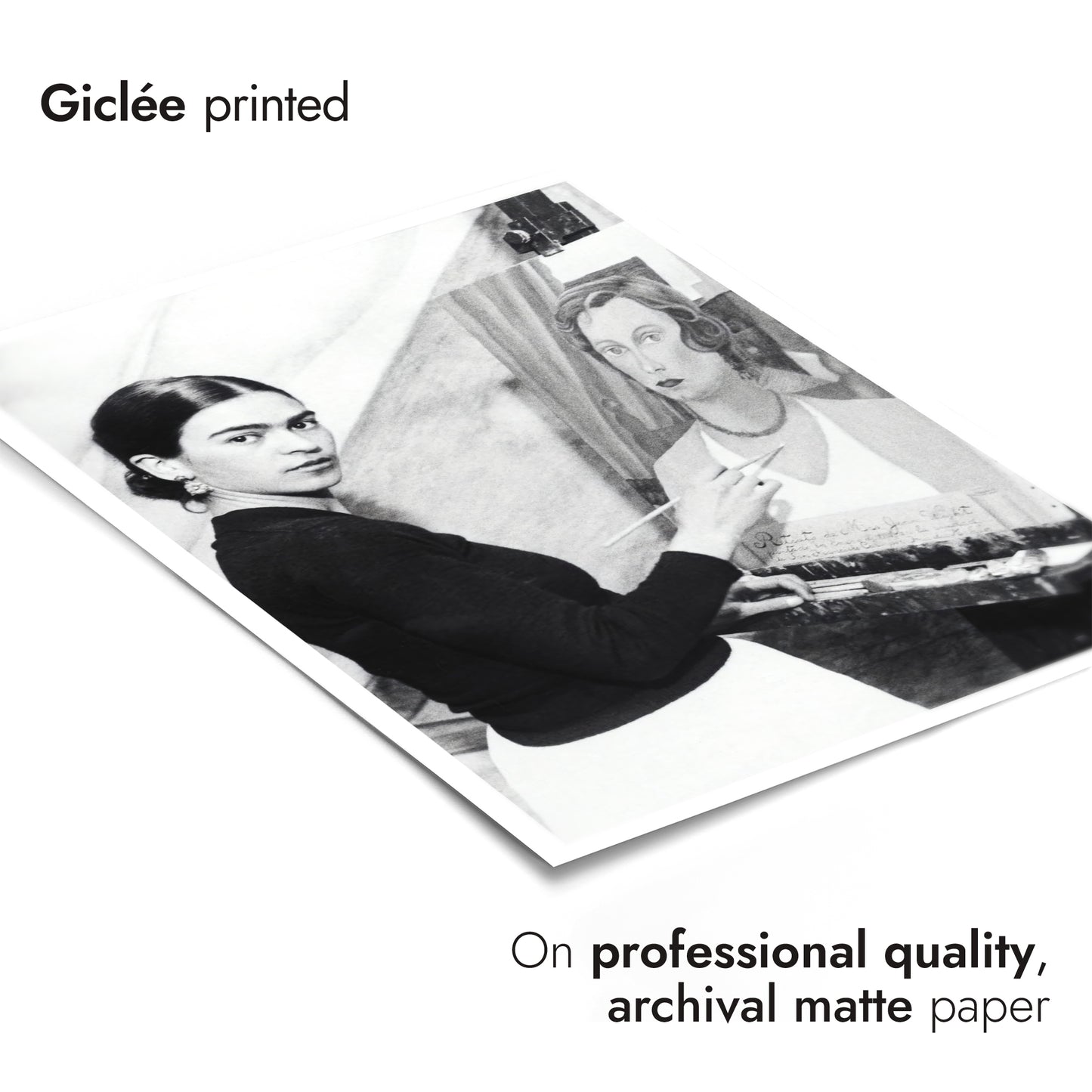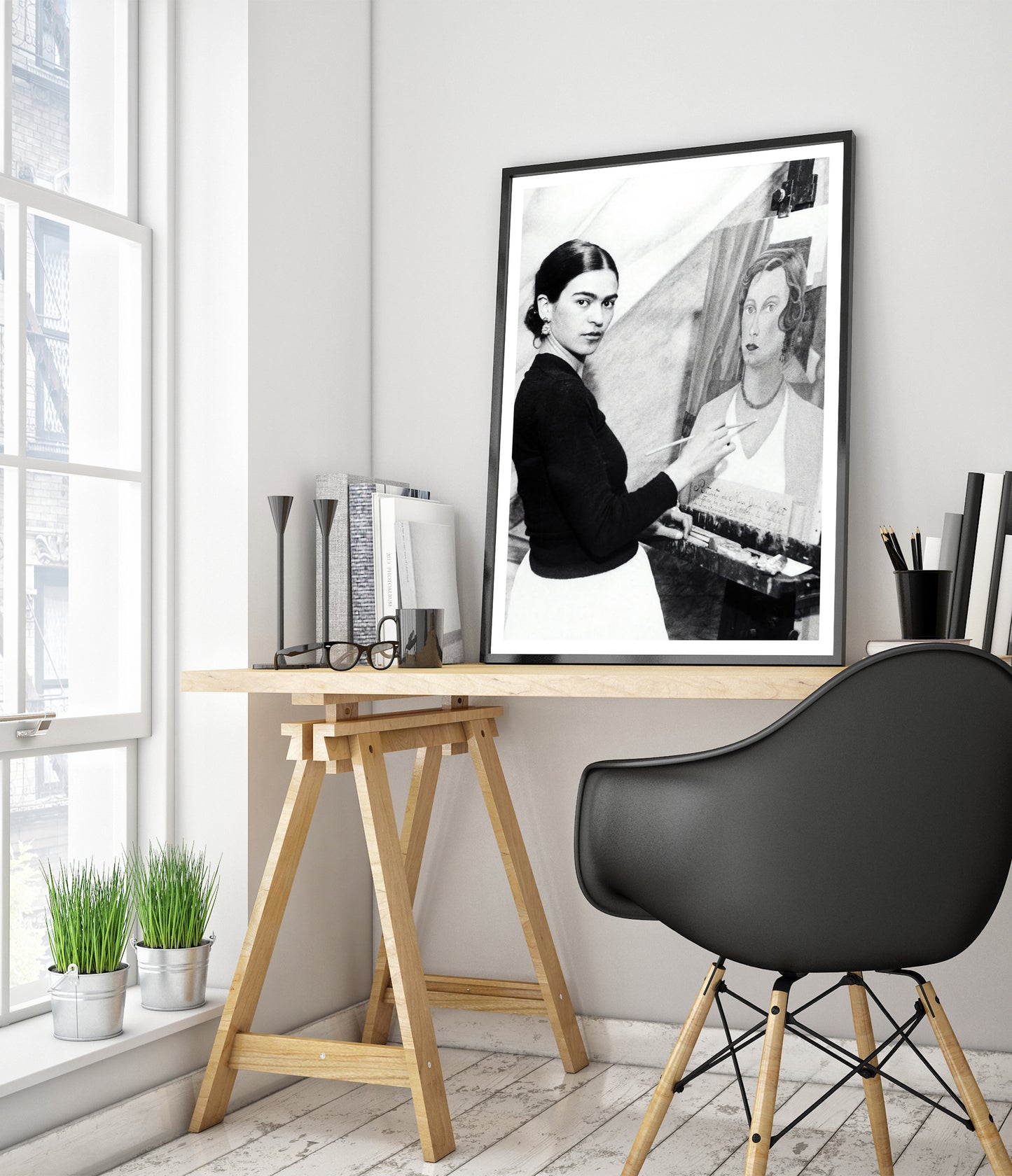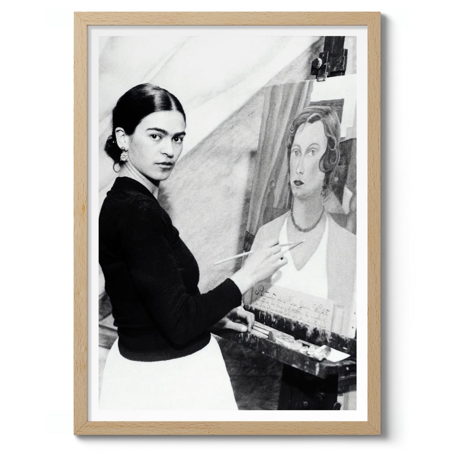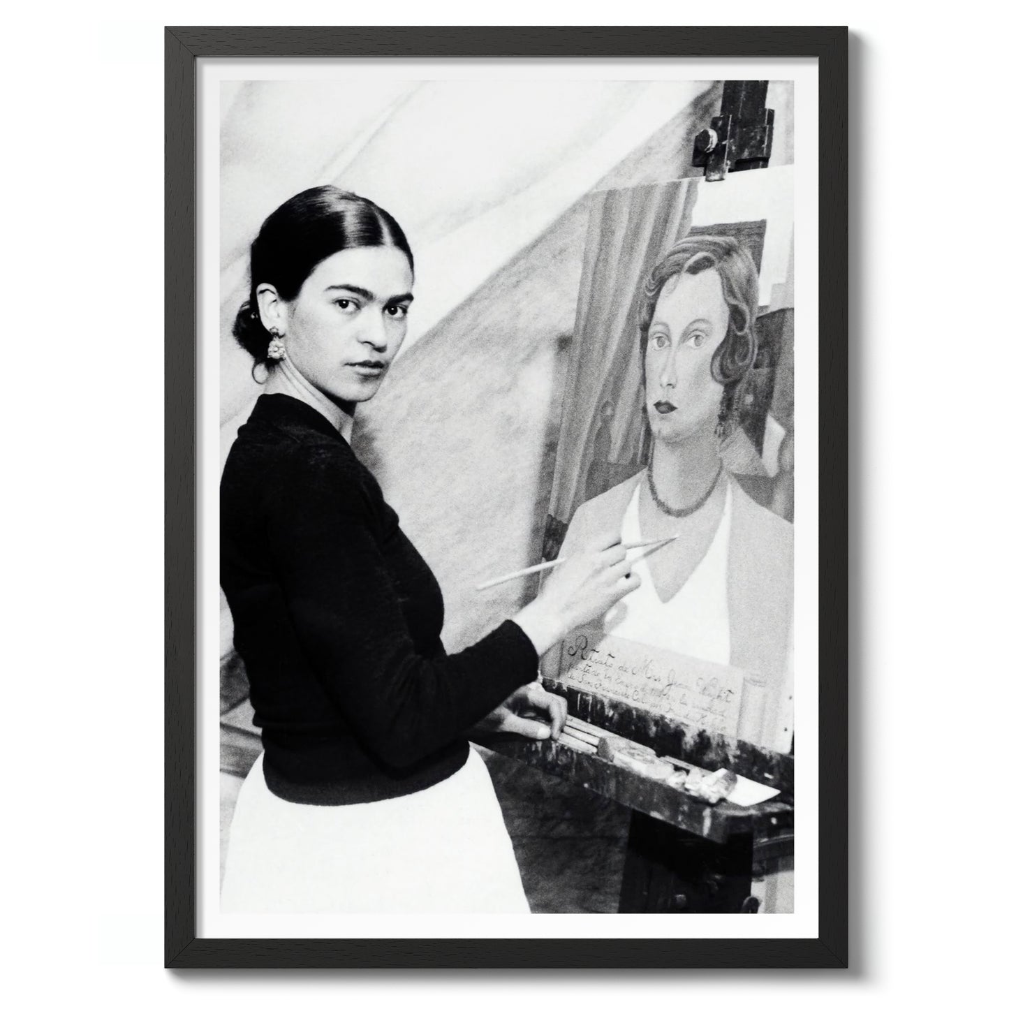 This black and white poster captures Frida Kahlo in the midst of painting, providing a striking glimpse into the life of the iconic artist. With a poised expression and painter's brush in hand, the image highlights Kahlo's intense focus and dedication to her craft. Perfect for admirers of Frida Kahlo and photographic art enthusiasts looking to add a historic touch to their space.
