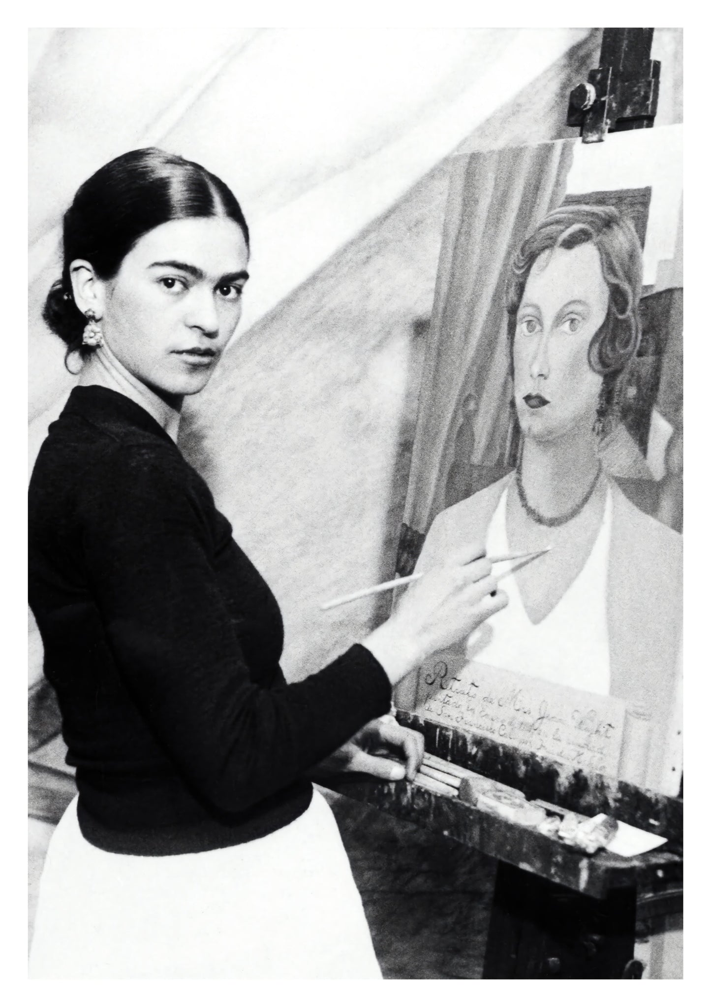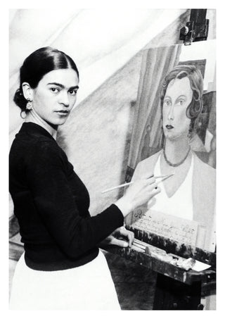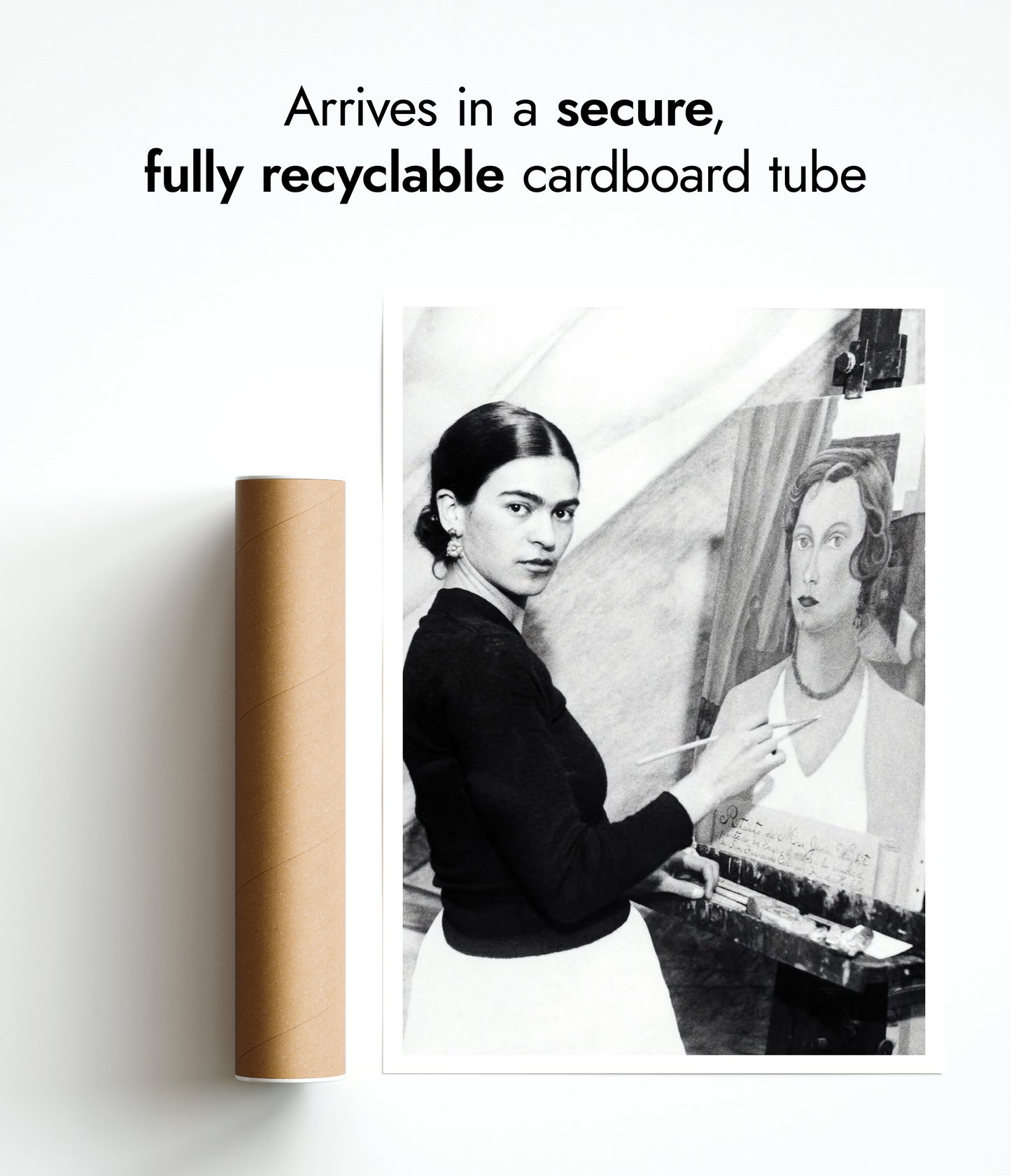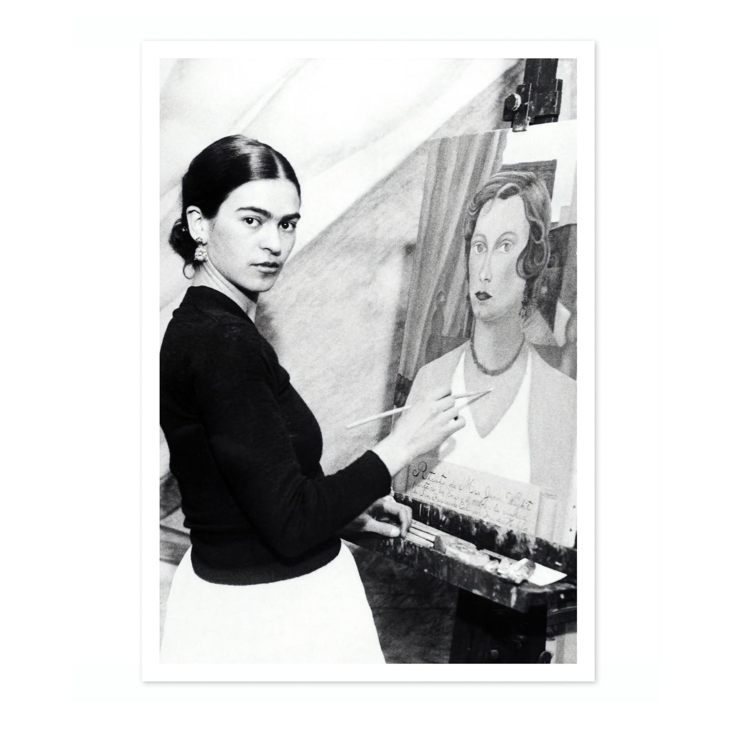 This black and white poster captures Frida Kahlo in the midst of painting, providing a striking glimpse into the life of the iconic artist. With a poised expression and painter's brush in hand, the image highlights Kahlo's intense focus and dedication to her craft. Perfect for admirers of Frida Kahlo and photographic art enthusiasts looking to add a historic touch to their space.