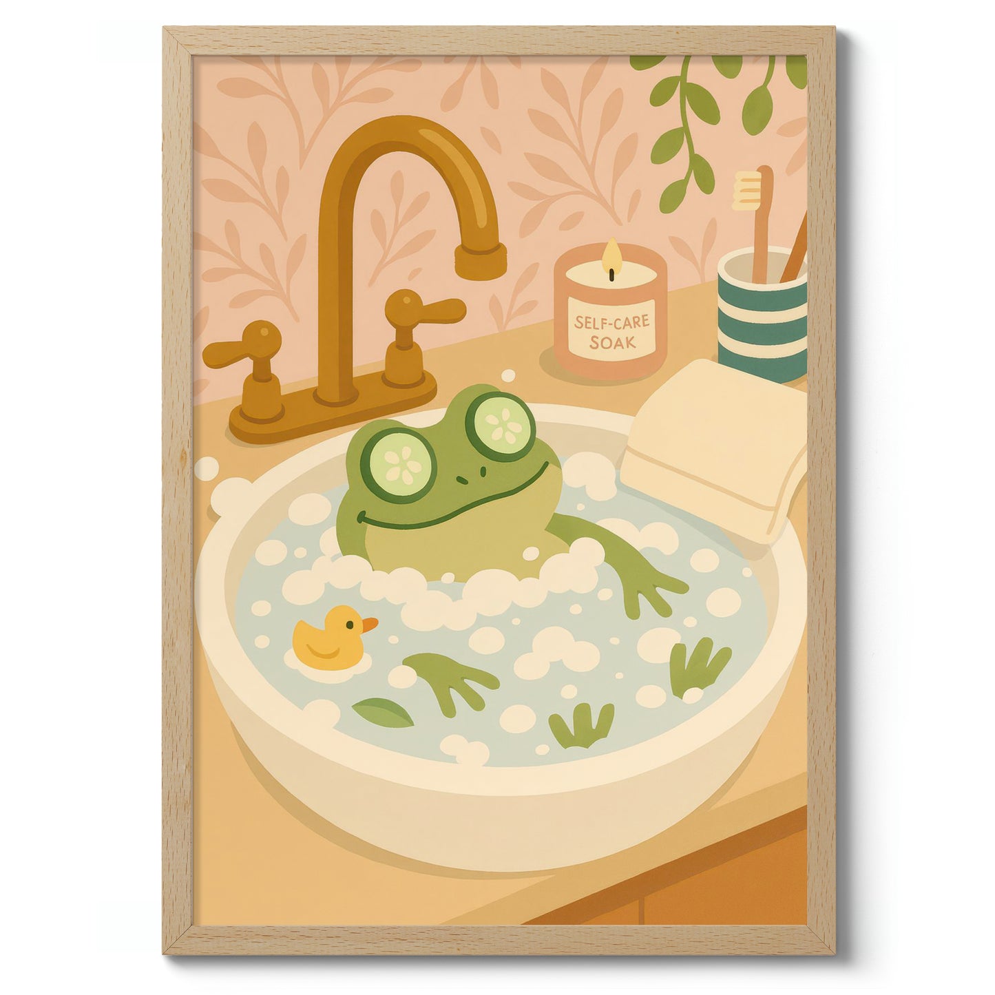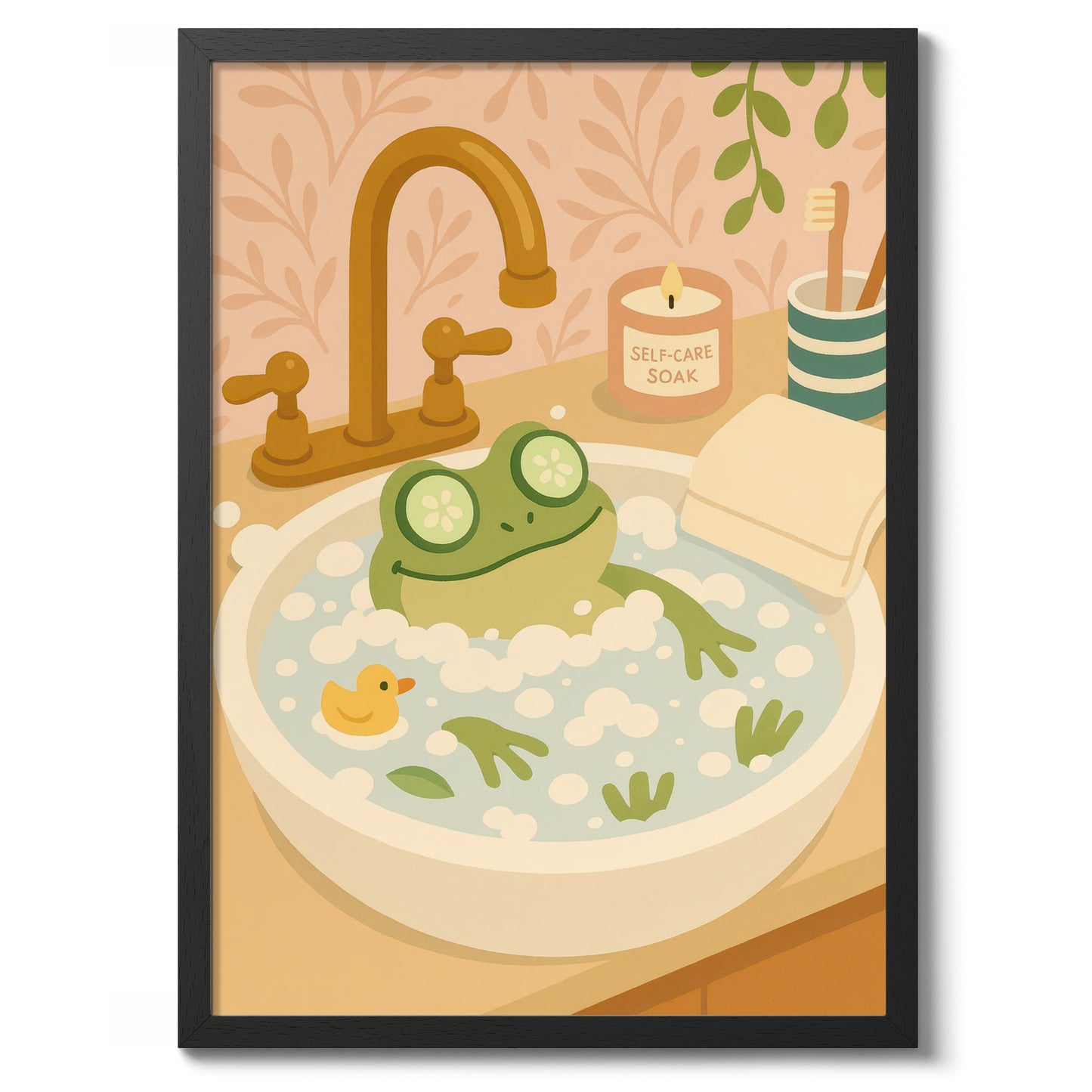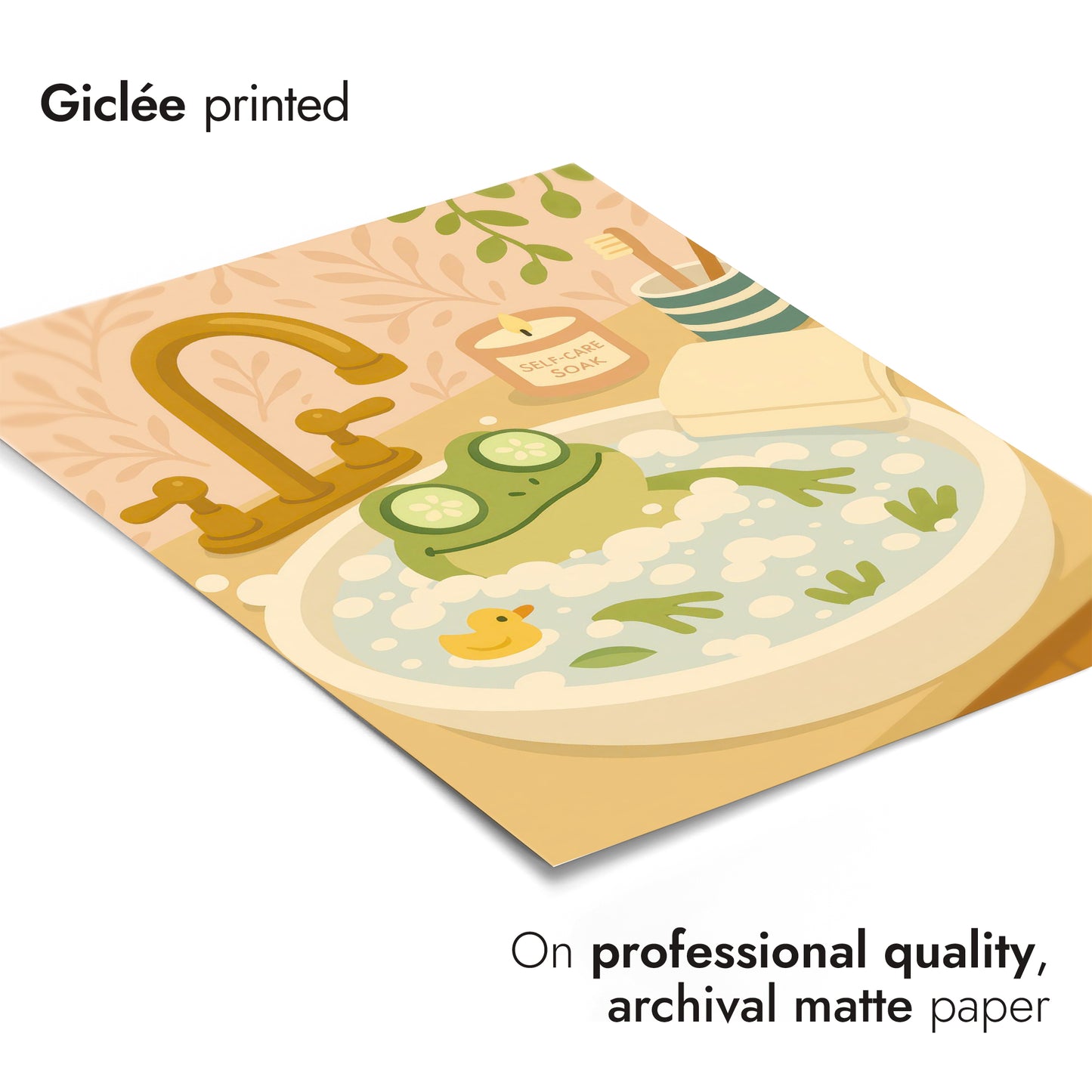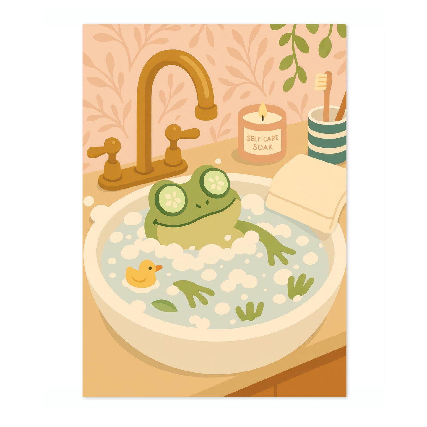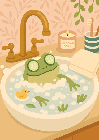 The "Frog Bath" poster showcases a cheerful cartoon frog luxuriating in a foamy bath, complete with cucumber slices over its eyes. Set in a whimsical bathroom scene, with a rubber duck and a "self-care soak" candle, it exudes a playful vibe. Perfect for adding a touch of humor and charm to any bathroom decor.