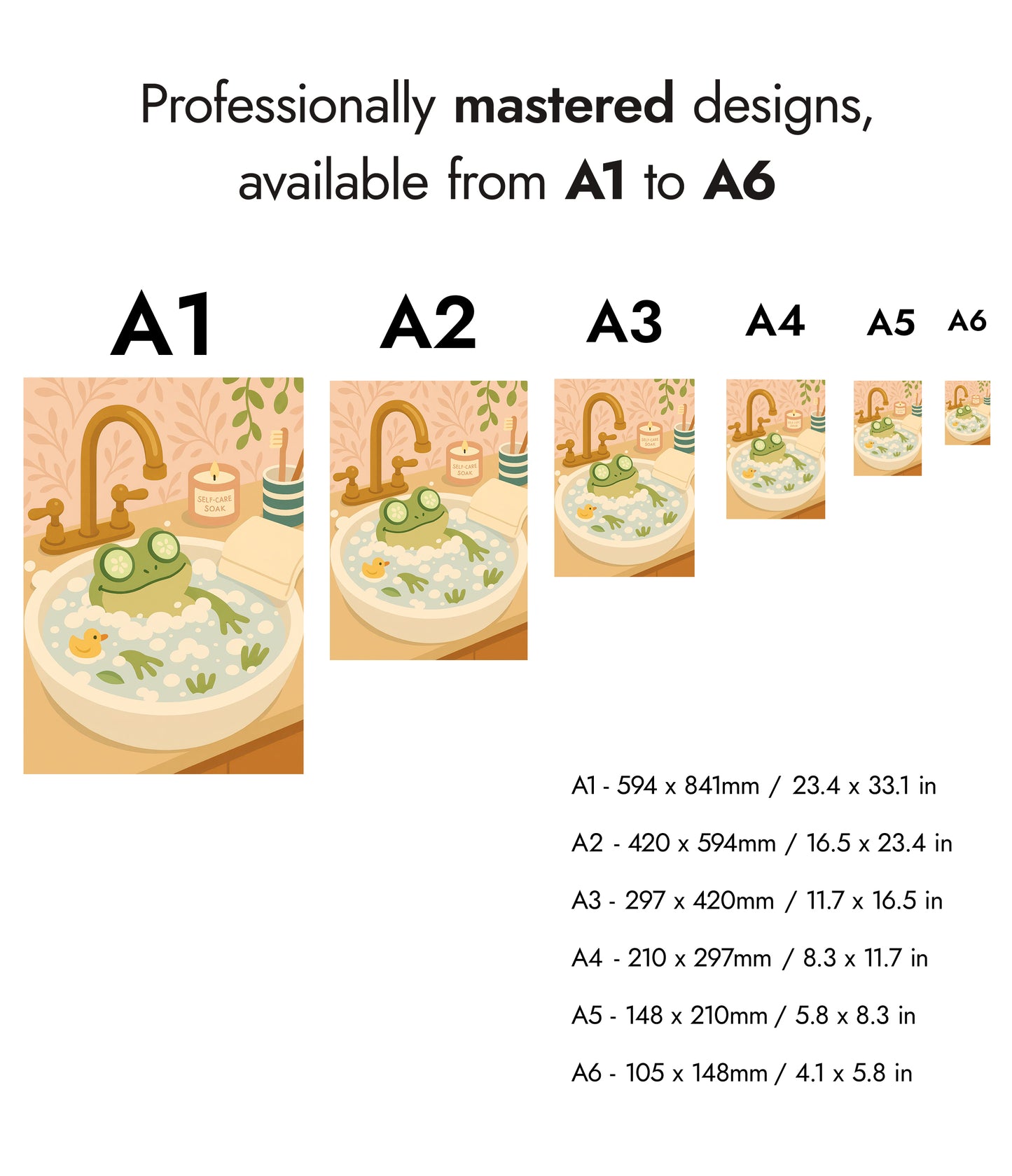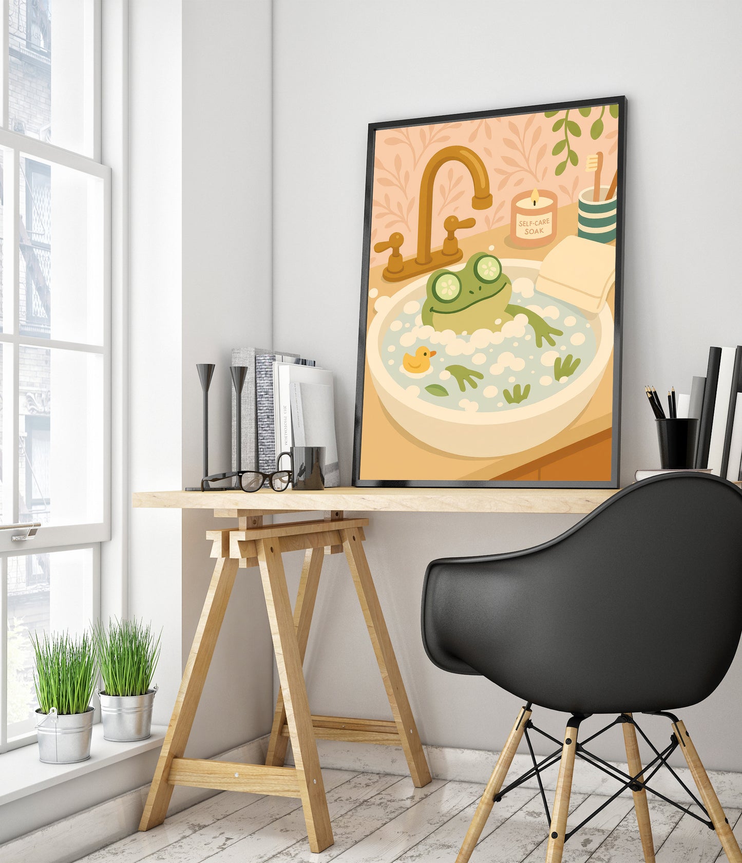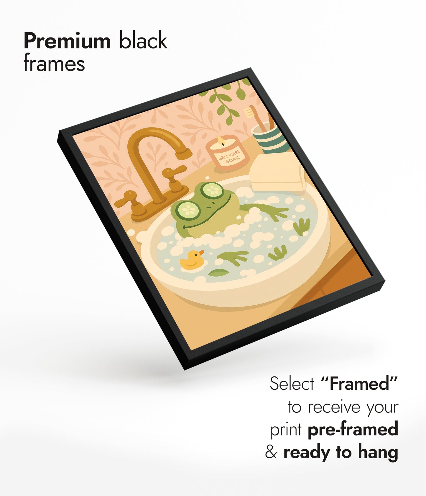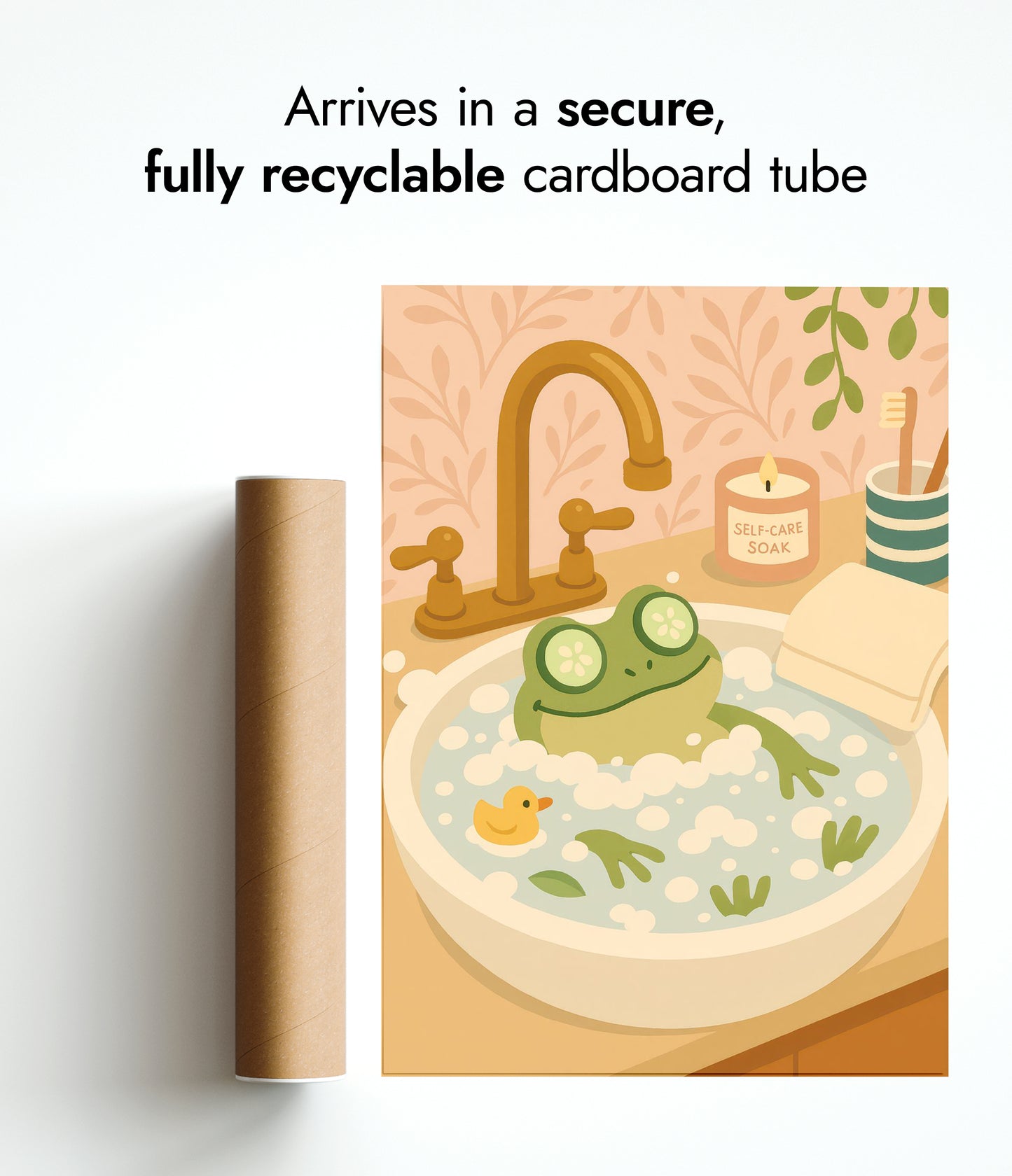 The "Frog Bath" poster showcases a cheerful cartoon frog luxuriating in a foamy bath, complete with cucumber slices over its eyes. Set in a whimsical bathroom scene, with a rubber duck and a "self-care soak" candle, it exudes a playful vibe. Perfect for adding a touch of humor and charm to any bathroom decor.