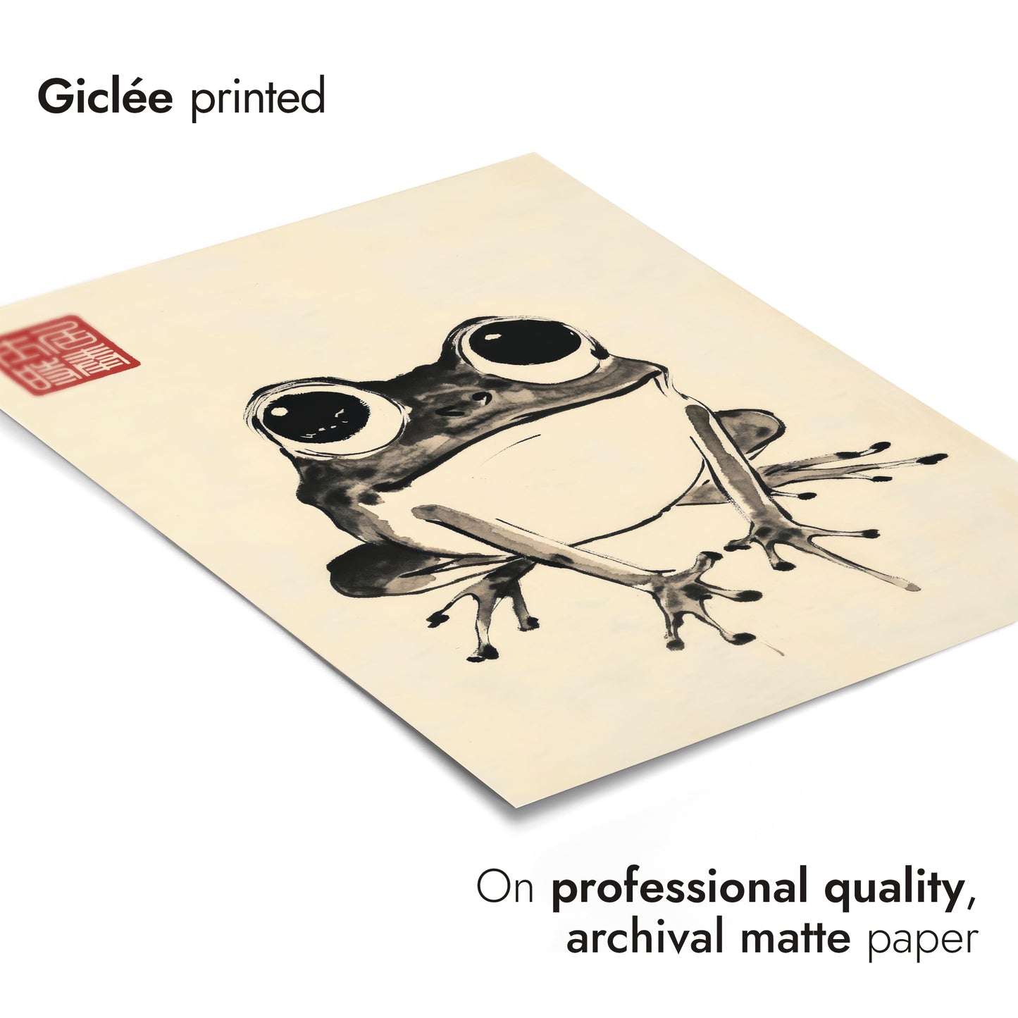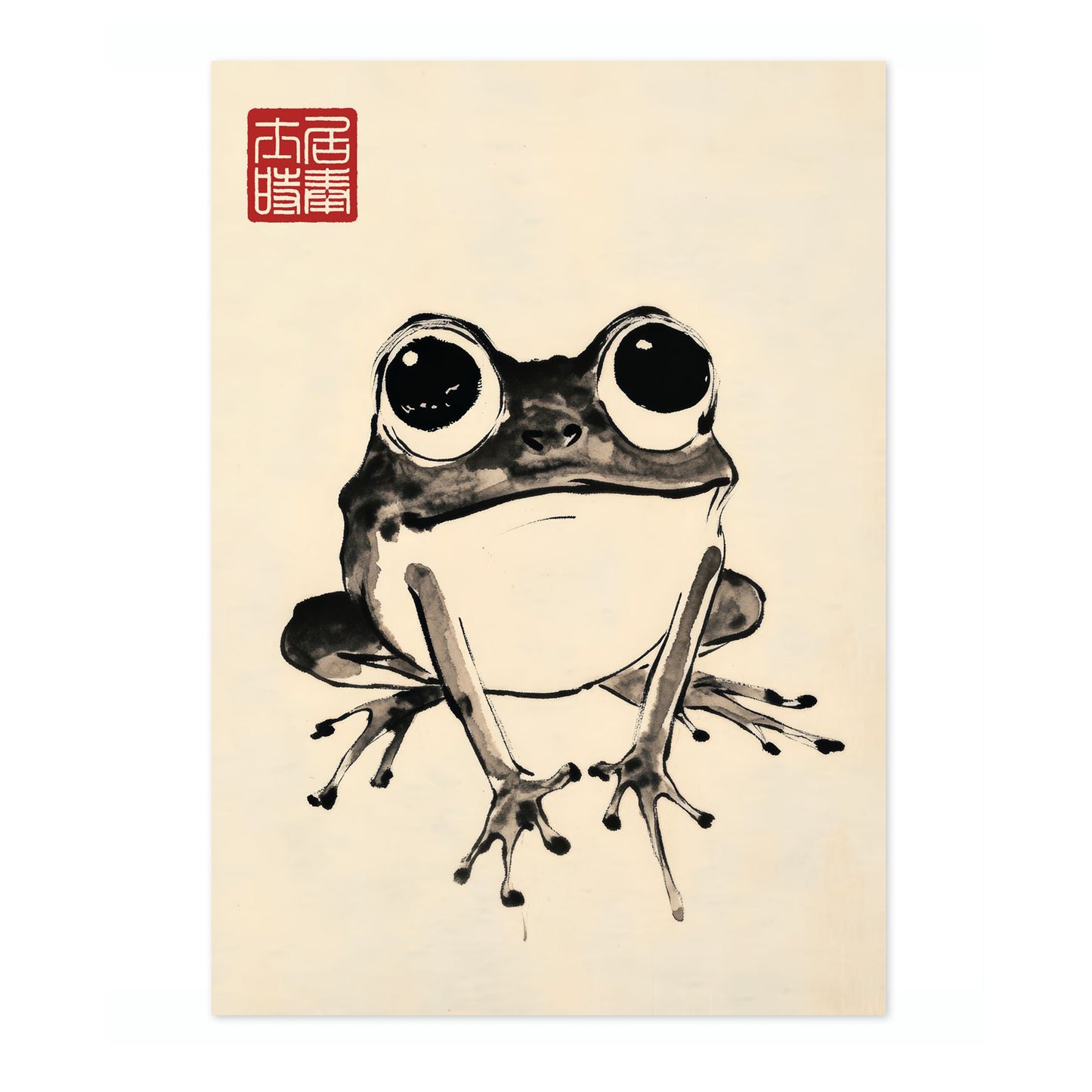 This "Frog II" poster captures the playful essence of a frog in traditional Japanese Sumi-E style by artist Matsumoto Hoji. The minimalist ink strokes highlight the amphibian's wide, curious eyes against a subtle beige backdrop, accented by a classic red seal. Ideal for nature and animal art enthusiasts seeking a touch of Japanese charm in their decor.
