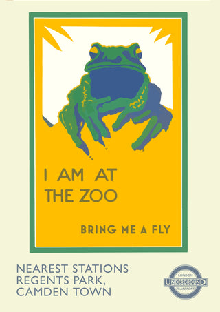 This vintage-style poster, "Frog, London Zoo," features a bold illustration of a vibrant green and yellow frog against a bright backdrop. The graphic captures a playful advertising theme, promoting the London Zoo with the whimsical phrase, "I am at the Zoo, bring me a fly." Ideal for lovers of zoo-themed art and retro design.