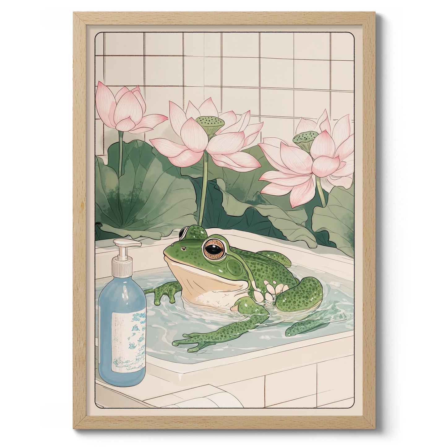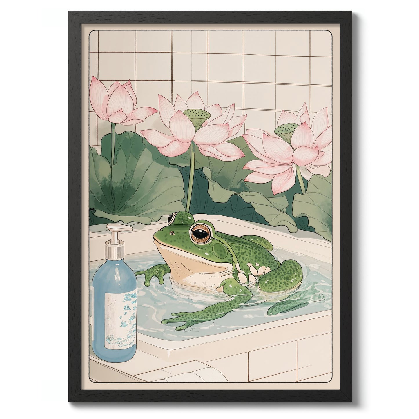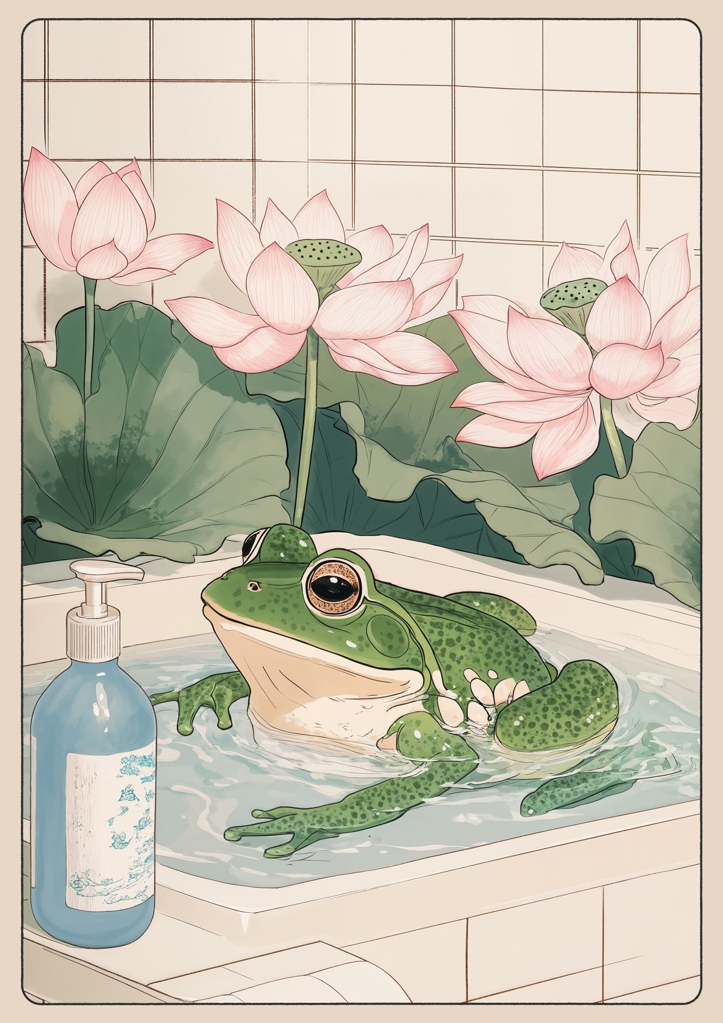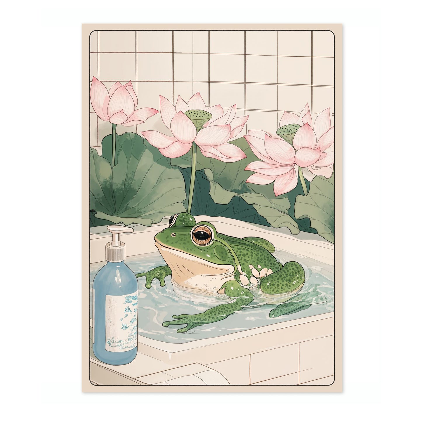 This "Frog & Lotus Bath" poster beautifully captures a serene moment featuring a whimsical green frog luxuriating in a bathtub, surrounded by elegant pink lotus flowers. This anime-style illustration evokes a sense of tranquility, with a soft beige palette and intricate details reminiscent of Japanese woodblock art. Perfect for adding a playful yet calming ambiance to any space.