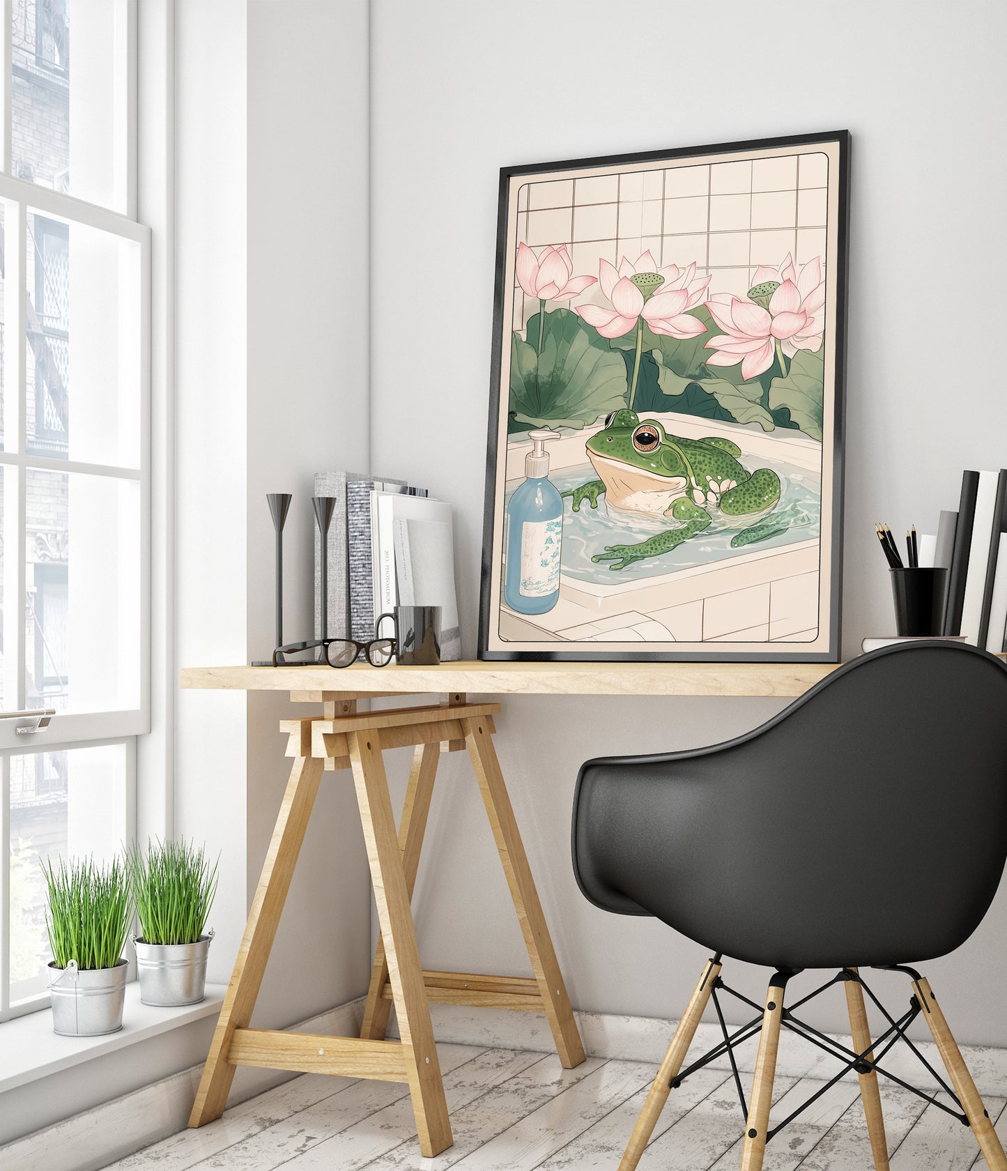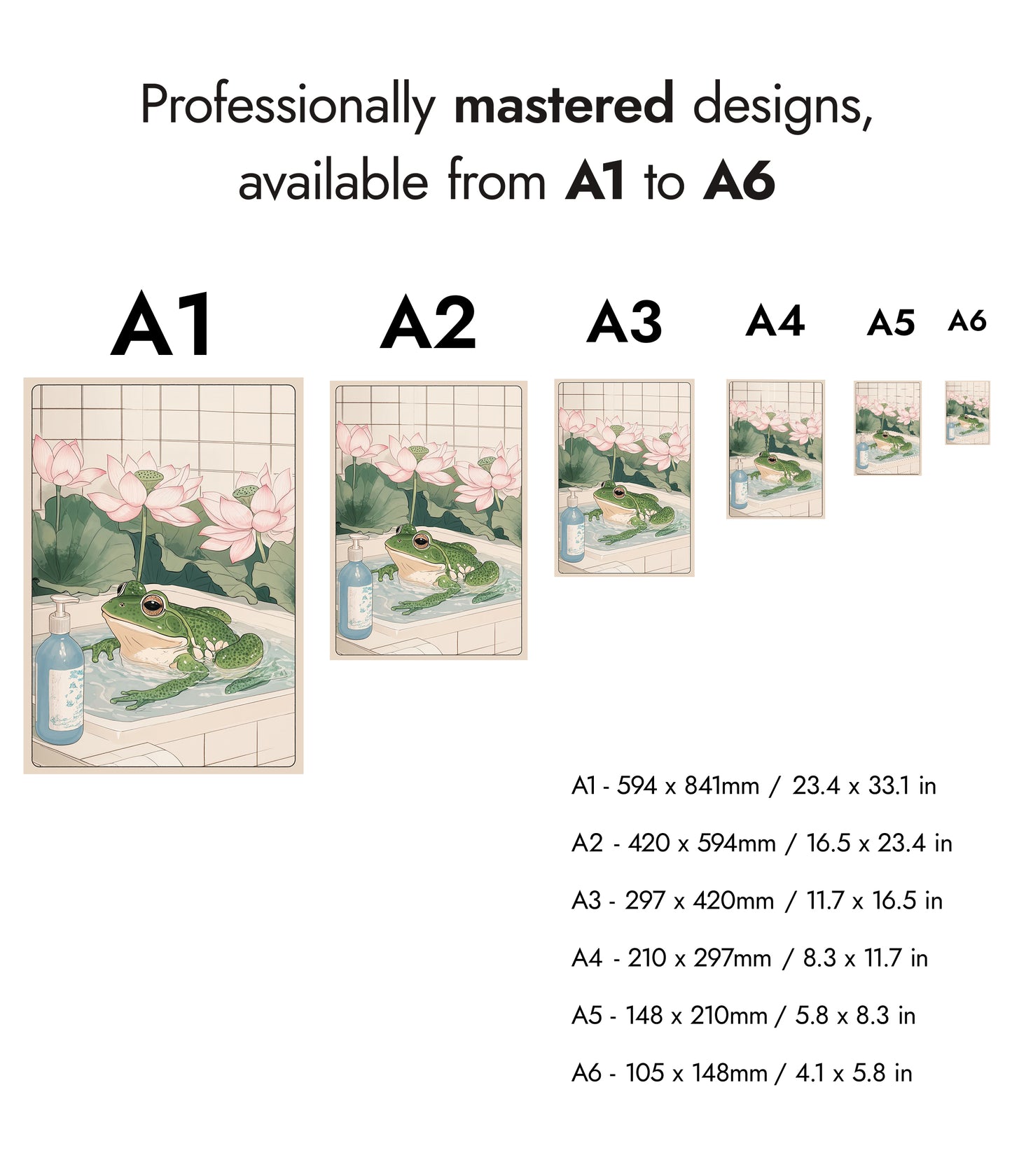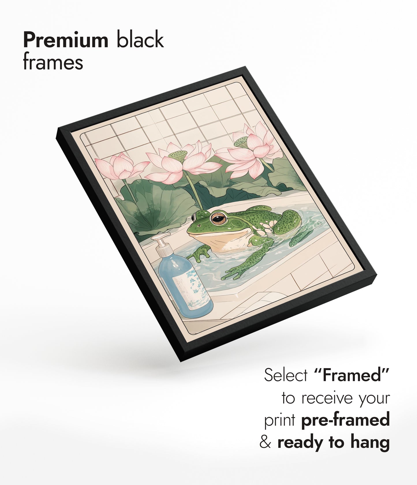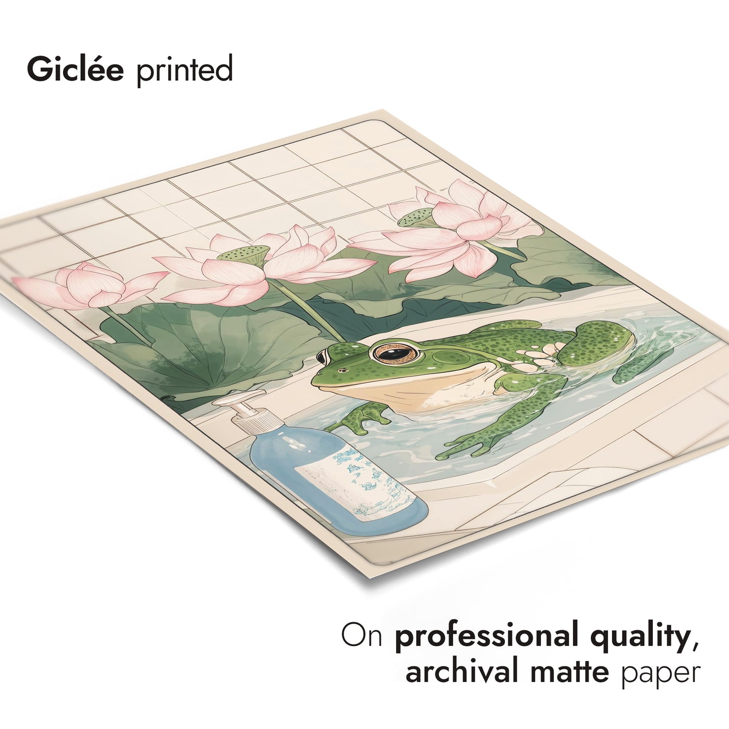 This "Frog & Lotus Bath" poster beautifully captures a serene moment featuring a whimsical green frog luxuriating in a bathtub, surrounded by elegant pink lotus flowers. This anime-style illustration evokes a sense of tranquility, with a soft beige palette and intricate details reminiscent of Japanese woodblock art. Perfect for adding a playful yet calming ambiance to any space.