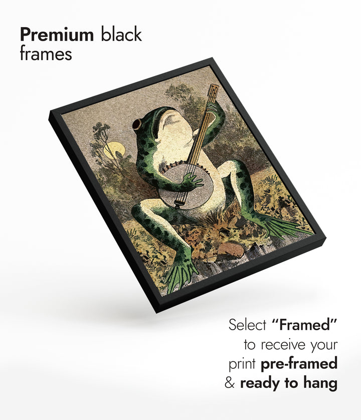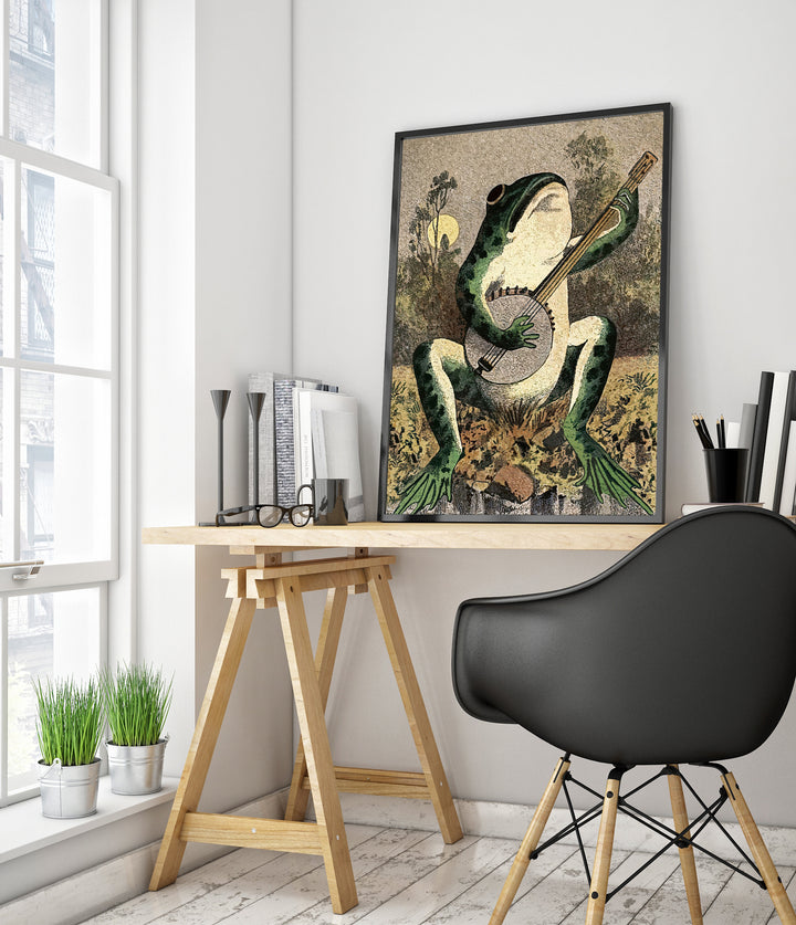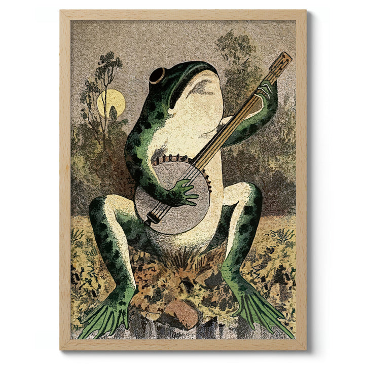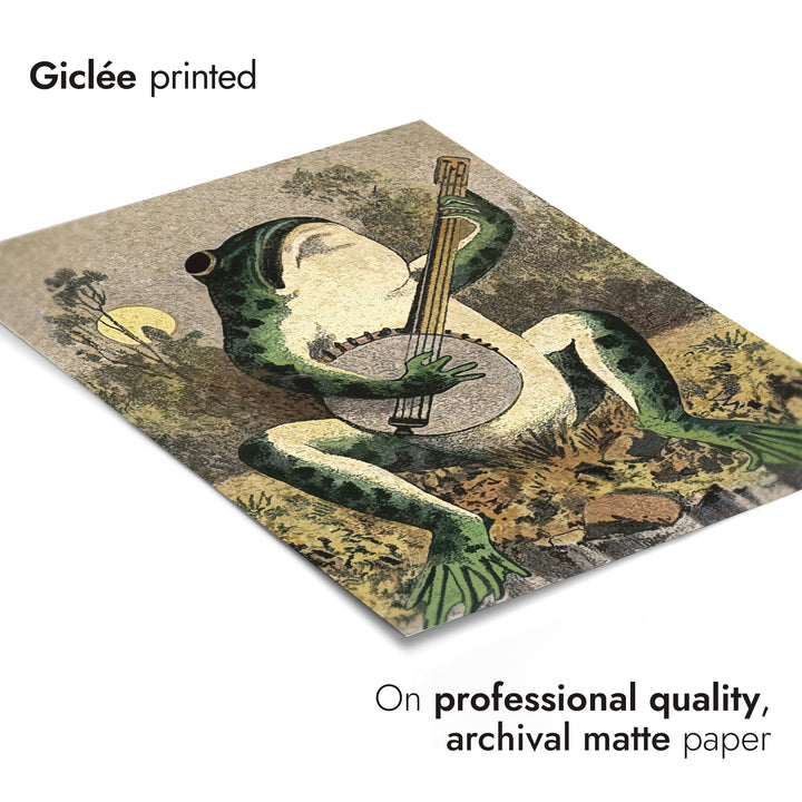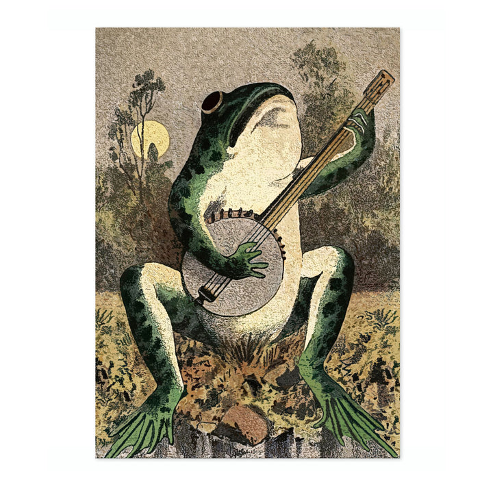 The "Frog Playing Banjo" poster showcases a whimsical illustration of a frog perched with a banjo against a backdrop illuminated by a full moon. This vintage-inspired artwork merges nature and music themes, featuring detailed textures and earthy tones. Ideal for adding a touch of charm and nostalgia to any space.