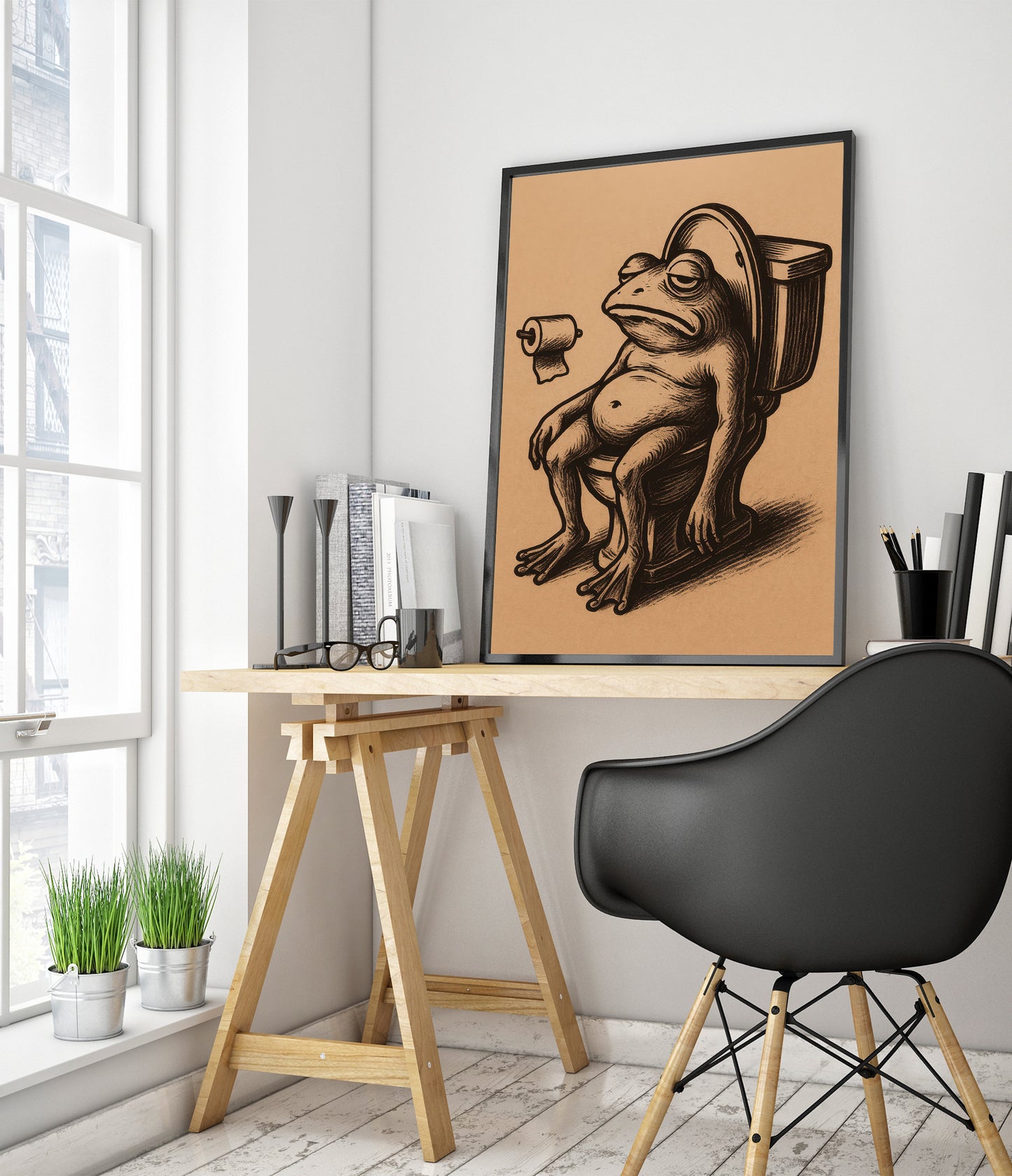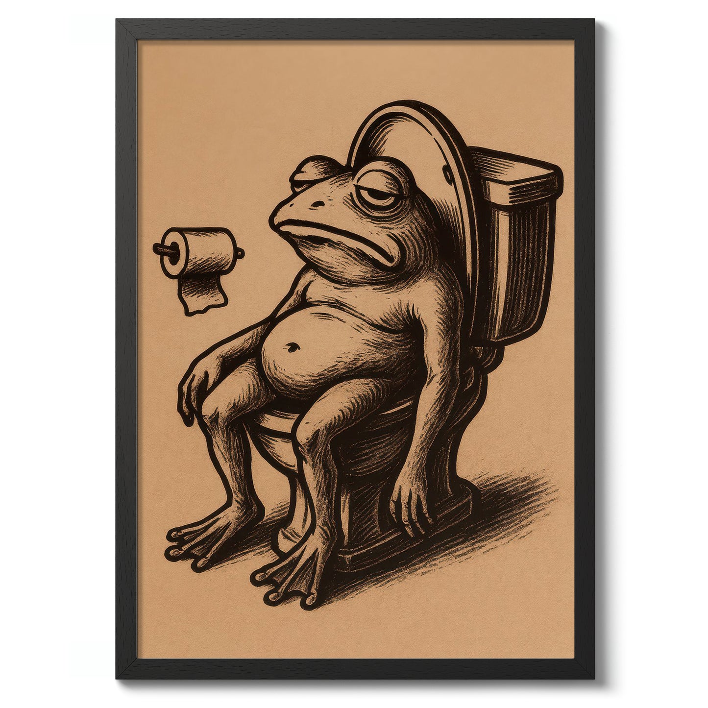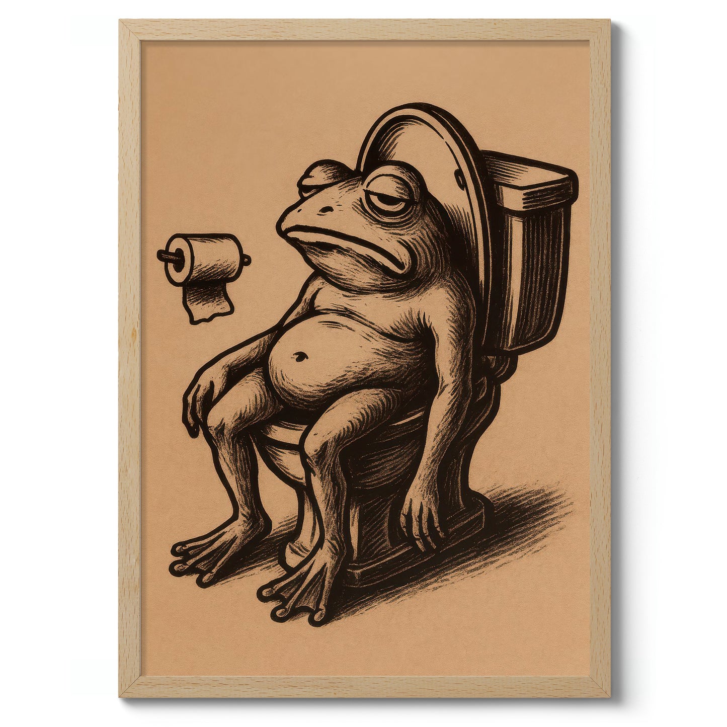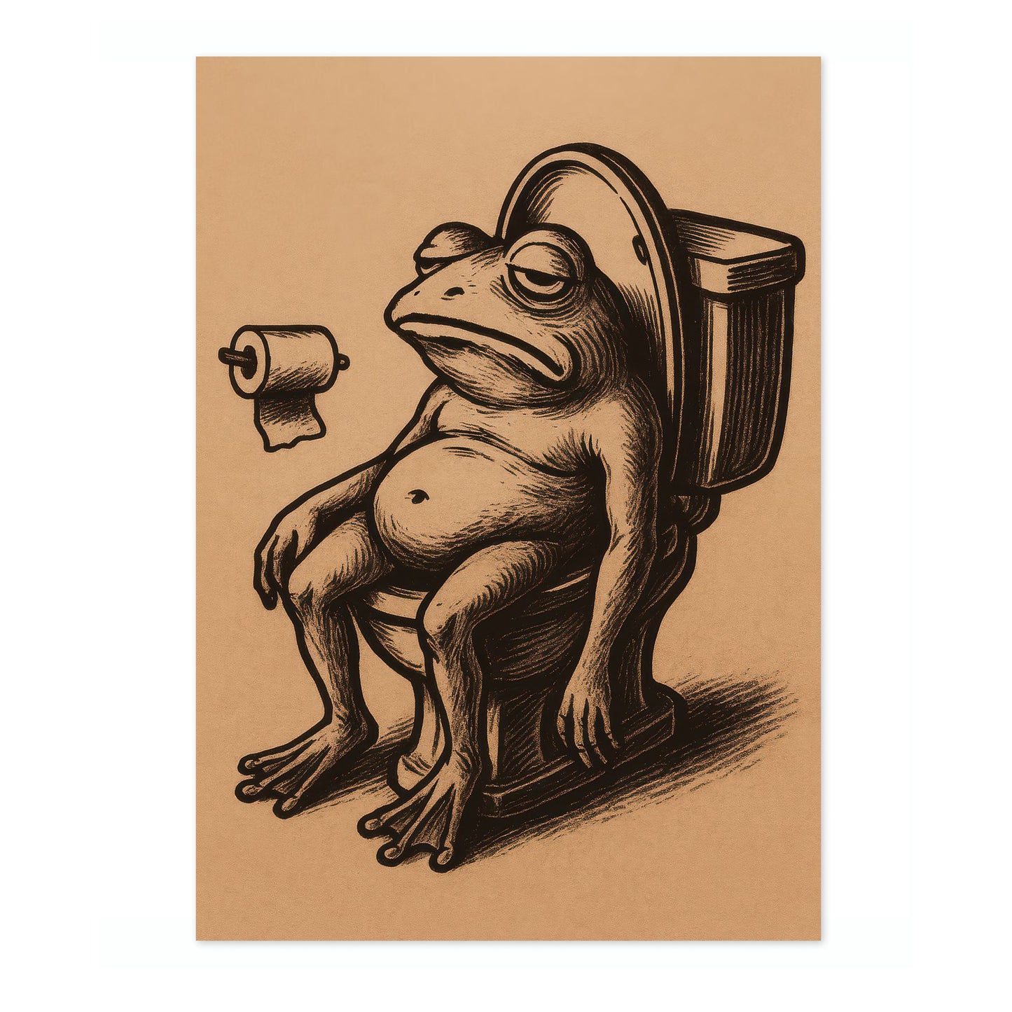 This illustration poster features a humorously detailed frog sitting on a toilet, depicted in shades of beige. The expressive amphibian, with a relaxed yet contemplative demeanor, adds a whimsical touch to bathroom-themed decor. The minimalist backdrop highlights the quirky elements, including the subtle details of the toilet and toilet paper, making it an eye-catching addition to any space.