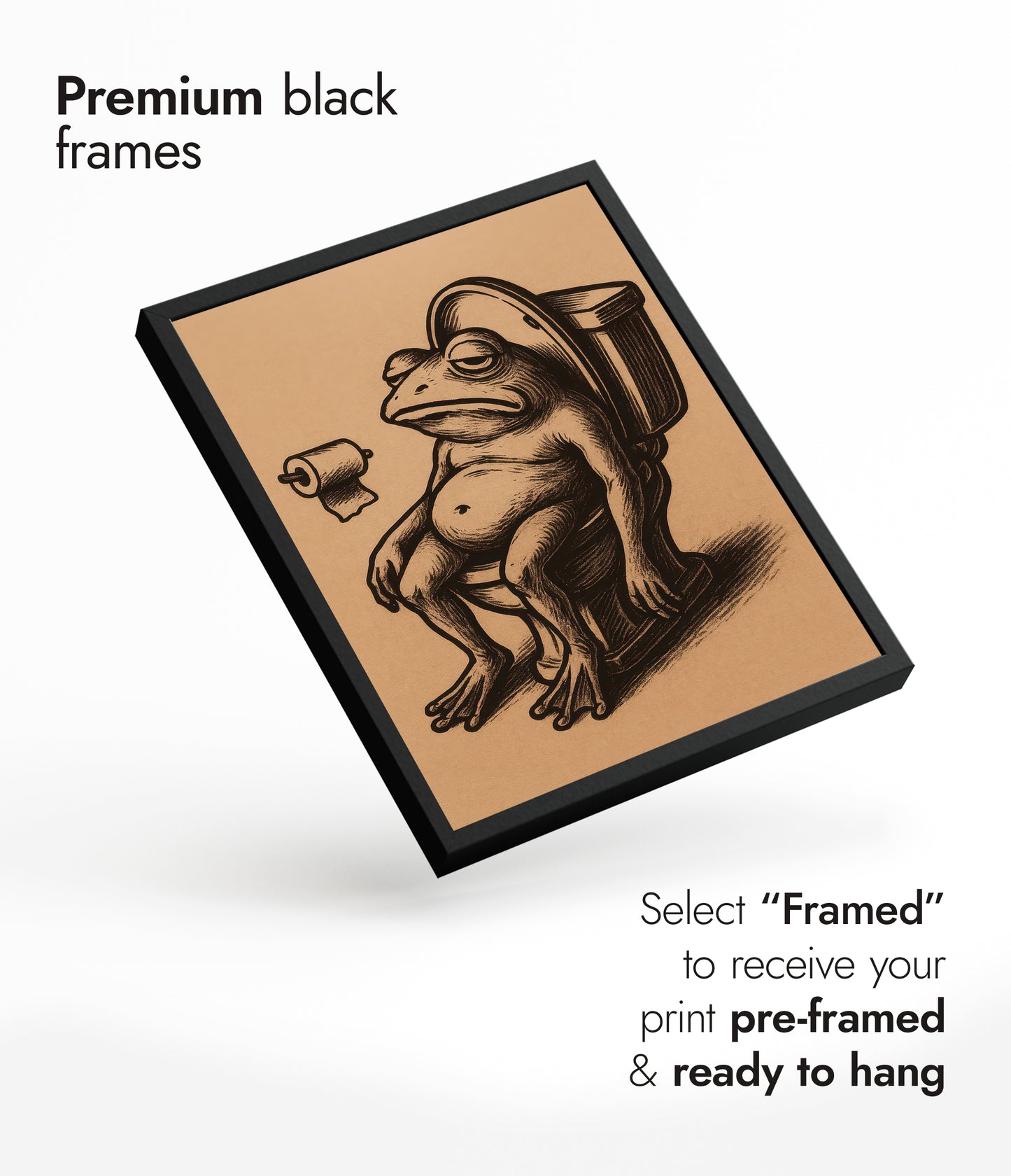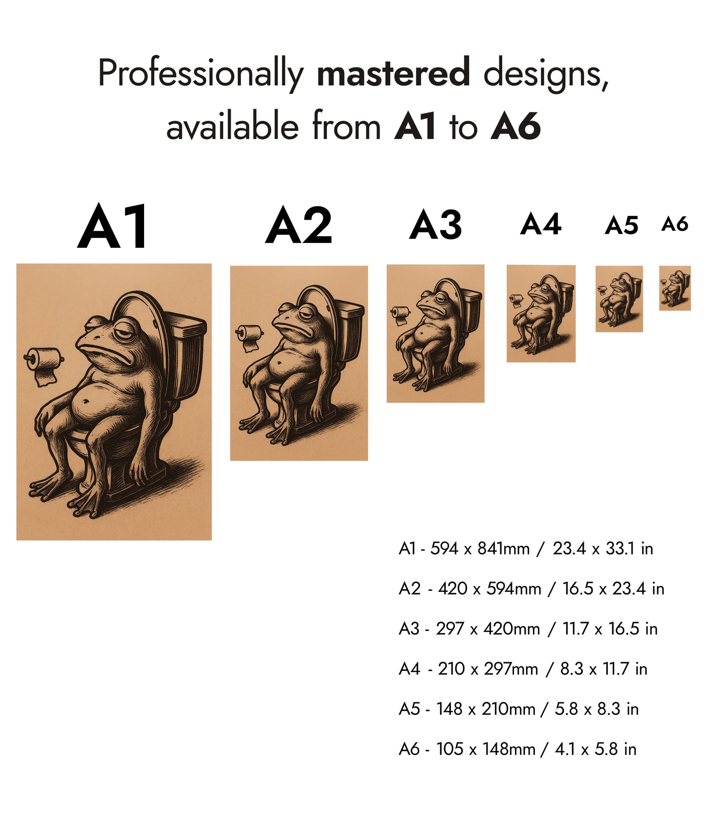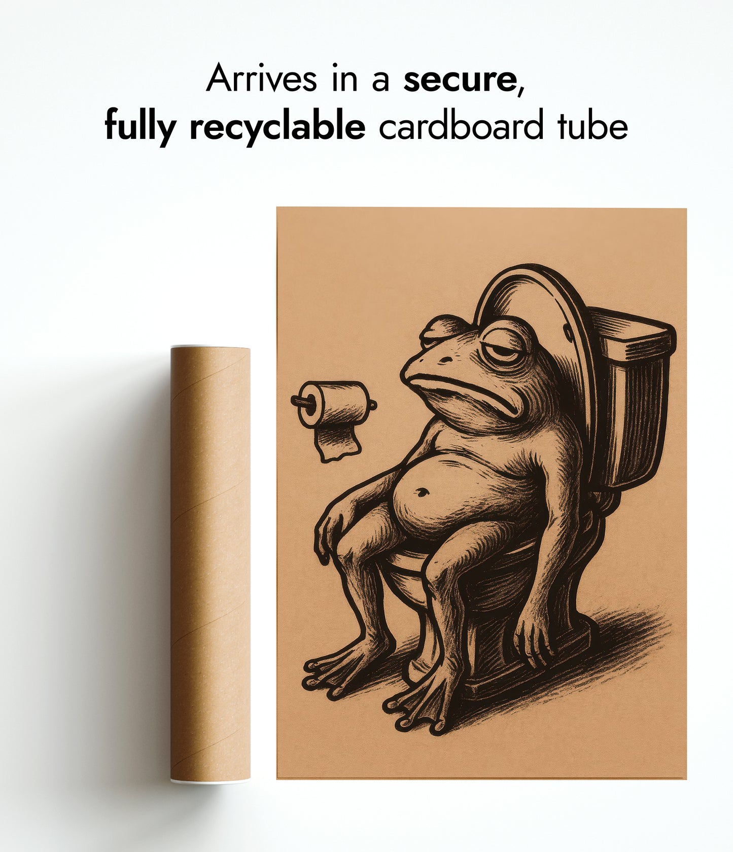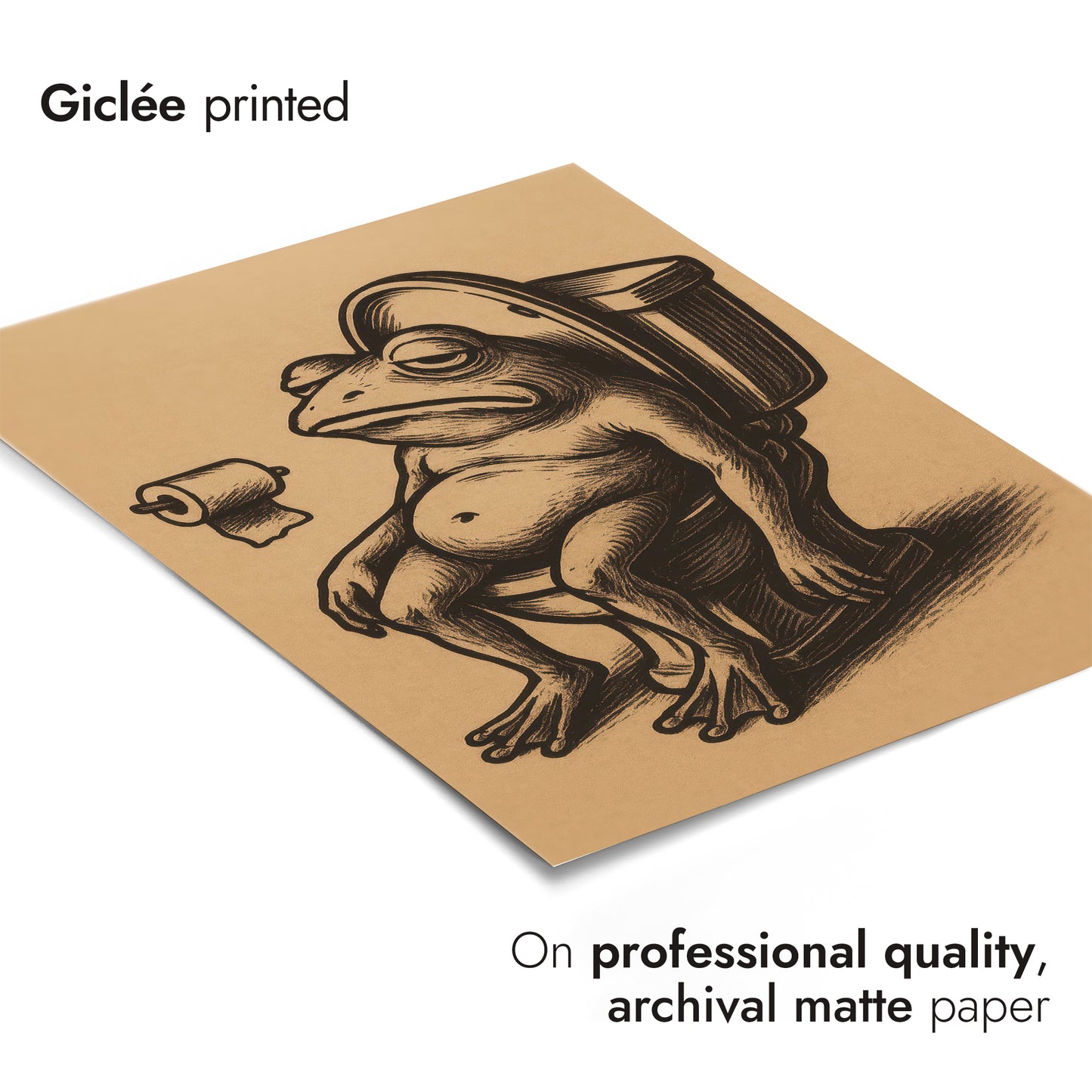 This illustration poster features a humorously detailed frog sitting on a toilet, depicted in shades of beige. The expressive amphibian, with a relaxed yet contemplative demeanor, adds a whimsical touch to bathroom-themed decor. The minimalist backdrop highlights the quirky elements, including the subtle details of the toilet and toilet paper, making it an eye-catching addition to any space.