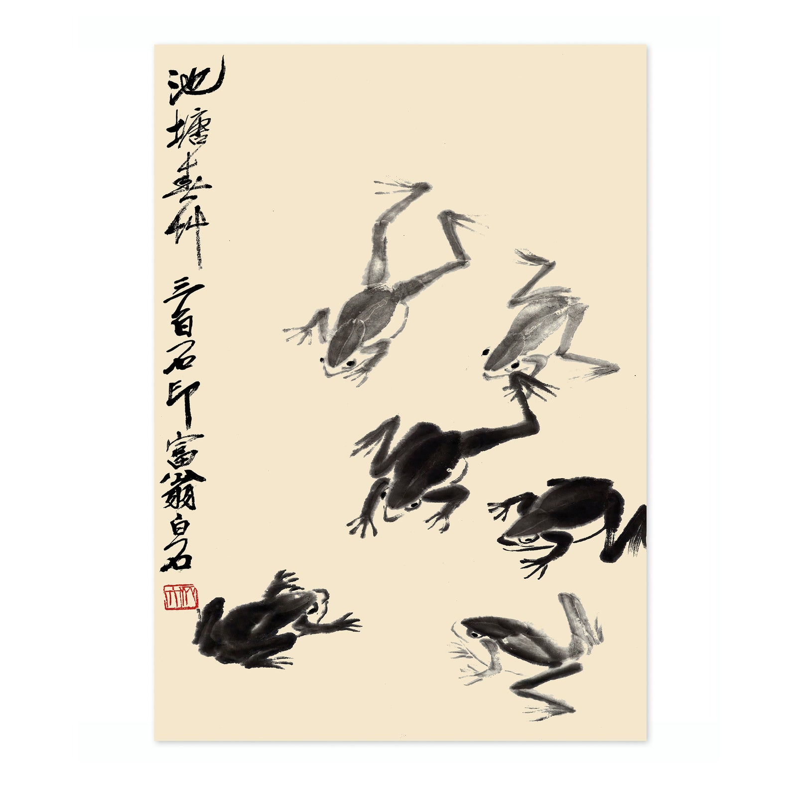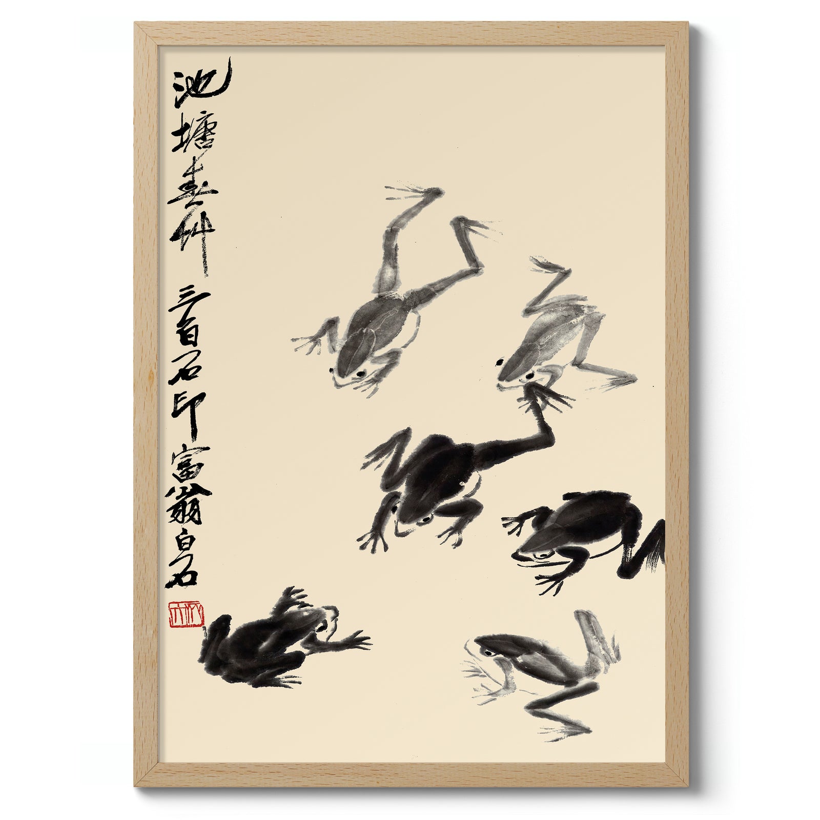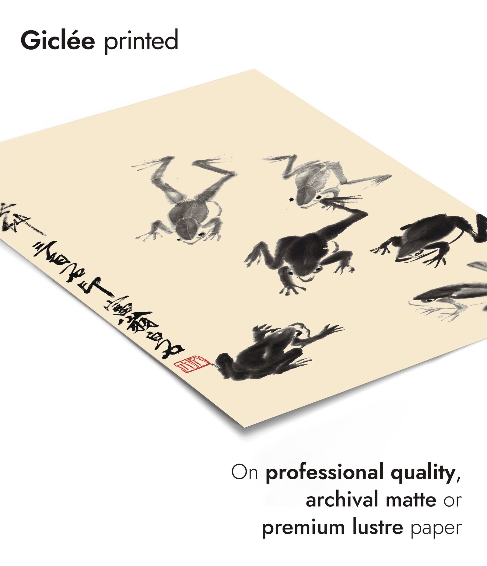 This traditional Japanese poster titled "Frogs" by Matsumoto Hoji captures the playful essence of nature with minimalist Sumi-E brush strokes. The artwork features five animated frogs in various dynamic poses, creating a lively and humorous portrayal. The muted tones and stark lines reflect traditional Japanese art, perfect for adding a touch of nature-inspired elegance to any space.