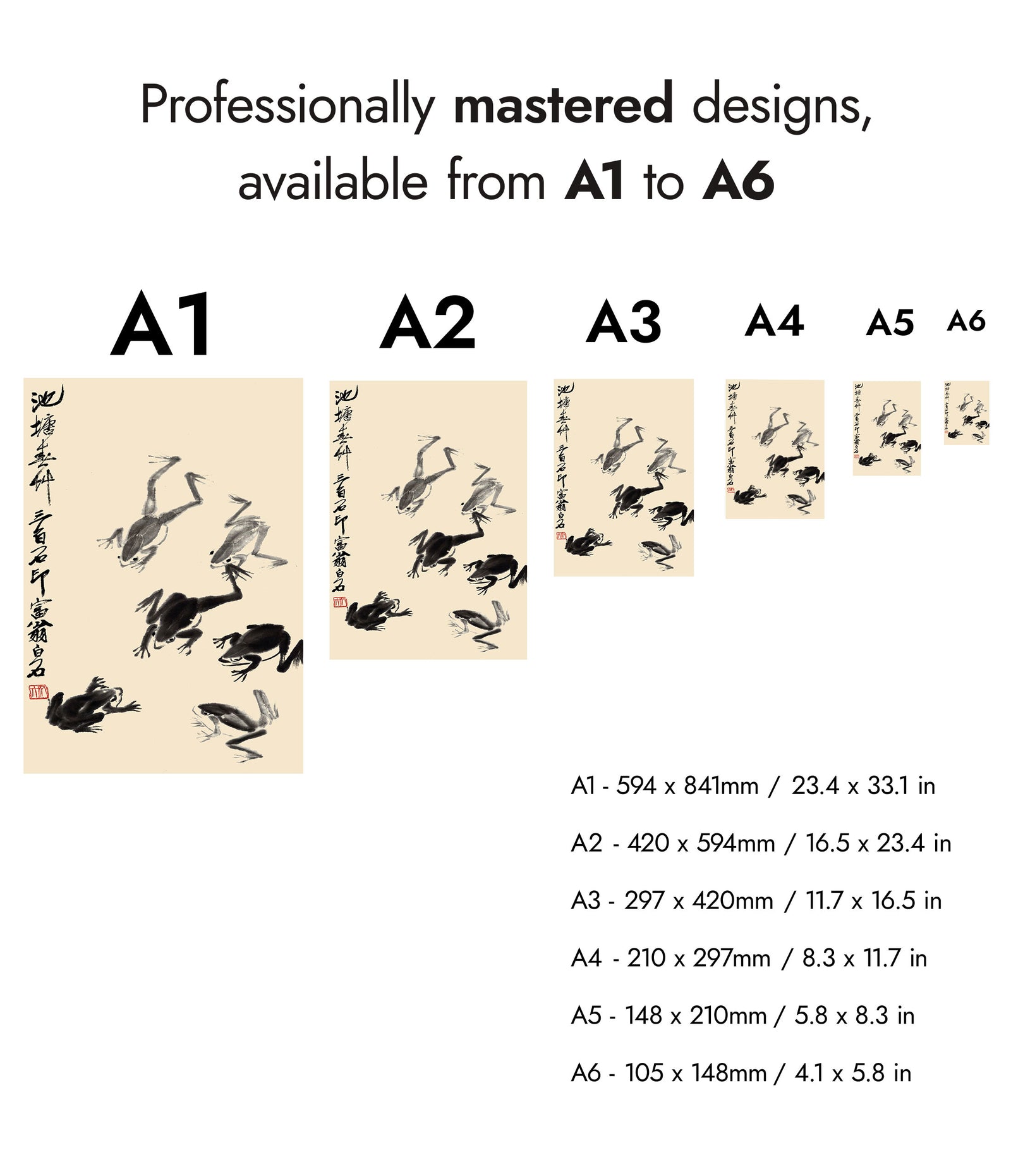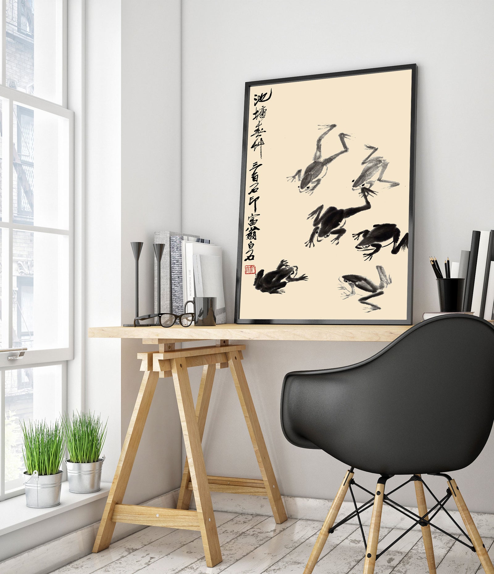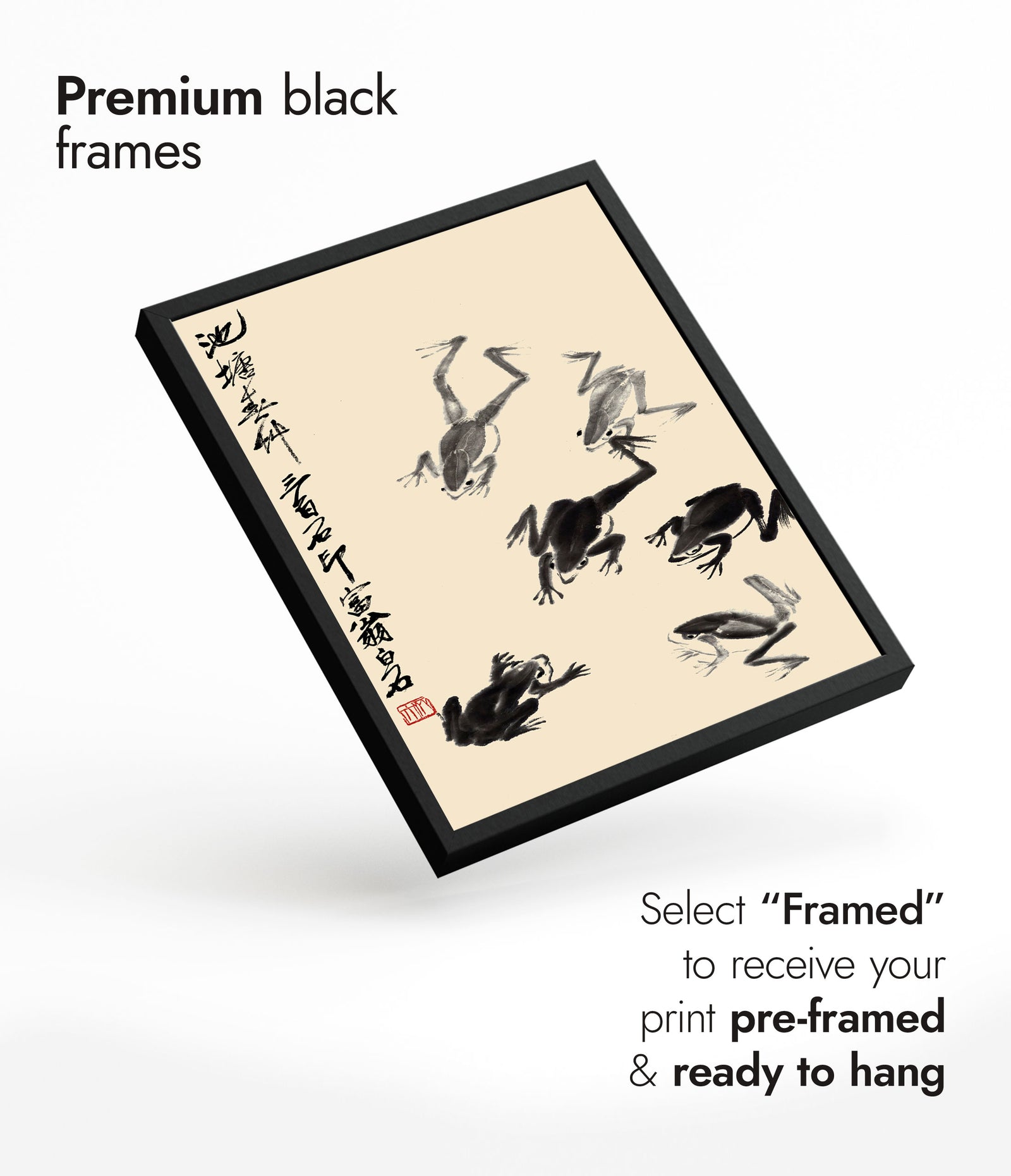 This traditional Japanese poster titled "Frogs" by Matsumoto Hoji captures the playful essence of nature with minimalist Sumi-E brush strokes. The artwork features five animated frogs in various dynamic poses, creating a lively and humorous portrayal. The muted tones and stark lines reflect traditional Japanese art, perfect for adding a touch of nature-inspired elegance to any space.