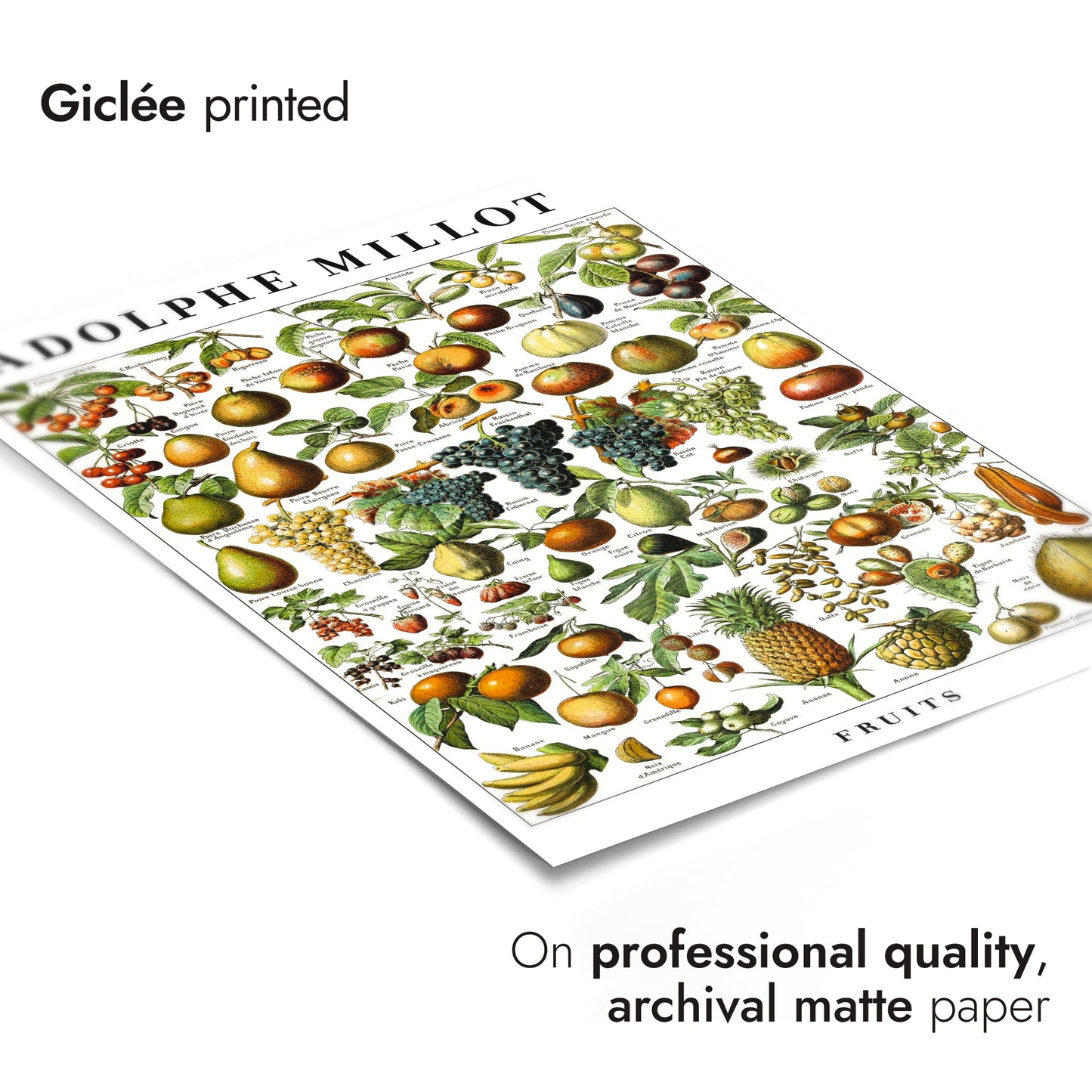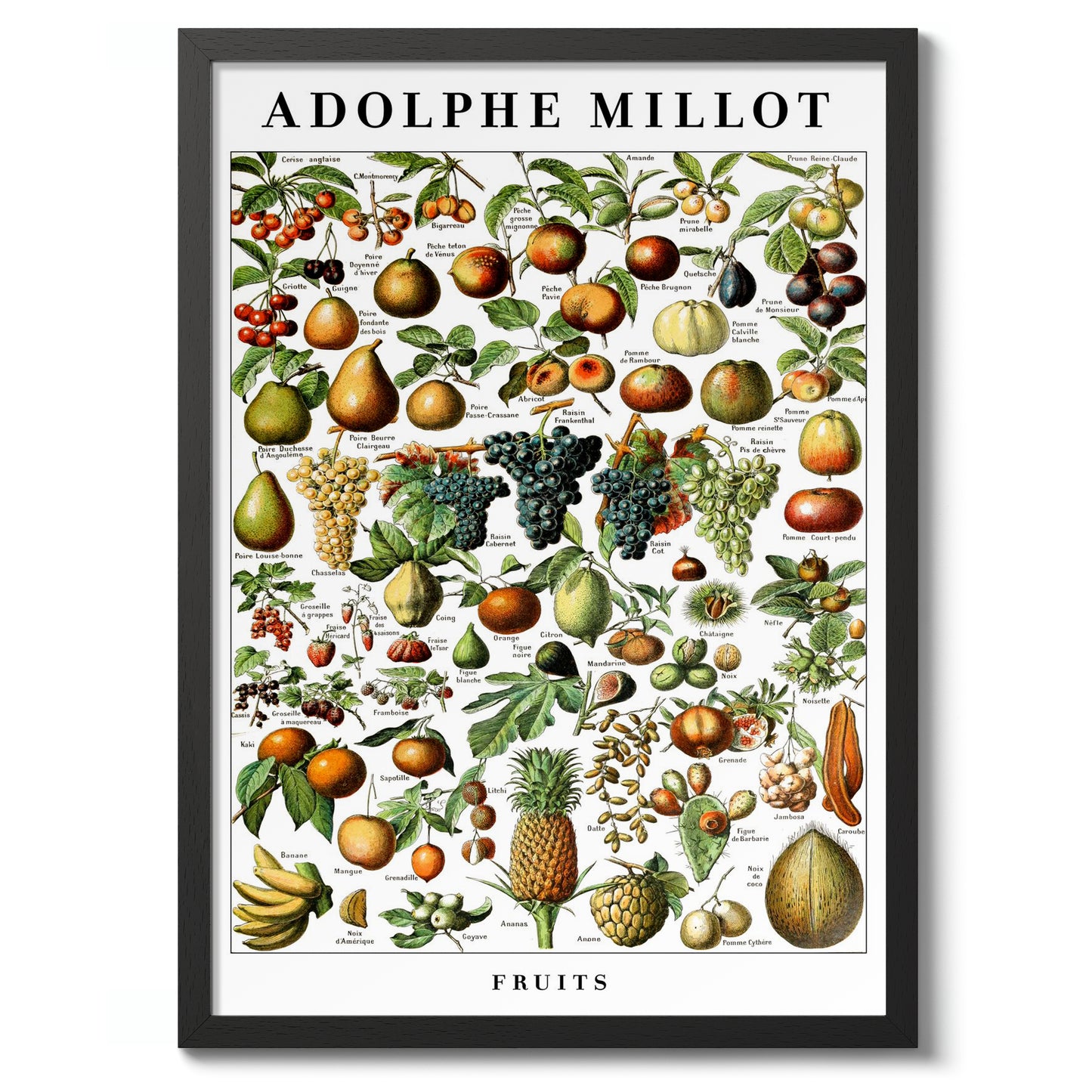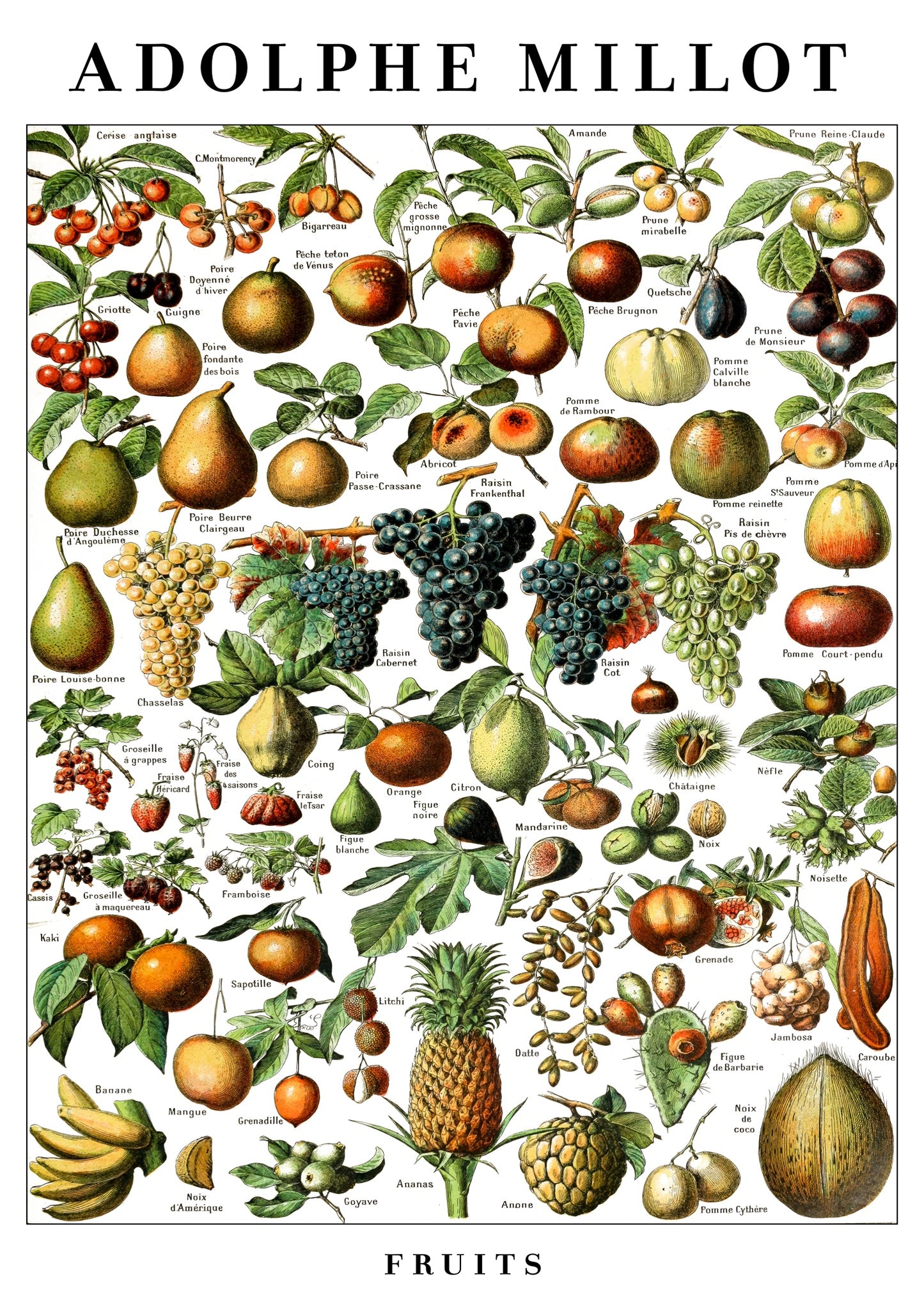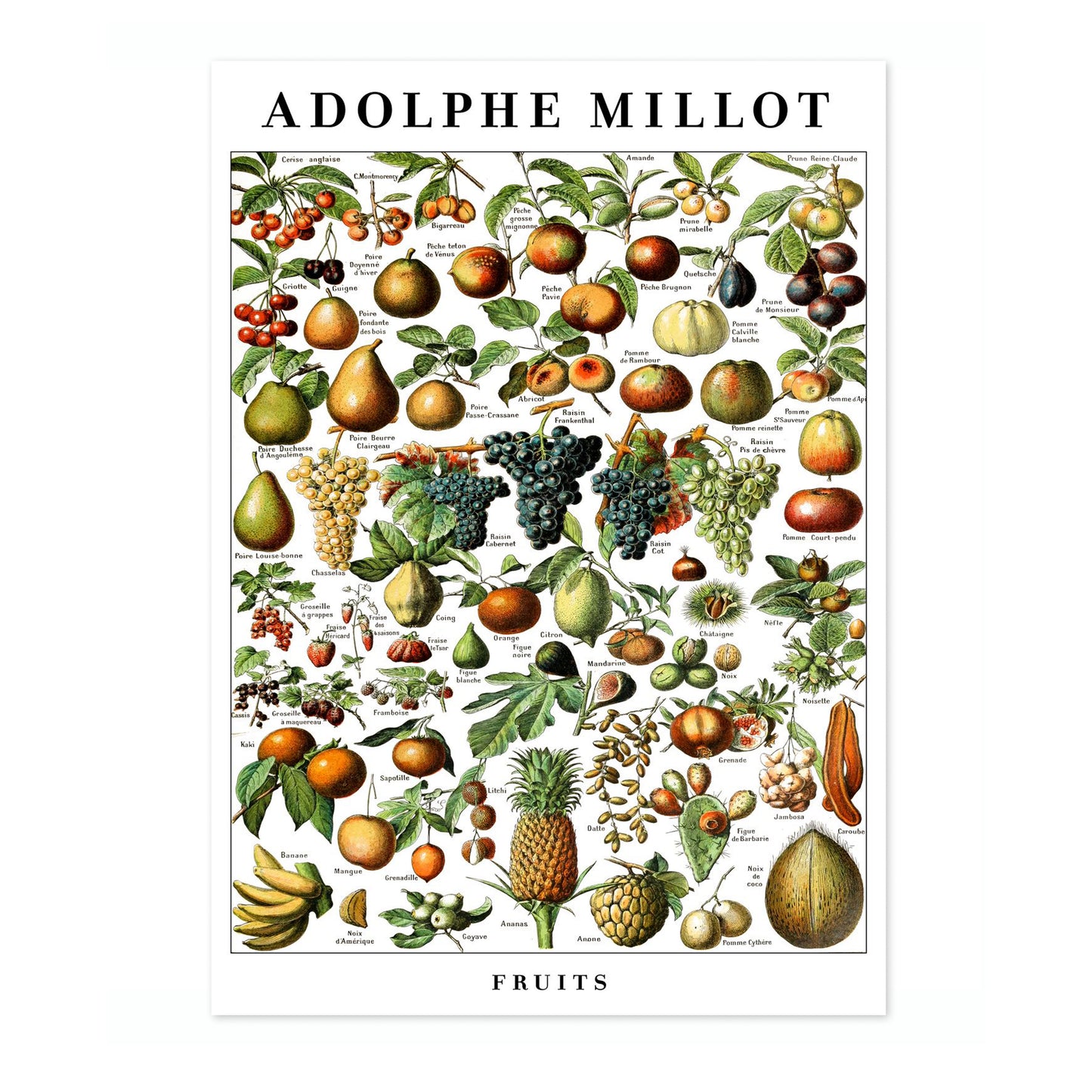 Discover a vintage botanical illustration poster by Adolphe Millot, featuring an array of meticulously detailed fruits from around the world. This captivating artwork includes vibrant pears, grapes, bananas, and apples set against a clean white background. Perfect for science or botanical enthusiasts, this multicolored piece highlights the diversity and beauty of fruit with a charming, timeless style.