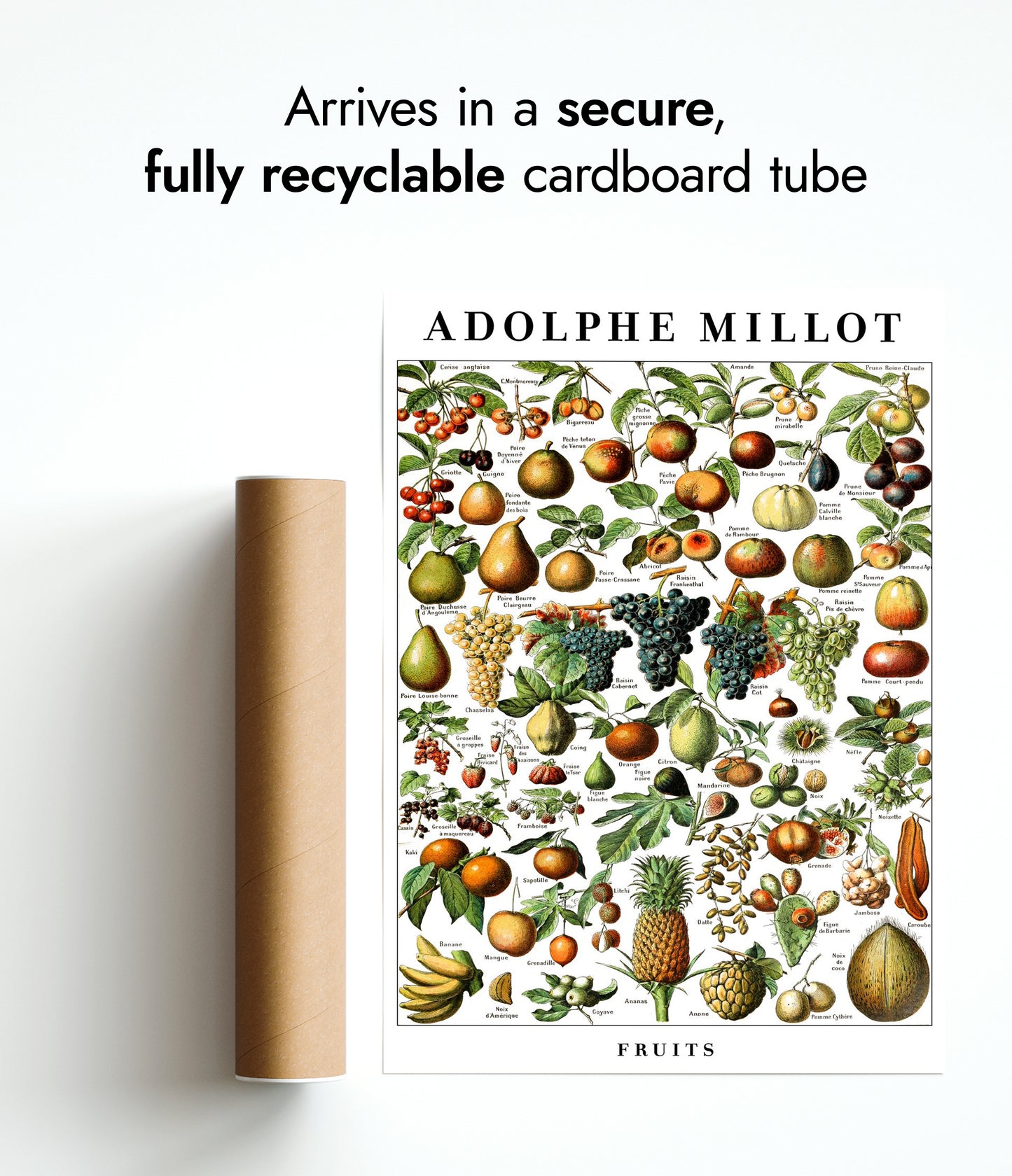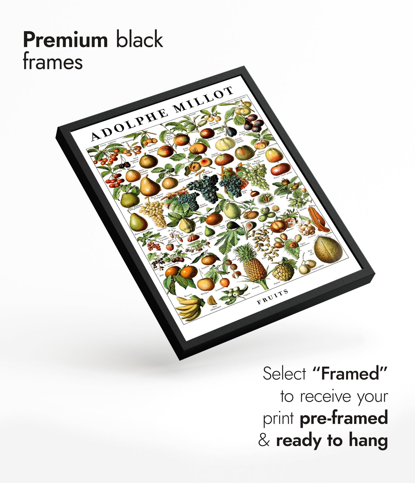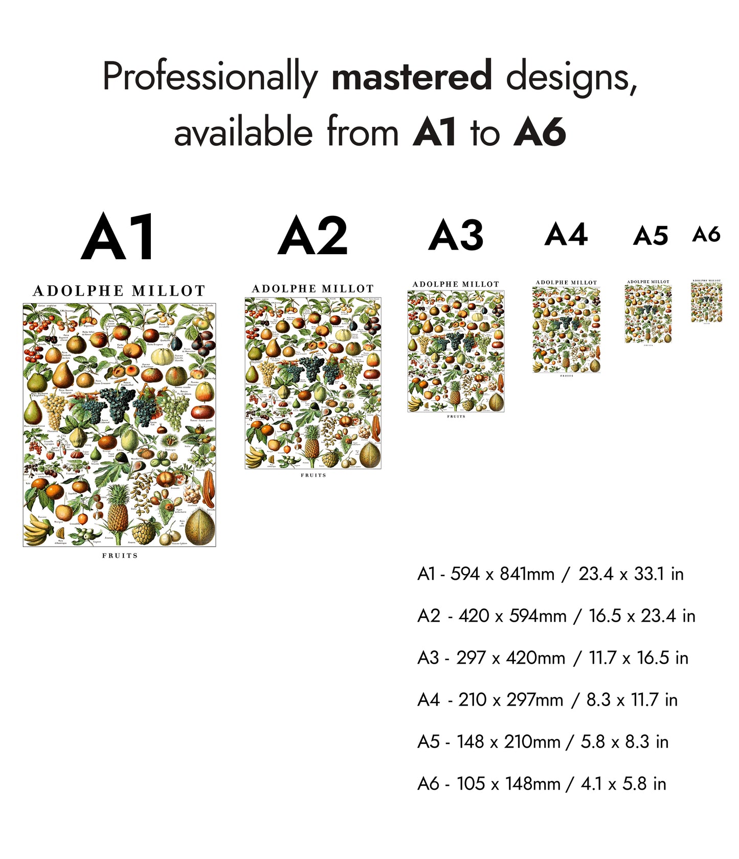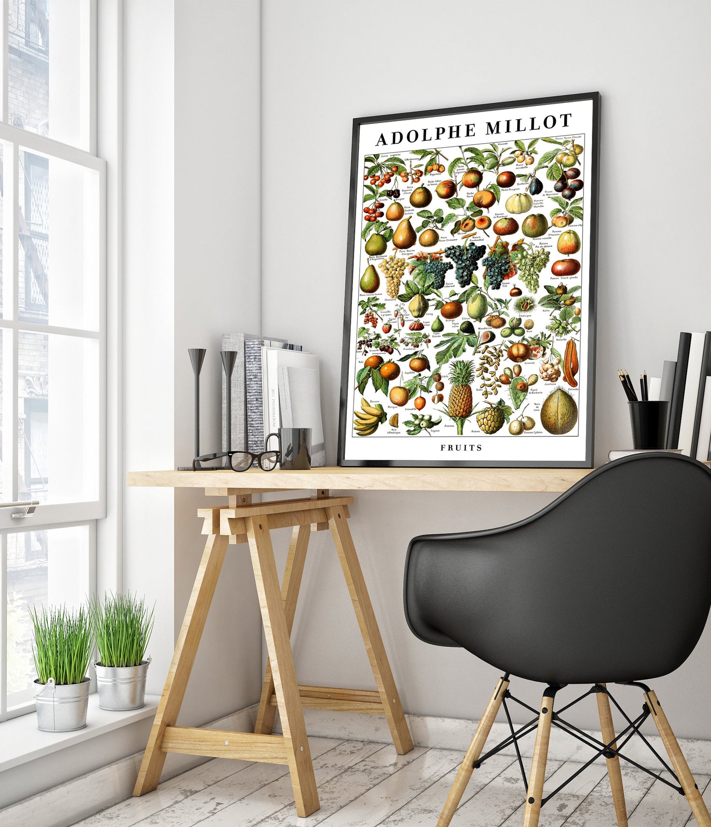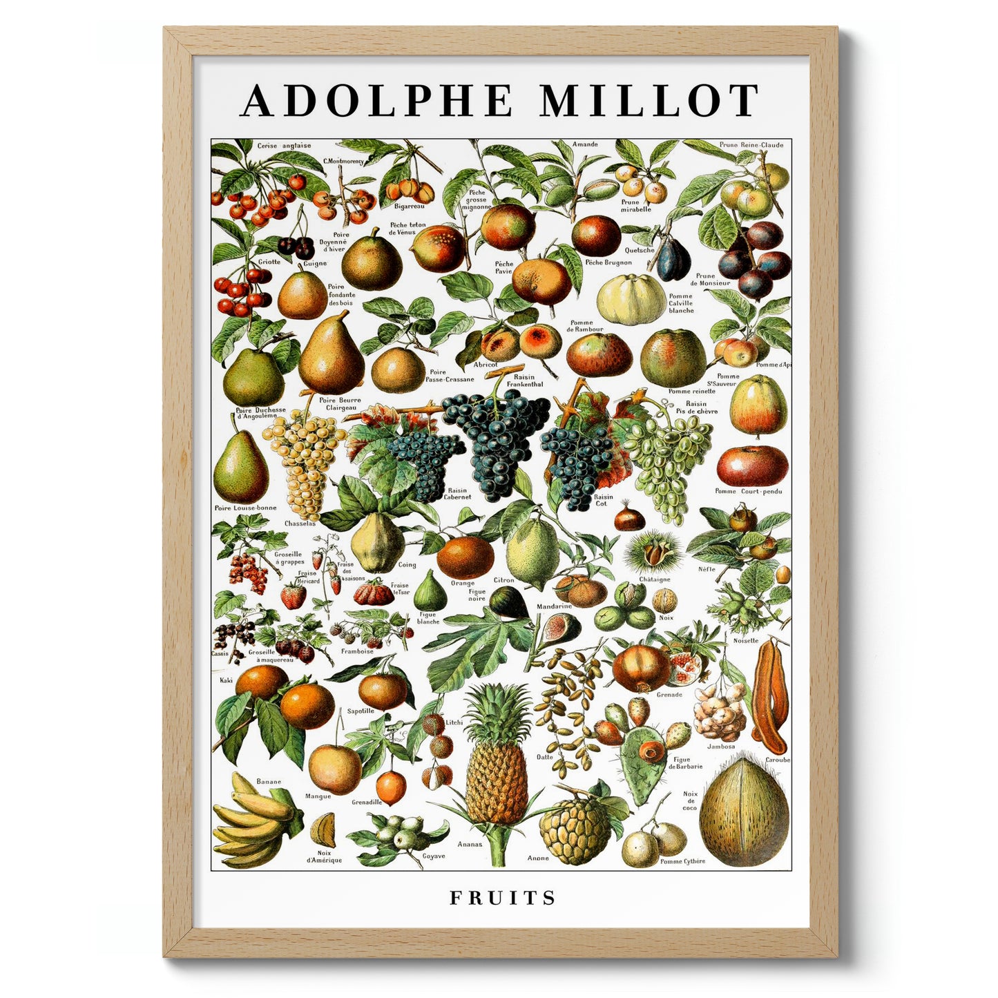 Discover a vintage botanical illustration poster by Adolphe Millot, featuring an array of meticulously detailed fruits from around the world. This captivating artwork includes vibrant pears, grapes, bananas, and apples set against a clean white background. Perfect for science or botanical enthusiasts, this multicolored piece highlights the diversity and beauty of fruit with a charming, timeless style.