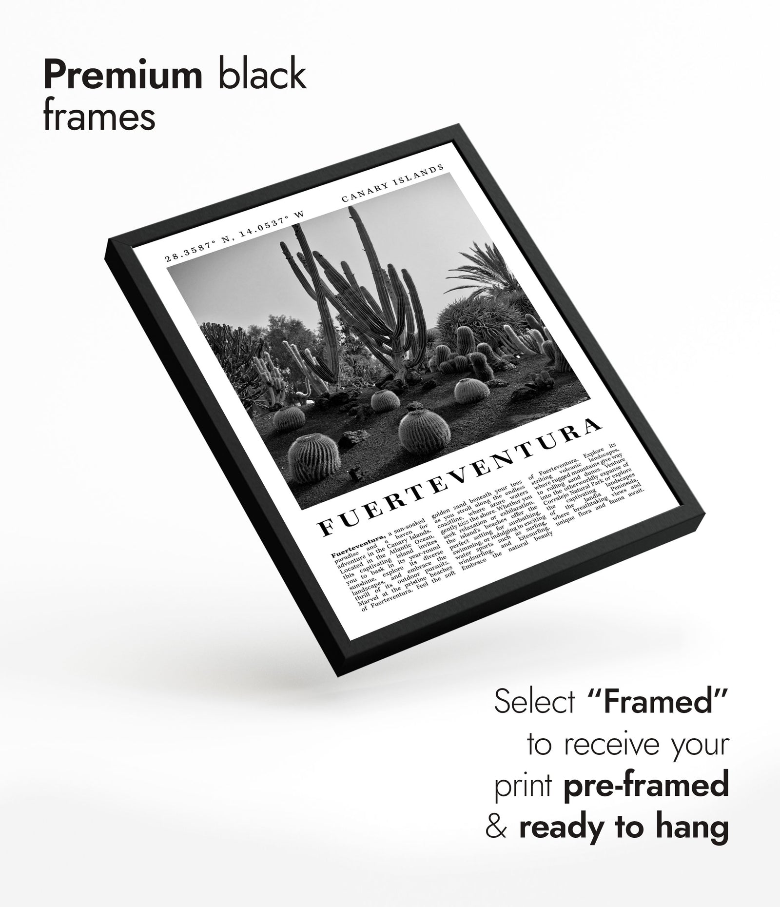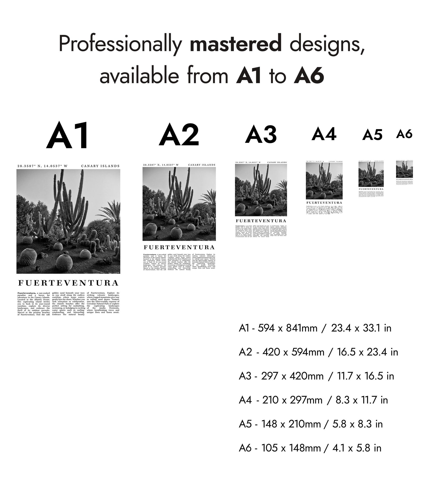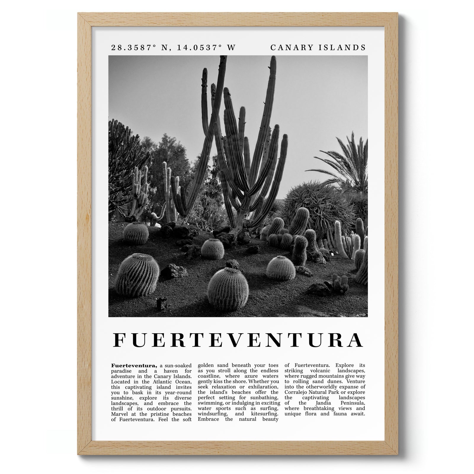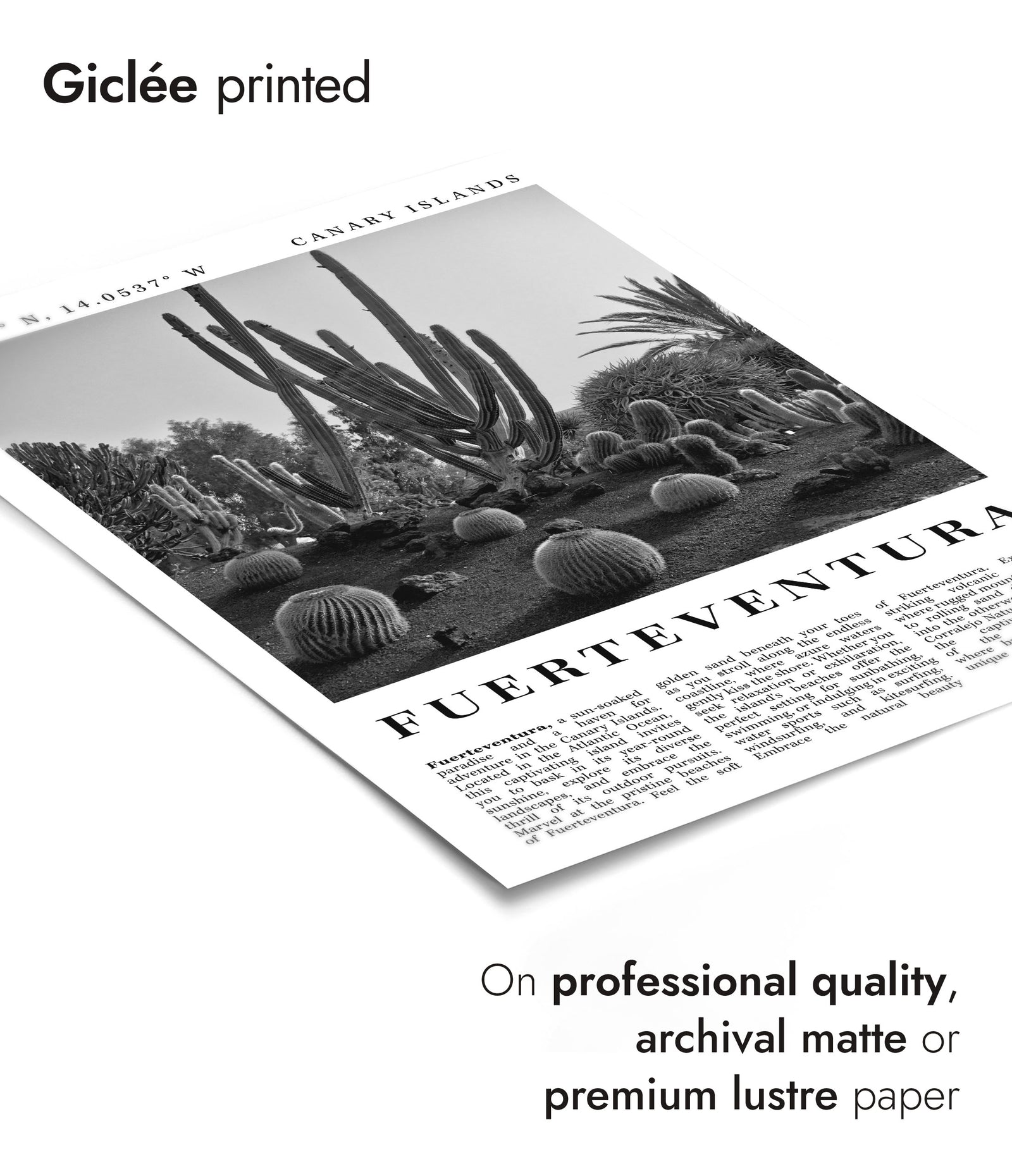 This Fuerteventura poster captures the striking landscape of Spain's Canary Islands. Featuring a monochromatic image of towering cacti and rugged terrain, it embodies the island's arid beauty and natural charm. Ideal for travel enthusiasts and nature lovers, this modern photographic portrait highlights the unique flora of the Mediterranean region, offering a compelling focal point for any space.
