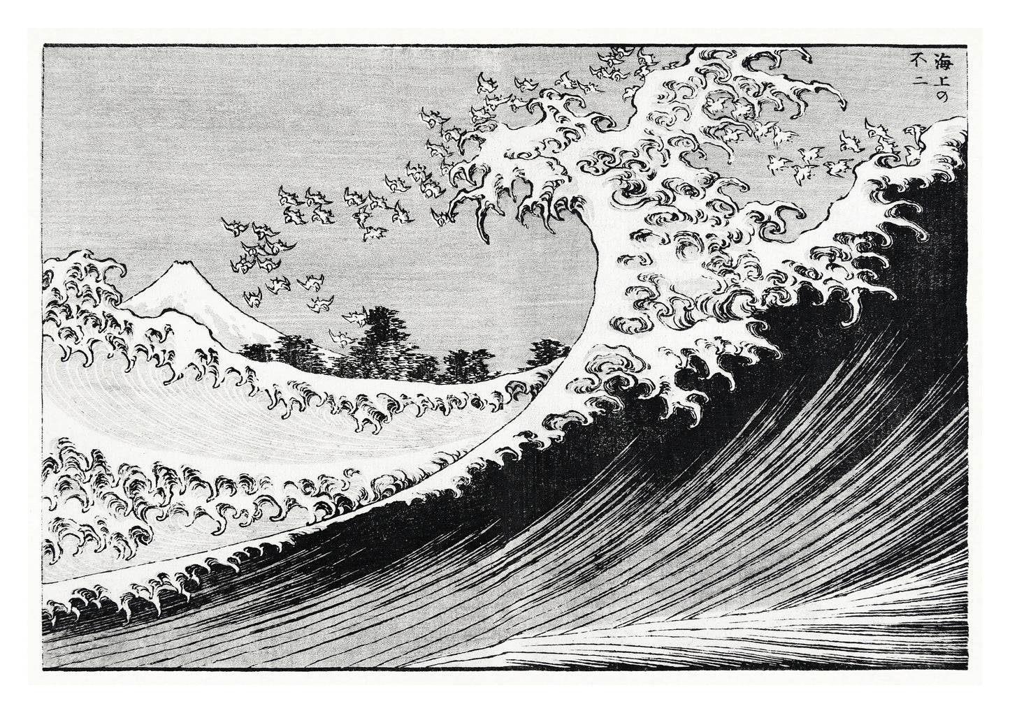 This "Fuji at Sea" poster by Katsushika Hokusai captures the timeless essence of traditional Japanese woodblock art. Featuring the iconic wave, this monochrome ukiyo-e print beautifully contrasts the dynamic ocean with the serene Mount Fuji in the background. Perfect for adding a touch of classic Japanese culture to any space, this landscape art print is ideal for enthusiasts of traditional woodblock styles.