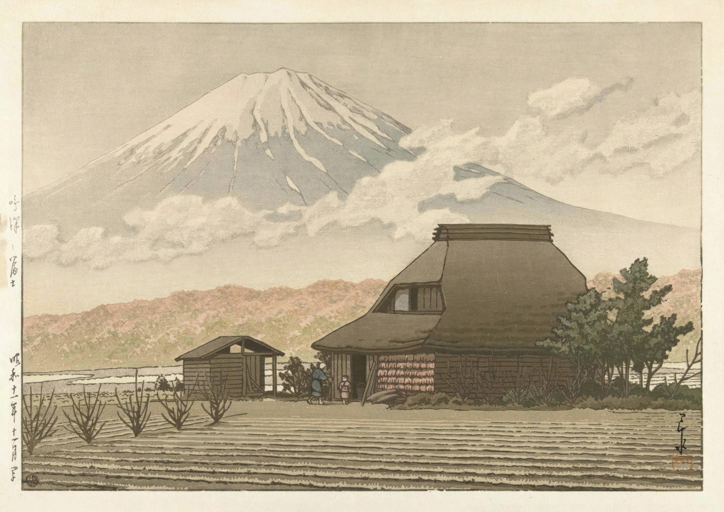 "Fuji from Narusawa Village" by Kawase Hasui captures the serene beauty of traditional Japanese countryside life with a view of Mount Fuji. This traditional woodblock poster features a quaint village scene with a rustic cottage framed by lush fields and distant mountains. Ideal for lovers of Ukiyo-e and classic Japanese landscapes. Perfect for adding a touch of cultural heritage to any space.