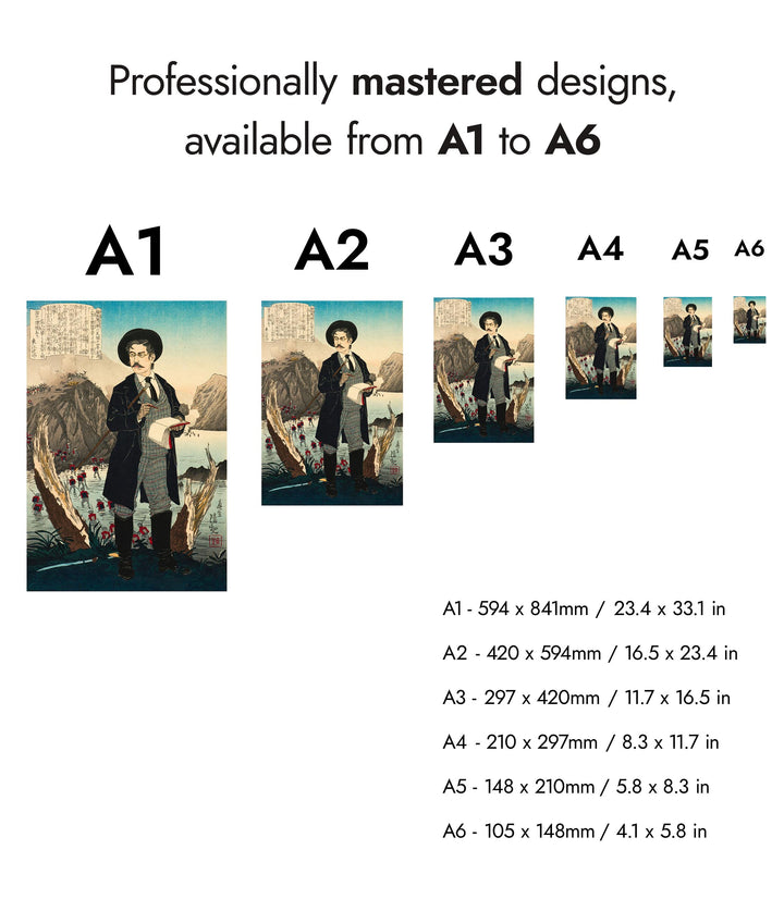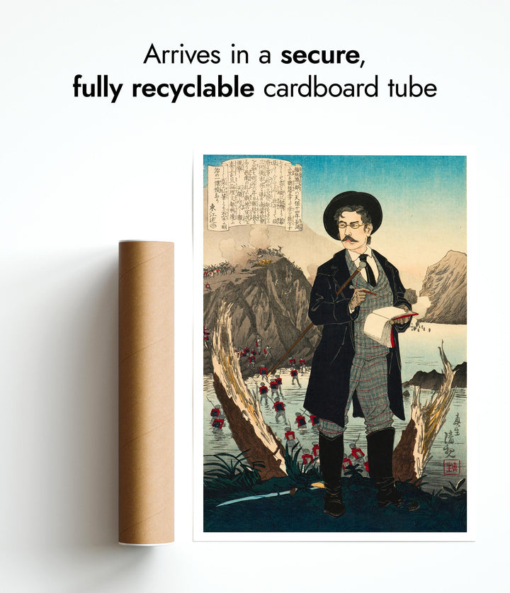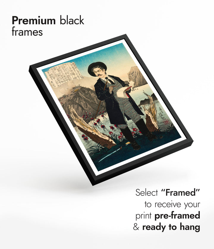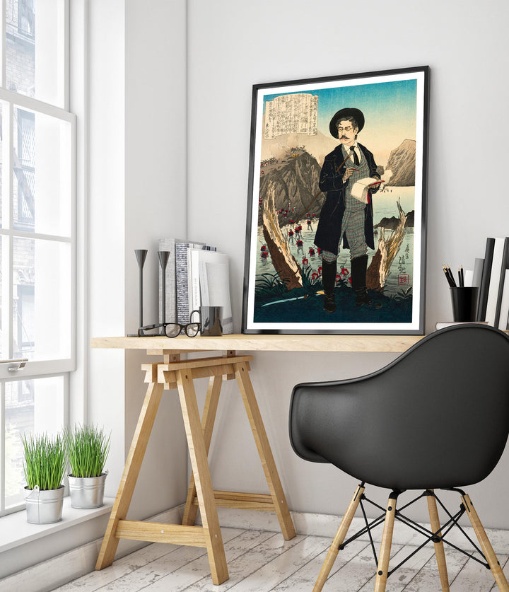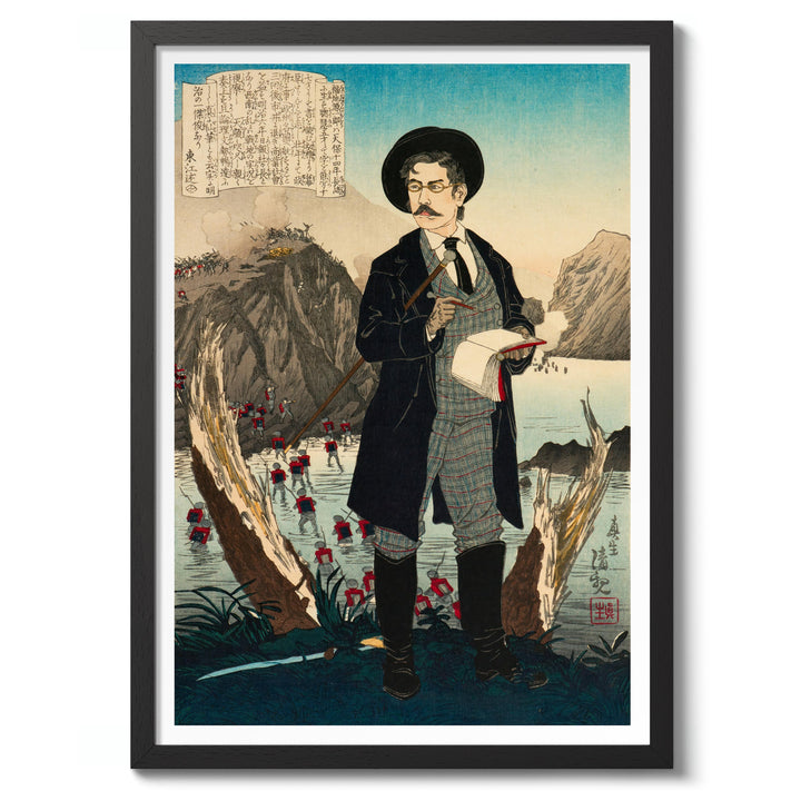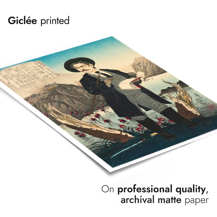 This Japanese traditional woodblock poster, "Fukuchi Gen’Ichiro" by Kobayashi Kiyochika, portrays a man in a suit holding documents, standing by the sea with cliffs and warriors in the background. The detailed illustration vividly captures the historical attire and setting, ideal for those appreciating Ukiyo-E art and Japanese history.
