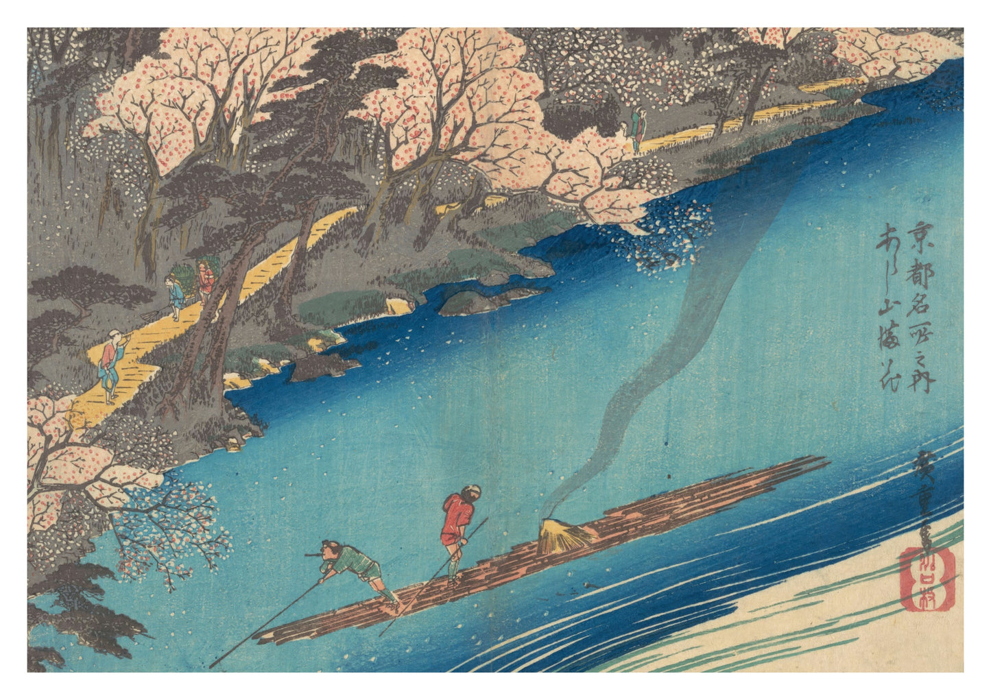 This Japanese woodblock print by Utagawa Hiroshige, titled "Full Blossom at Arashiyama on the Oi River," beautifully captures a serene riverside scene. The poster showcases delicate cherry blossoms, vibrant blue waters, and a traditional boat with two figures, blending nature and human activity in harmonious detail. Ideal for those appreciating traditional Ukiyo-e art and the tranquil beauty of Japanese landscapes.