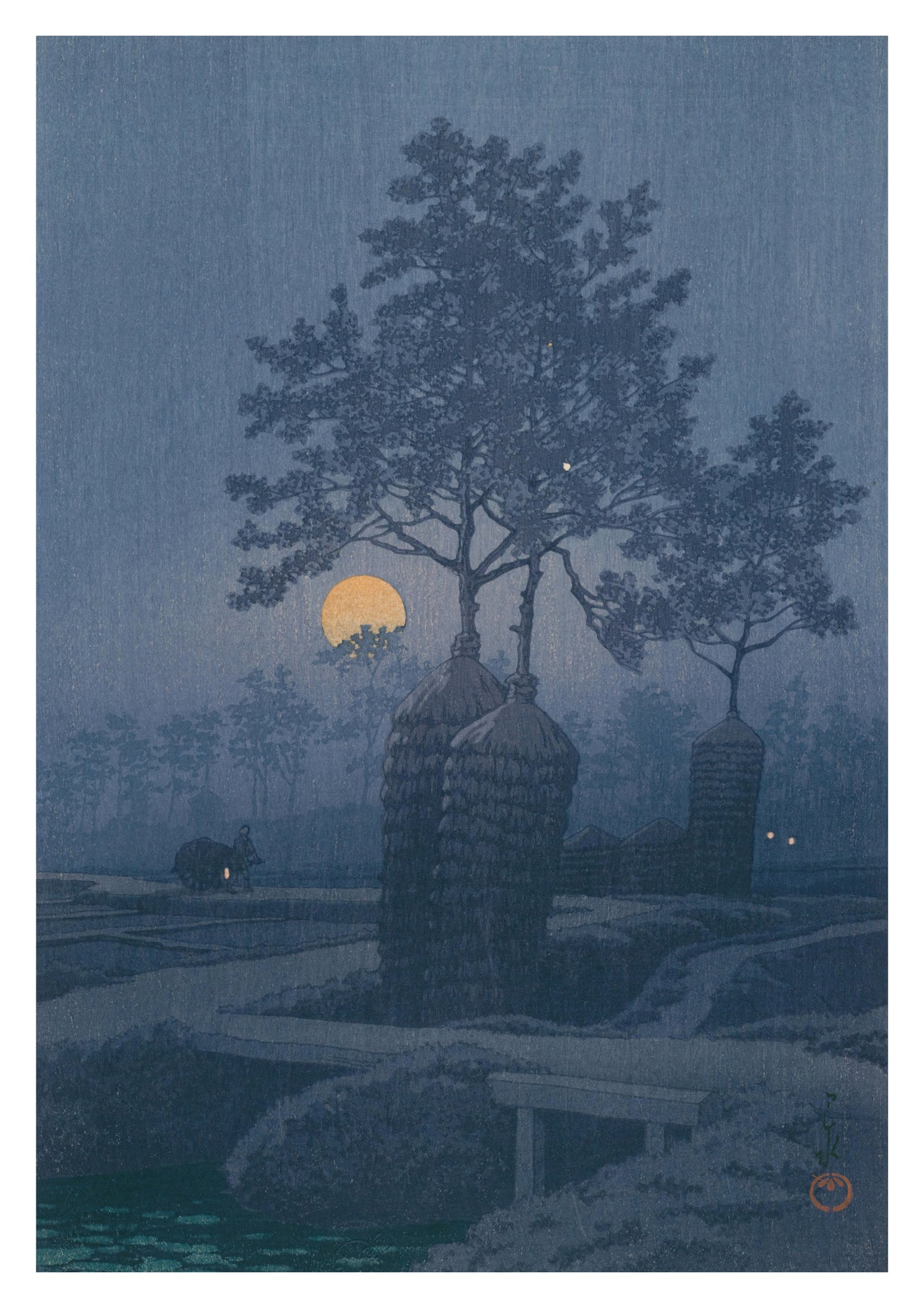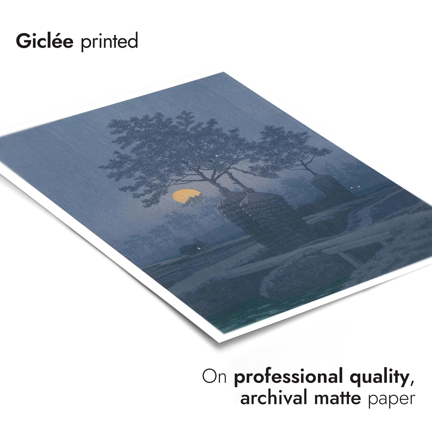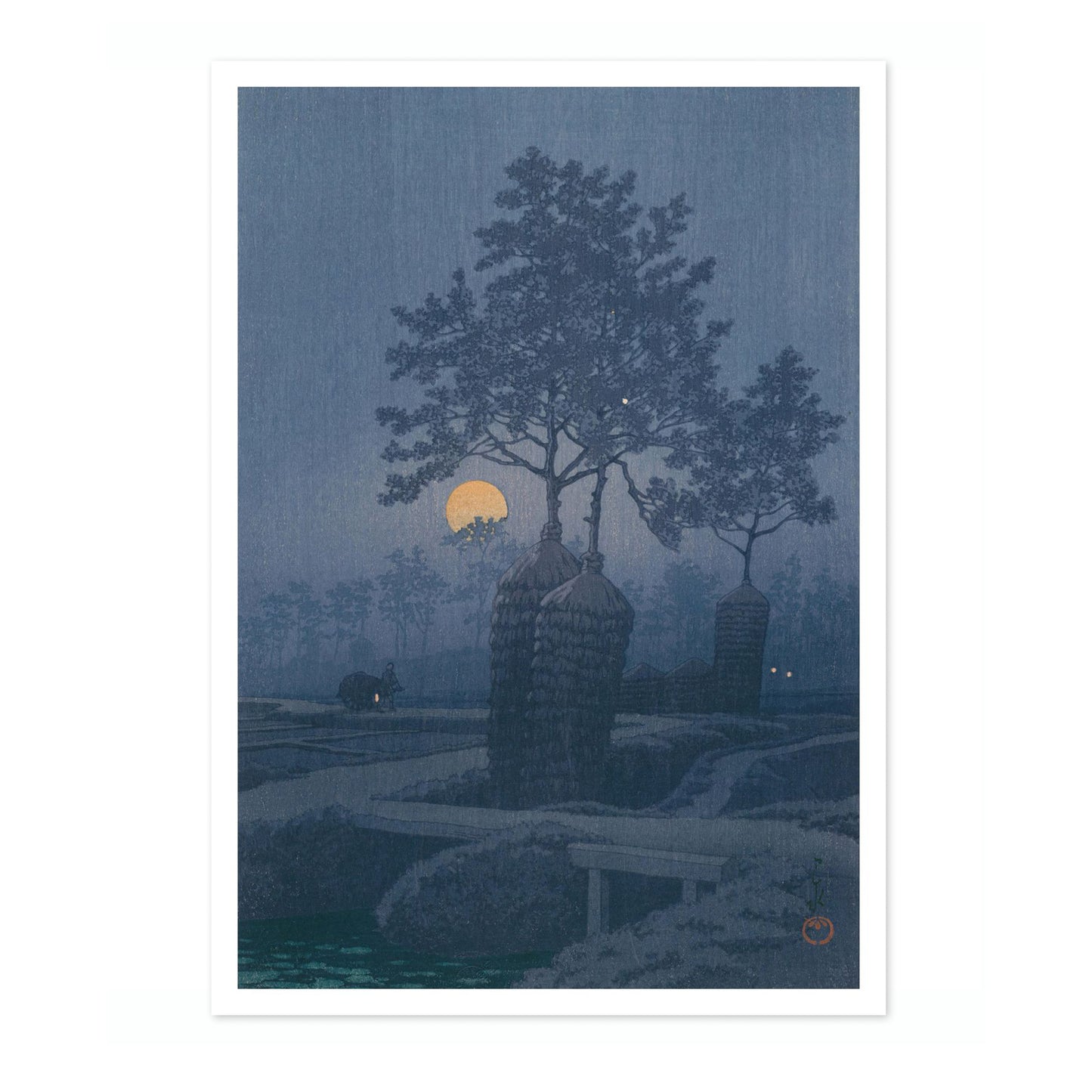 This serene poster, "Full Moon at Gamo" by Kawase Hasui, captures a tranquil evening scene in traditional Japanese woodblock style. The luminous full moon casts a gentle glow over a rural landscape, with towering trees and mysterious paths. Rich purple hues enhance the dreamy night atmosphere, perfect for those seeking a touch of Japanese artistry in their space.