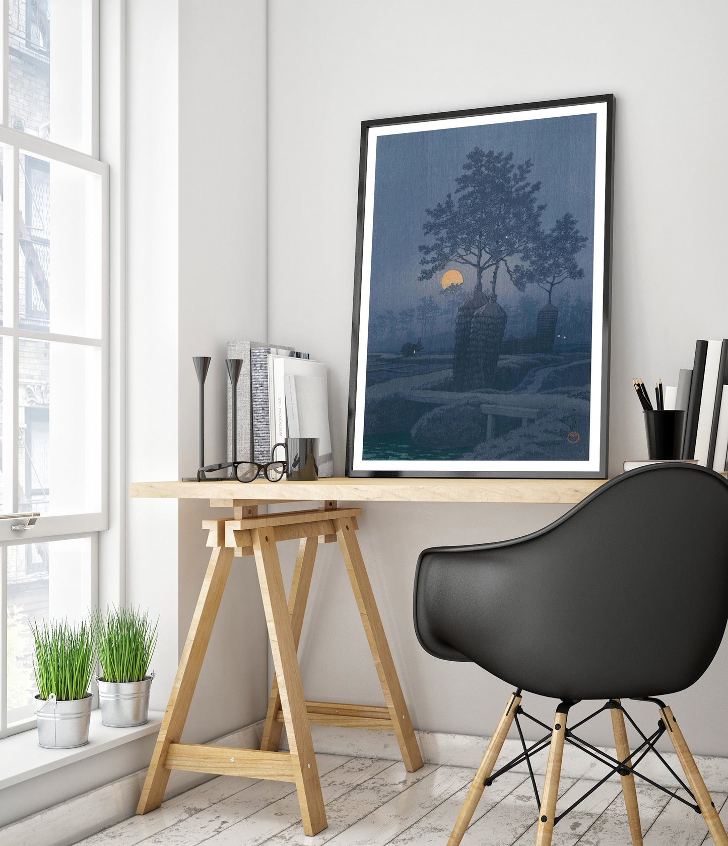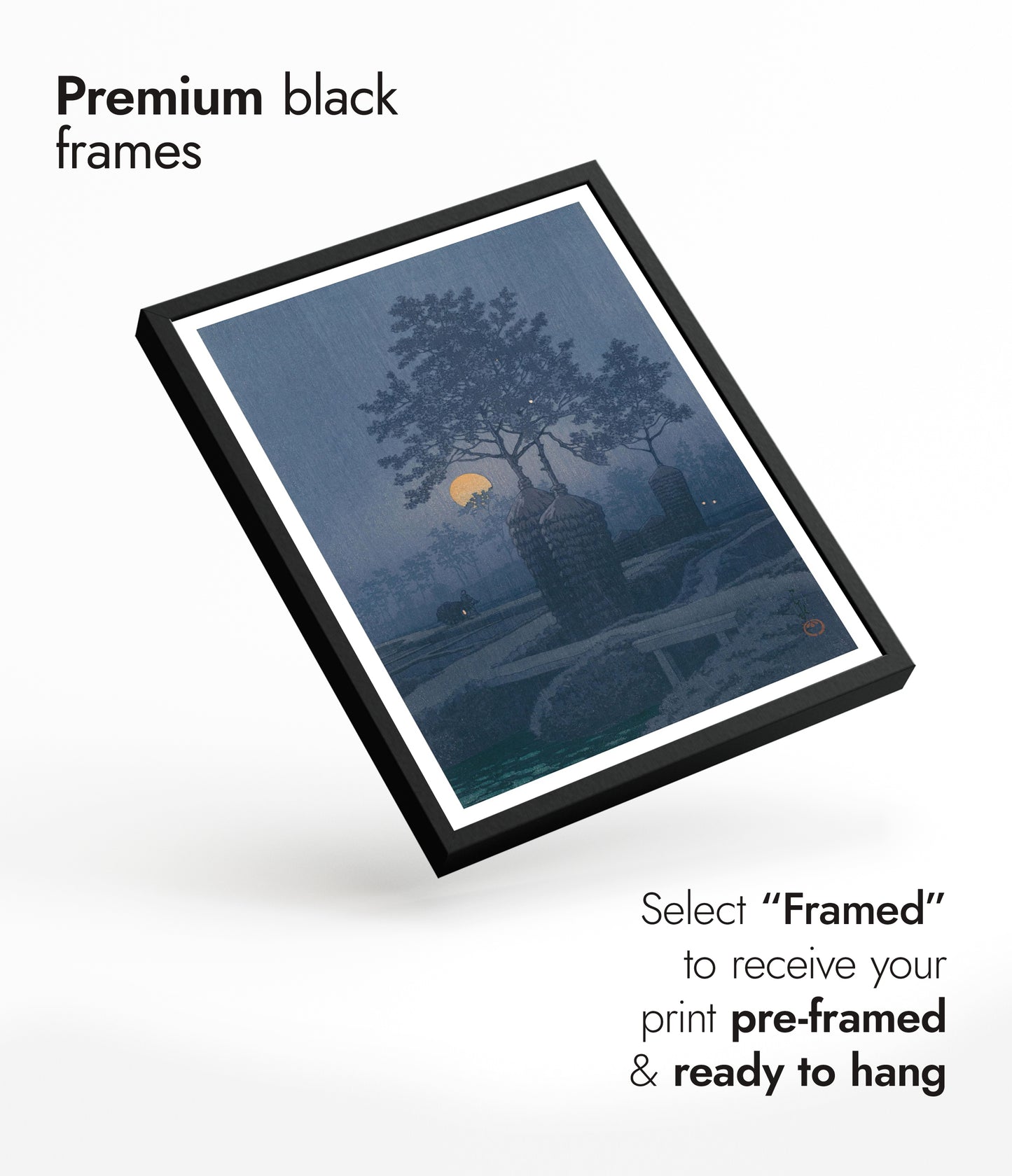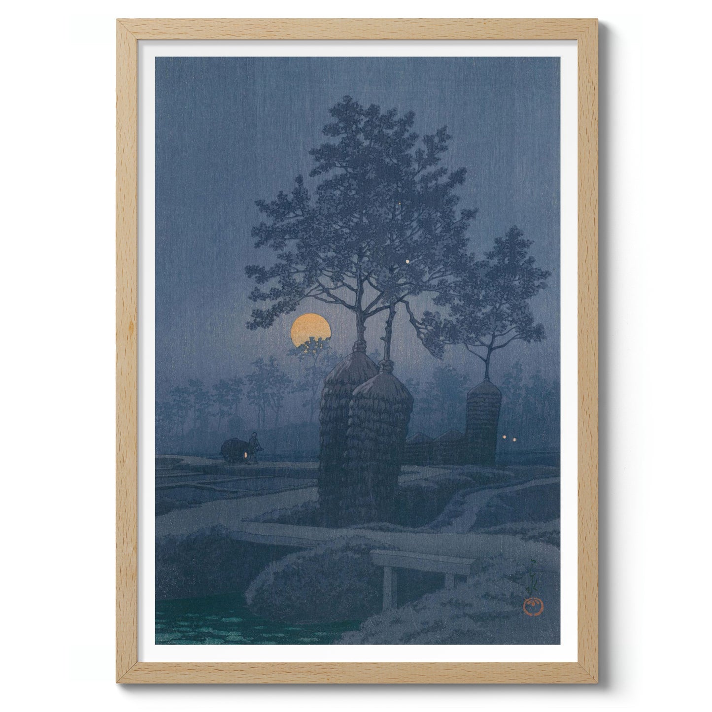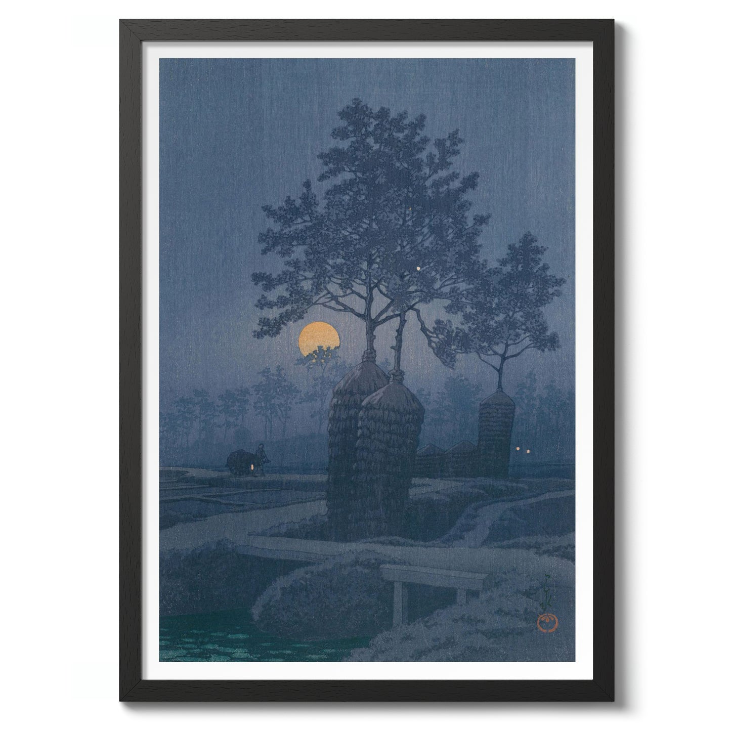 This serene poster, "Full Moon at Gamo" by Kawase Hasui, captures a tranquil evening scene in traditional Japanese woodblock style. The luminous full moon casts a gentle glow over a rural landscape, with towering trees and mysterious paths. Rich purple hues enhance the dreamy night atmosphere, perfect for those seeking a touch of Japanese artistry in their space.