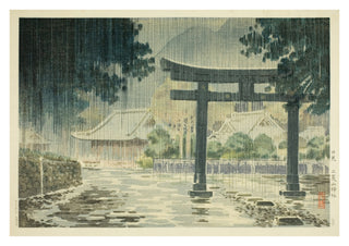 This "Futarasan Shrine at Nikko" poster by Tsuchiya Koitsu showcases a serene Japanese shrine amidst a gentle rainstorm. The traditional woodblock print captures a tranquil moment, featuring the iconic torii gate, lush forest, and reflective water. Ideal for lovers of traditional Ukiyo-e artistry, this illustration effortlessly brings the timeless elegance of Japanese landscapes into any space.