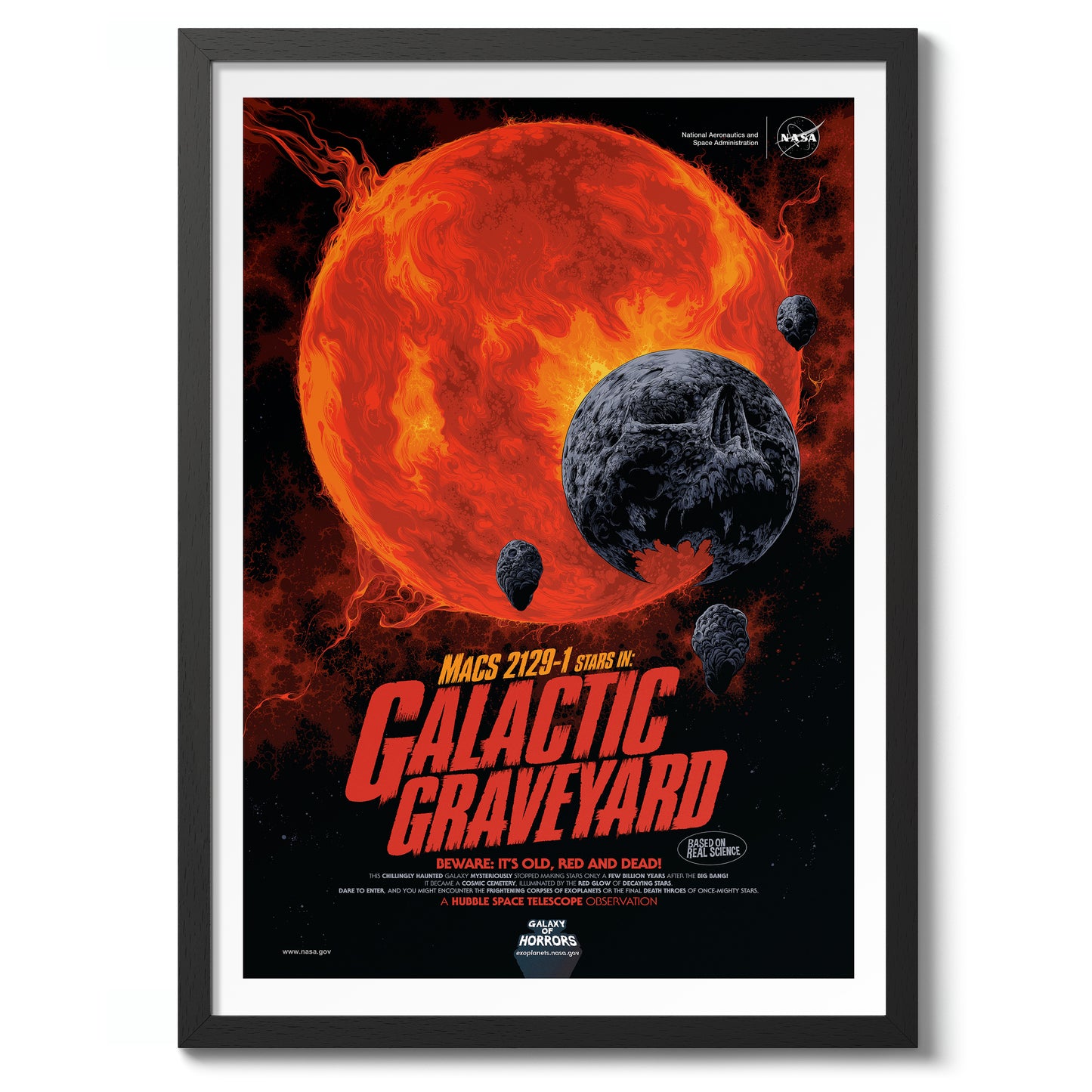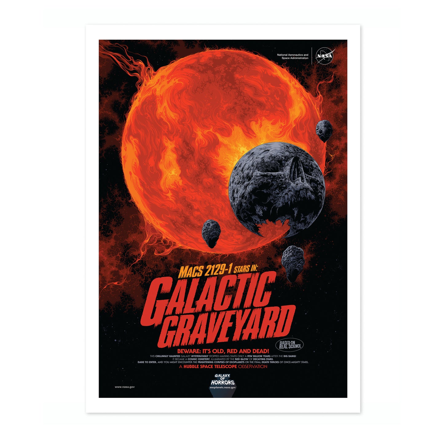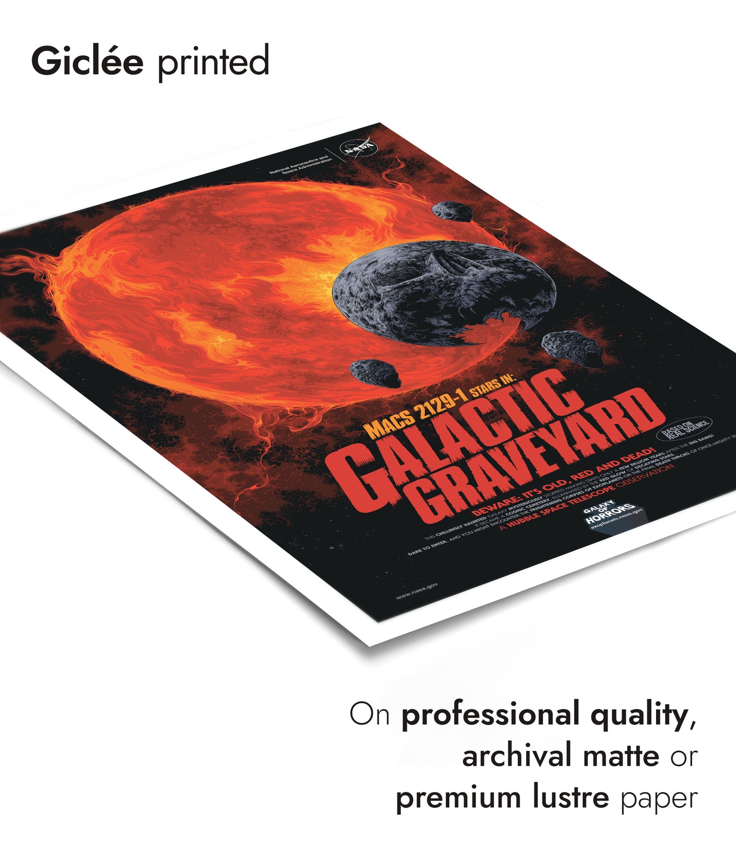 “Galactic Graveyard” poster features a vibrant, retro-style depiction of a decaying galaxy. The graphic illustration showcases a fiery sun amidst crumbling asteroids and distant planets, evoking a classic vintage NASA aesthetic. Ideal for space enthusiasts, this print encapsulates the awe-inspiring beauty and haunting silence of outer space. Perfect for adding a retro space vibe to any room.