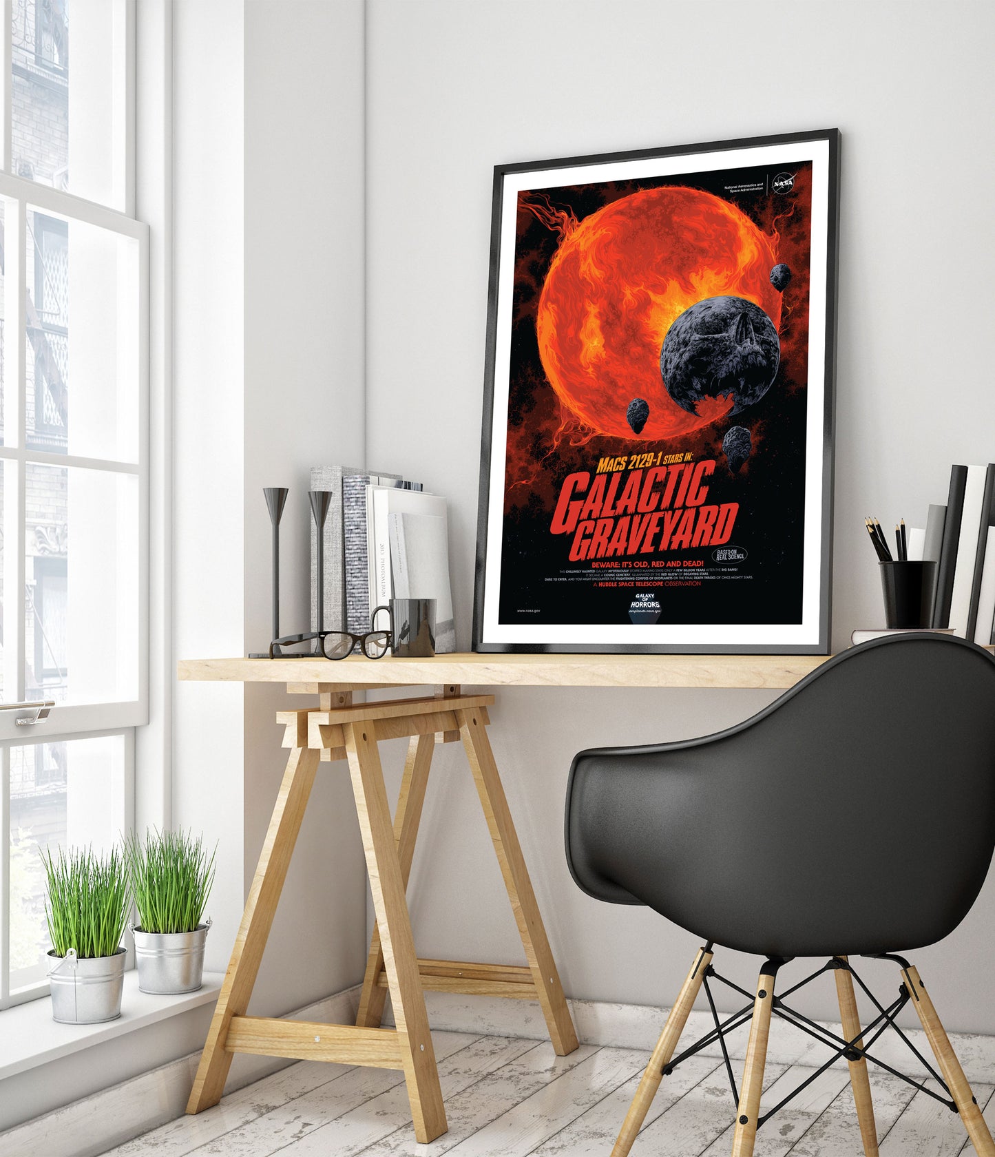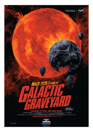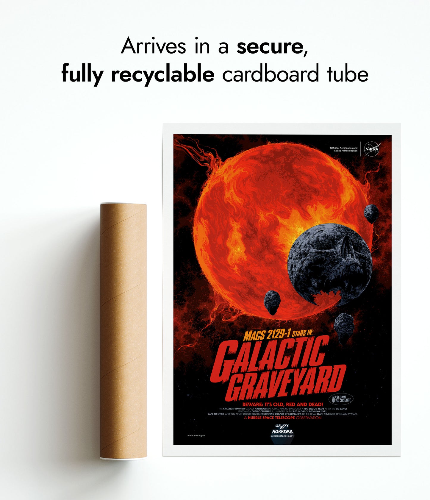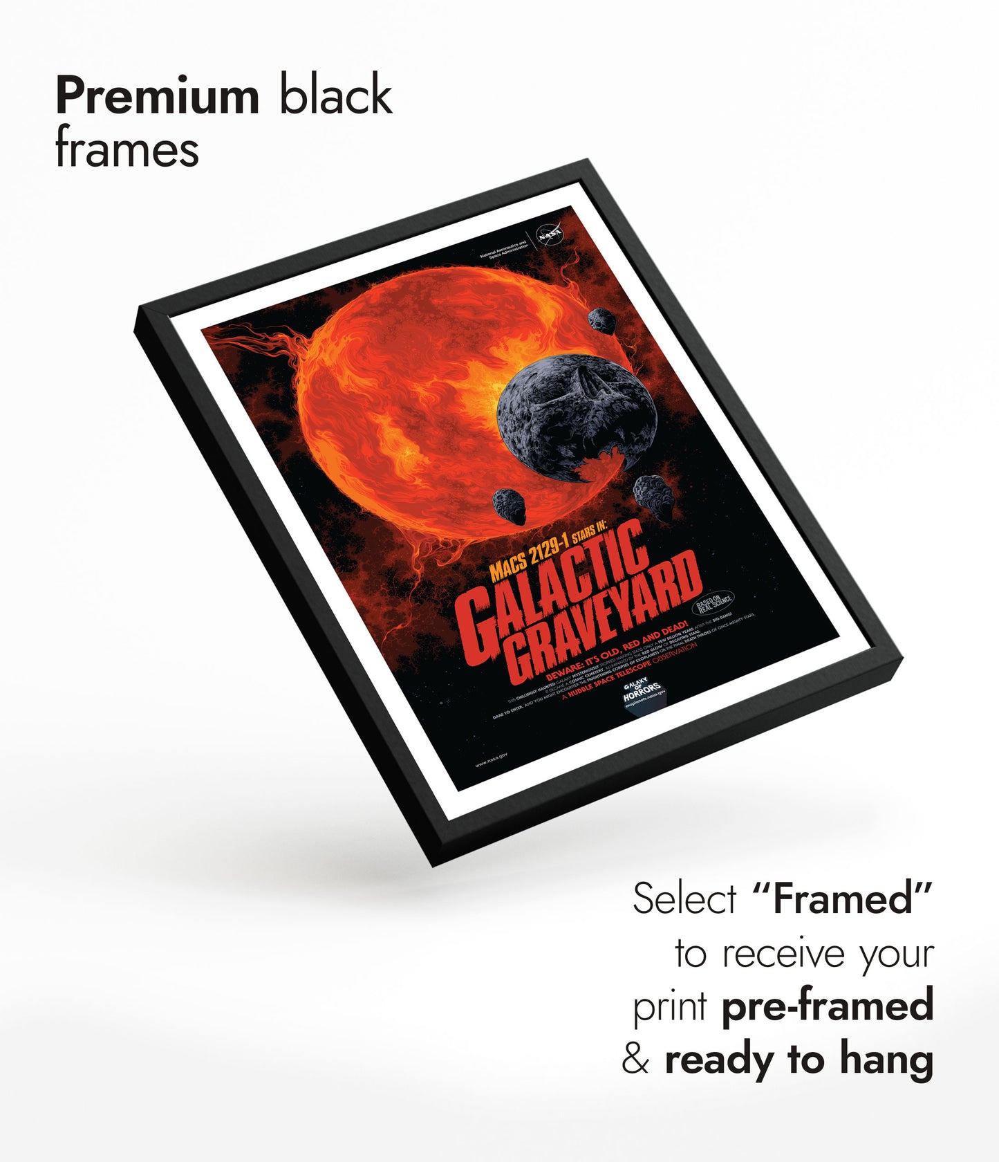 “Galactic Graveyard” poster features a vibrant, retro-style depiction of a decaying galaxy. The graphic illustration showcases a fiery sun amidst crumbling asteroids and distant planets, evoking a classic vintage NASA aesthetic. Ideal for space enthusiasts, this print encapsulates the awe-inspiring beauty and haunting silence of outer space. Perfect for adding a retro space vibe to any room.