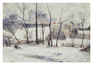 "Garden Under Snow" is a serene landscape poster by Paul Gauguin, capturing a quiet village blanketed in snow. Post-Impressionist brushstrokes create a textured scene with bare trees, rustic houses, and a tranquil countryside garden. Ideal for adding a touch of winter tranquility to any space, this art print evokes the peaceful ambiance of a snowy forest village.