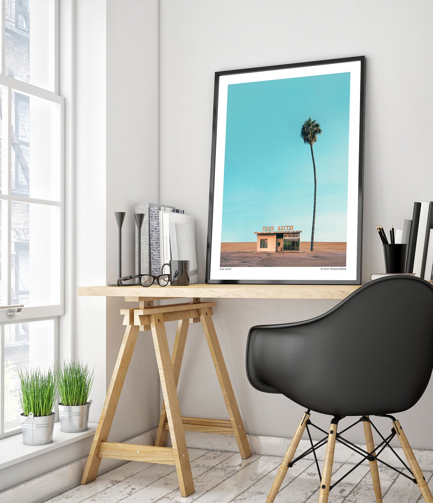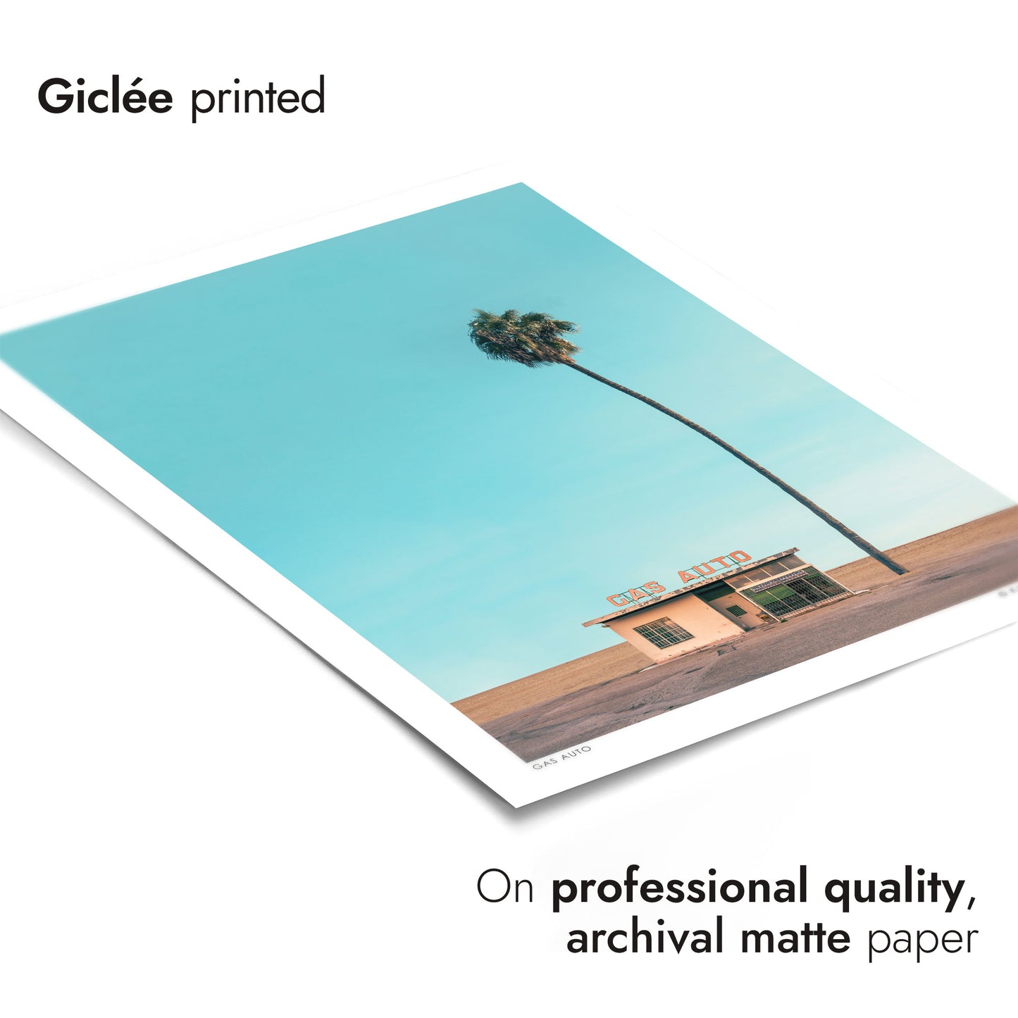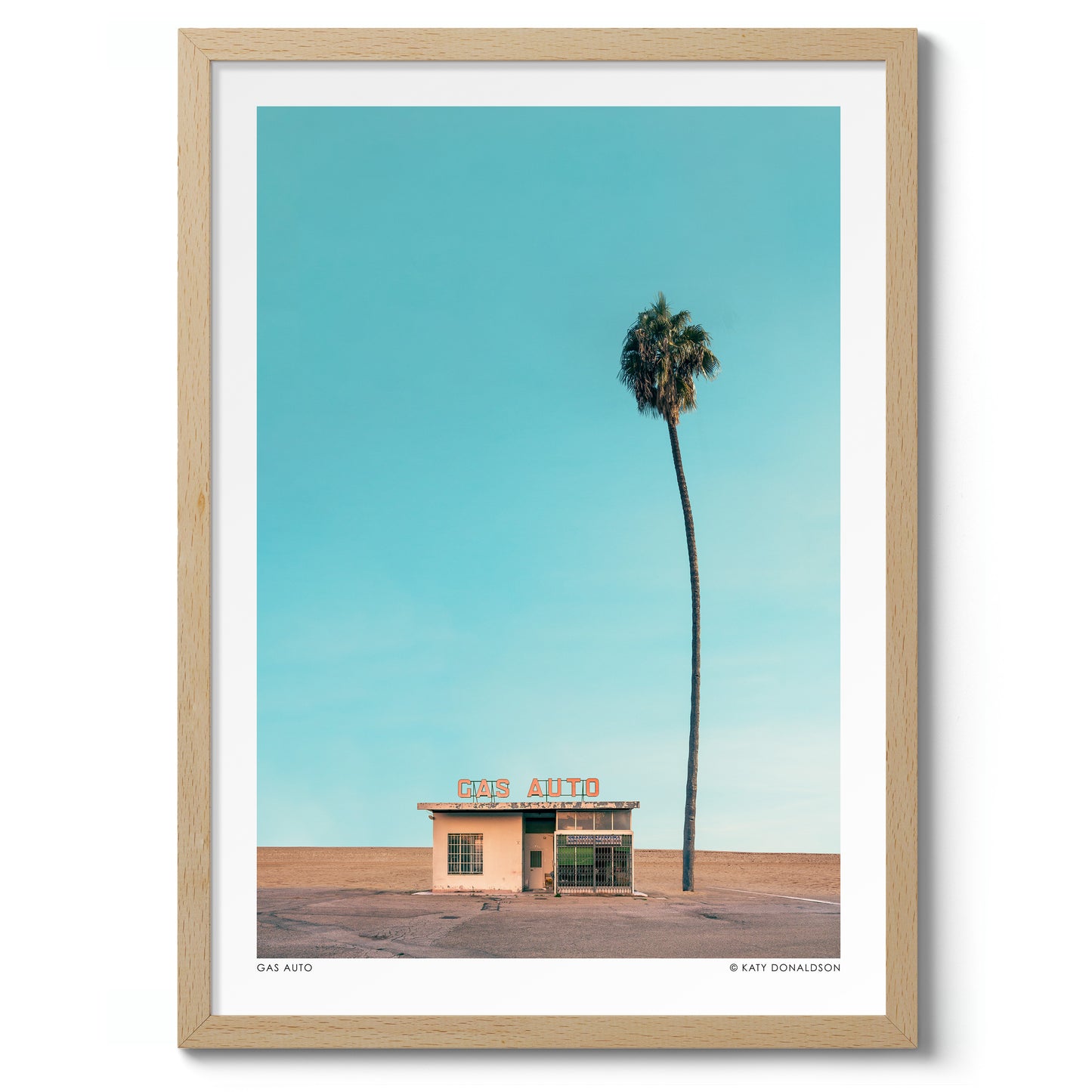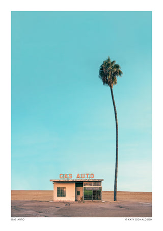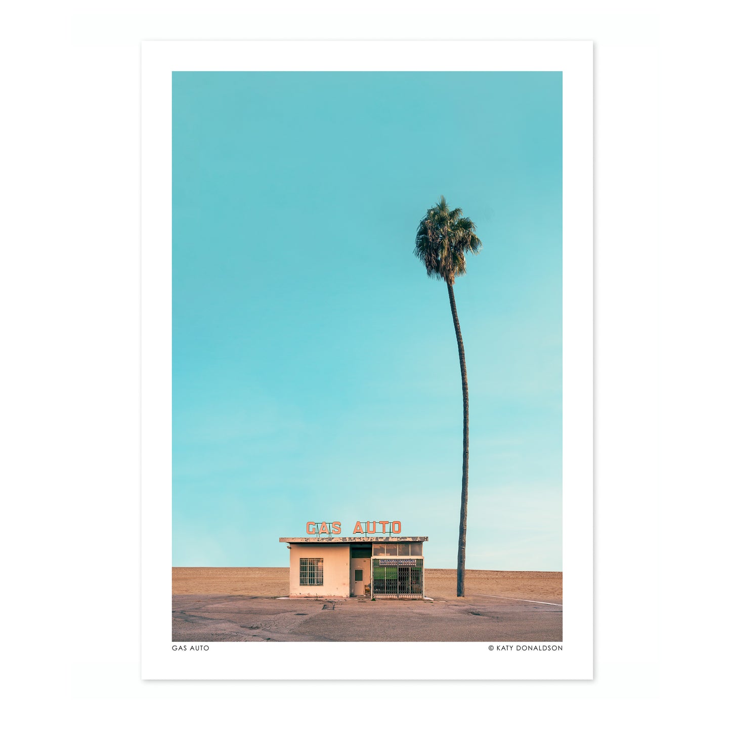 "Gas Auto" Poster by Katy Donaldson features a vintage gas station juxtaposed with a towering palm tree against an expansive, clear sky. The minimalist desert landscape emphasizes isolation and the stark beauty of the scene. Ideal for those who appreciate photographic art with vintage charm, this portrait-sized poster brings a unique touch to any space.
