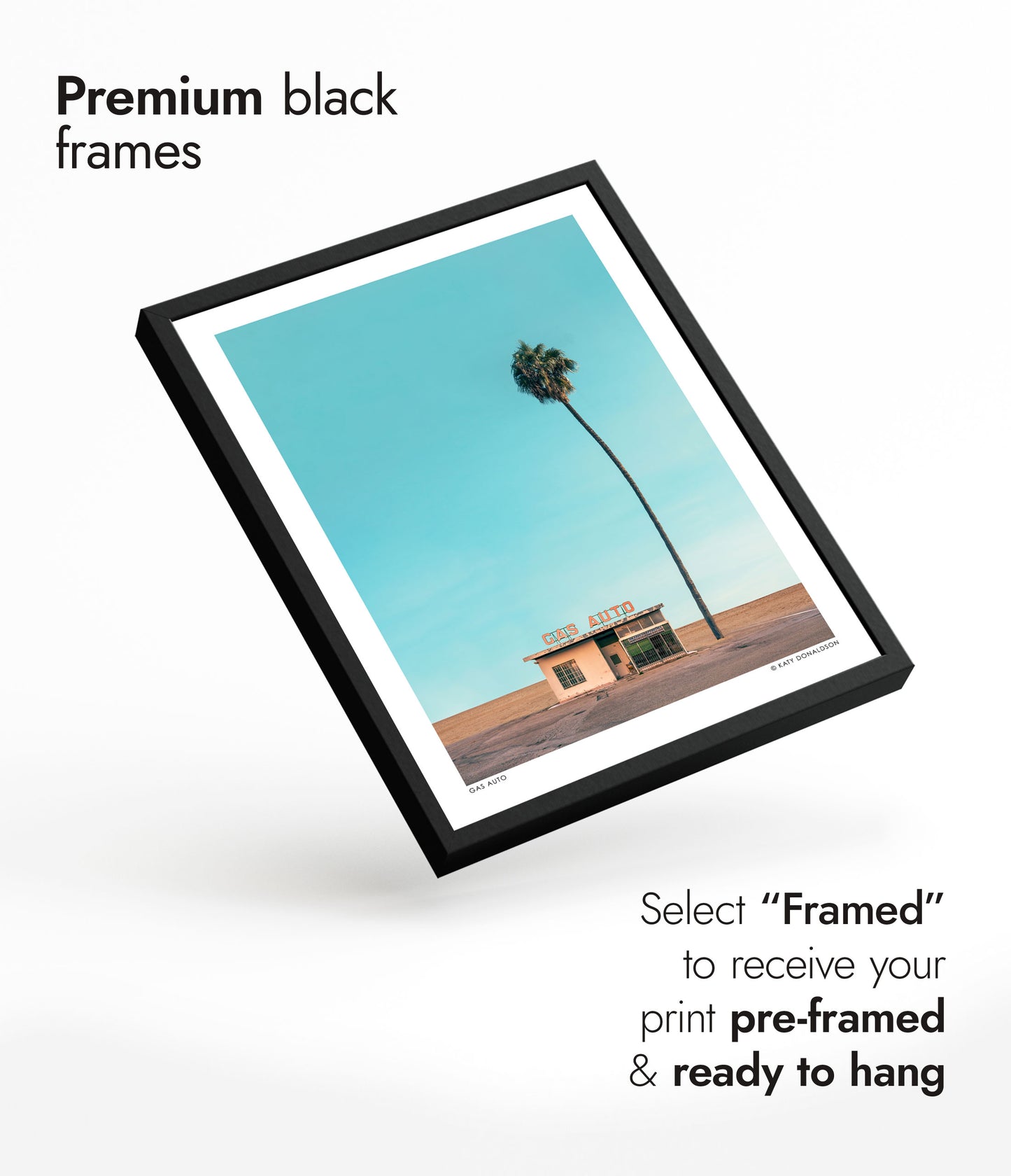 Solid wood frames available in black stained or natural finishes, with UV resistant acrylic glass. Framed orders arrive pre-installed with your choice of print, ready to hang. Available in all print sizes.
