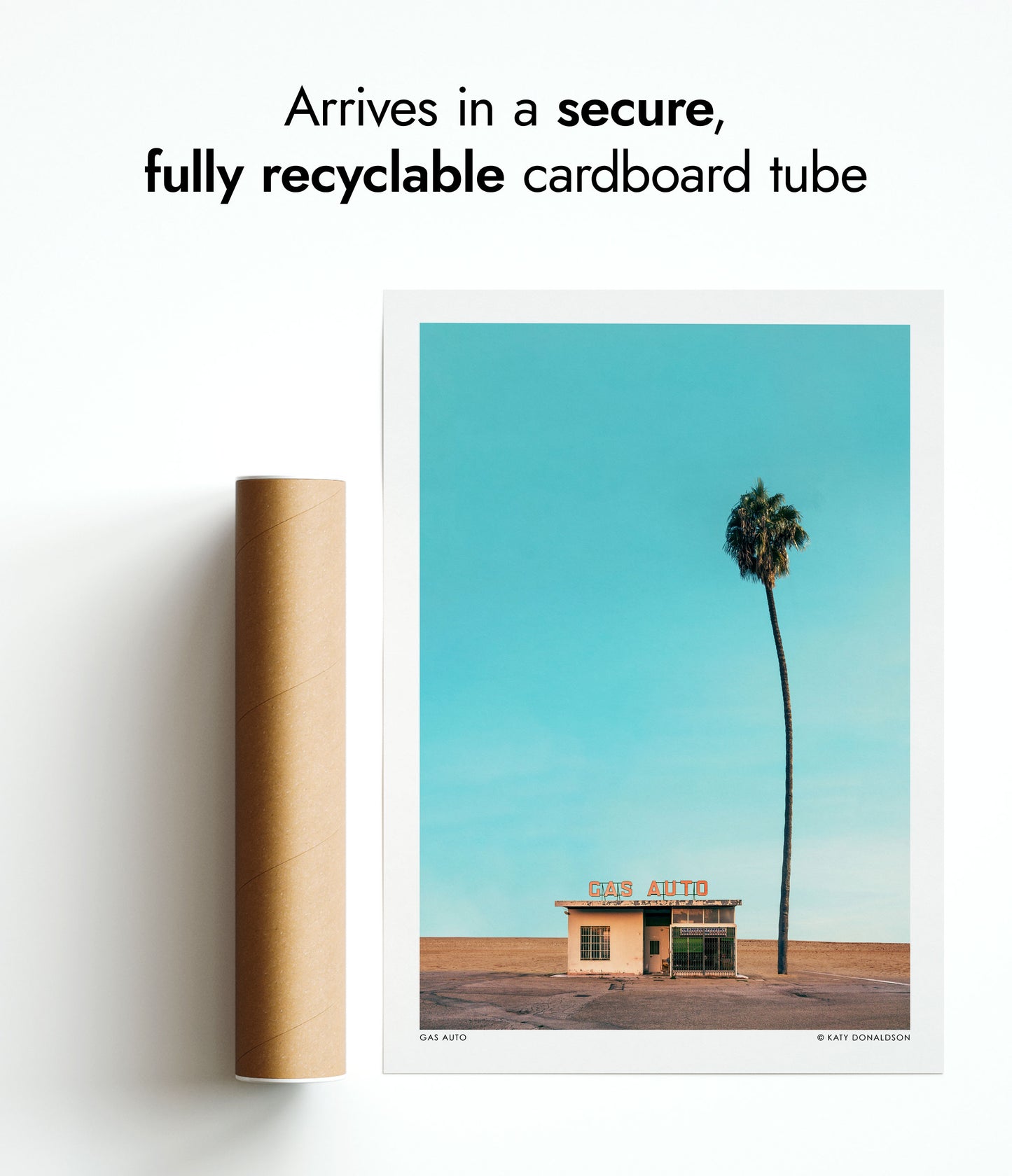 All orders are securely packed in recyclable, eco-friendly solutions. Frames are protected with sustainable bubble wrap alternatives inside thick boxes. Print only orders are shipped in heavy-duty cardboard tubes or protective hard-backed envelopes.