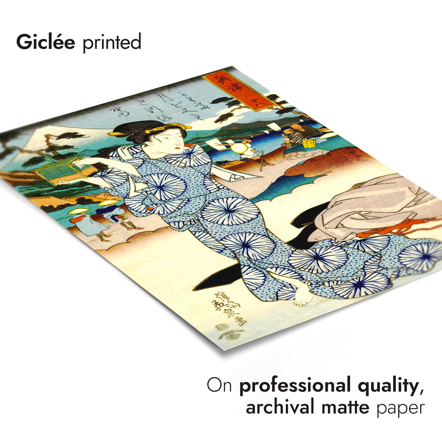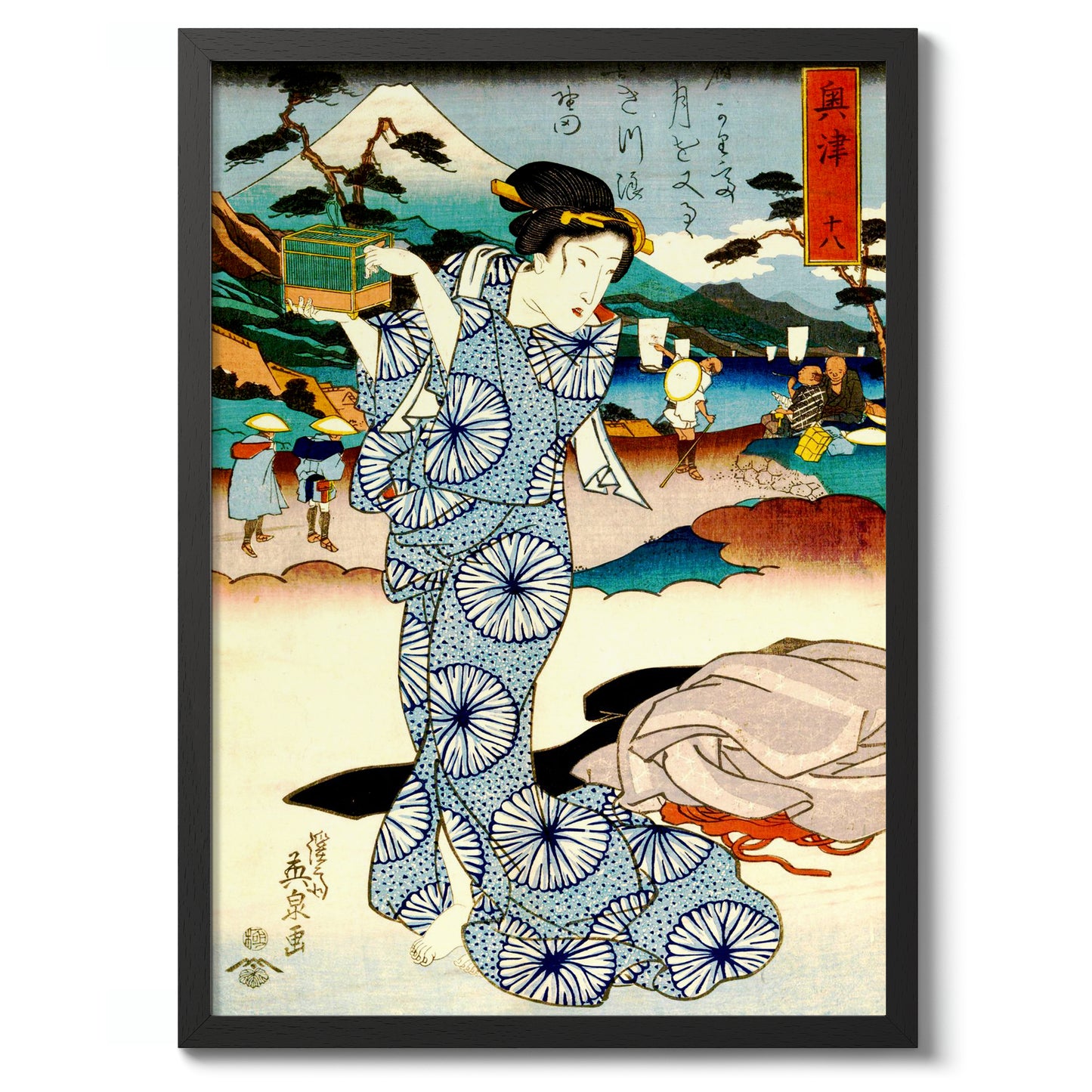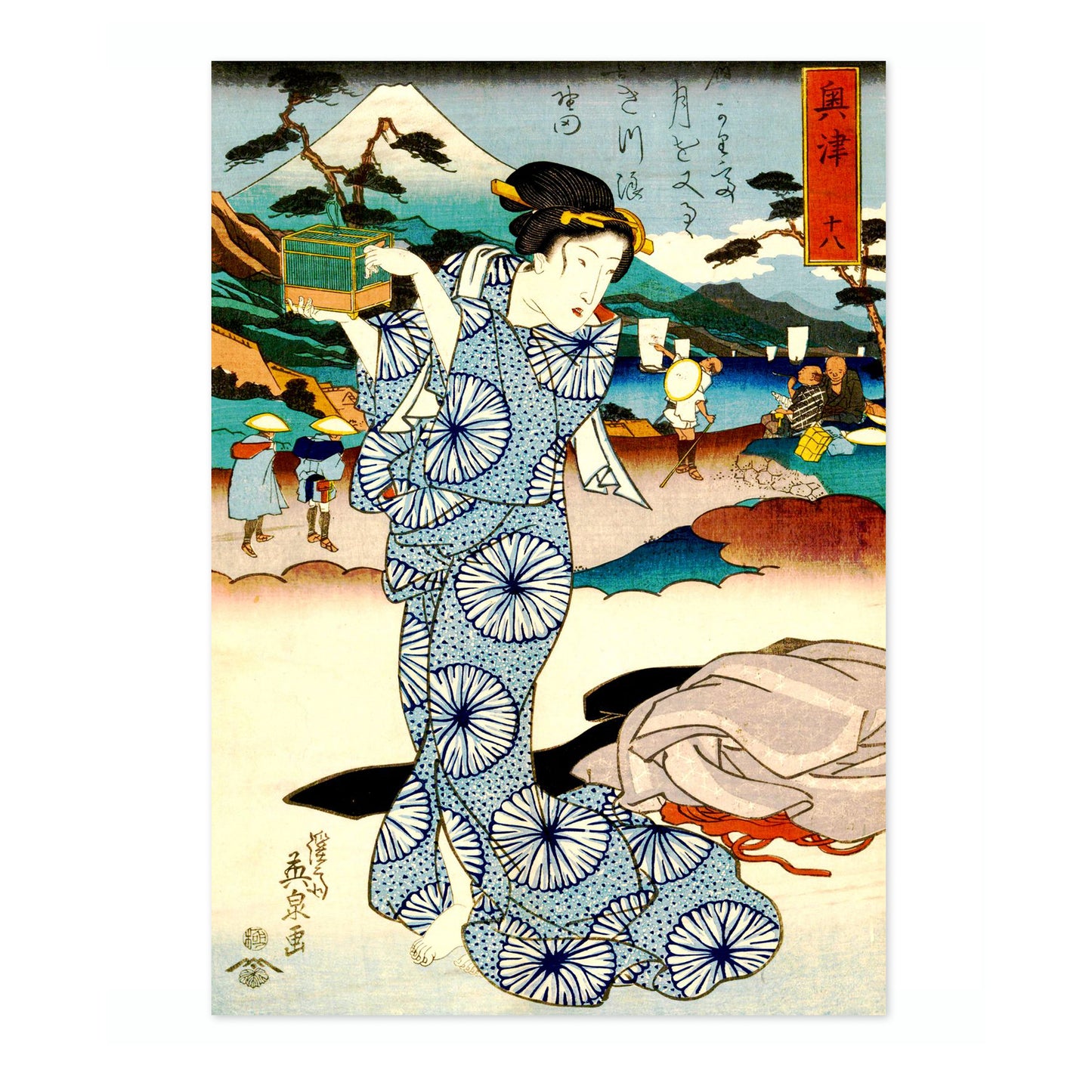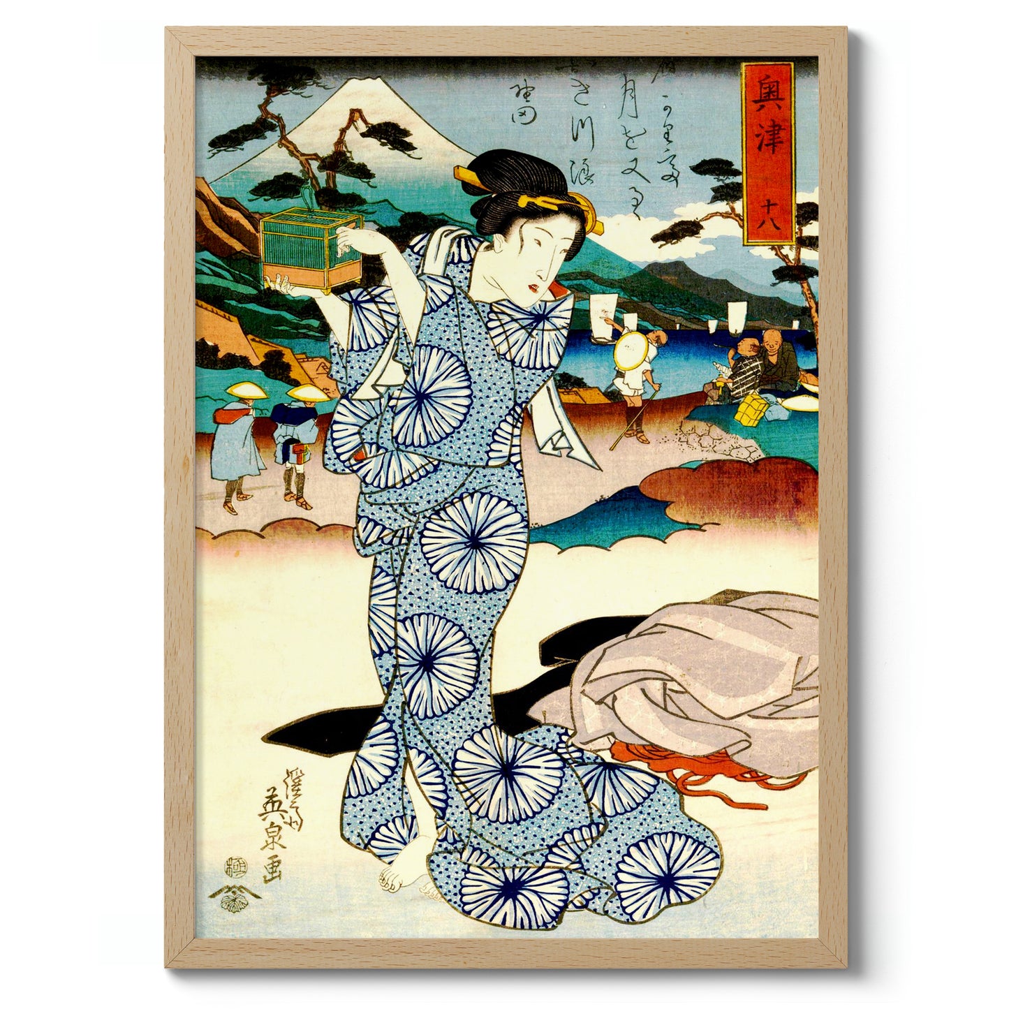 This woodblock poster by Keisai Eisen, titled "Geisha by Fuji," captures the essence of traditional Japanese art. It features a serene geisha in a patterned kimono holding a birdcage, set against the iconic backdrop of Mount Fuji. Delicate script and vibrant colors imbue the scene with cultural depth, embodying the harmony and elegance typical of Japanese portraits.