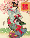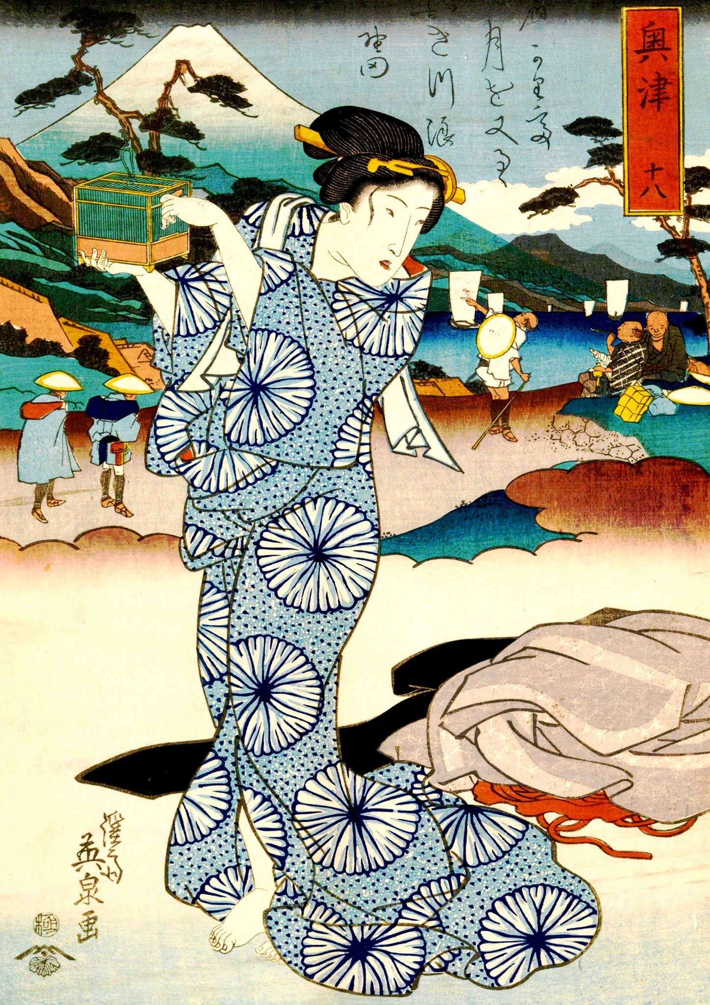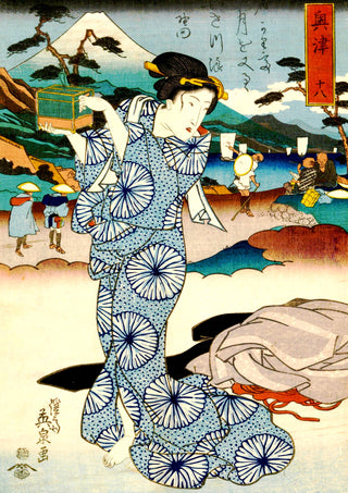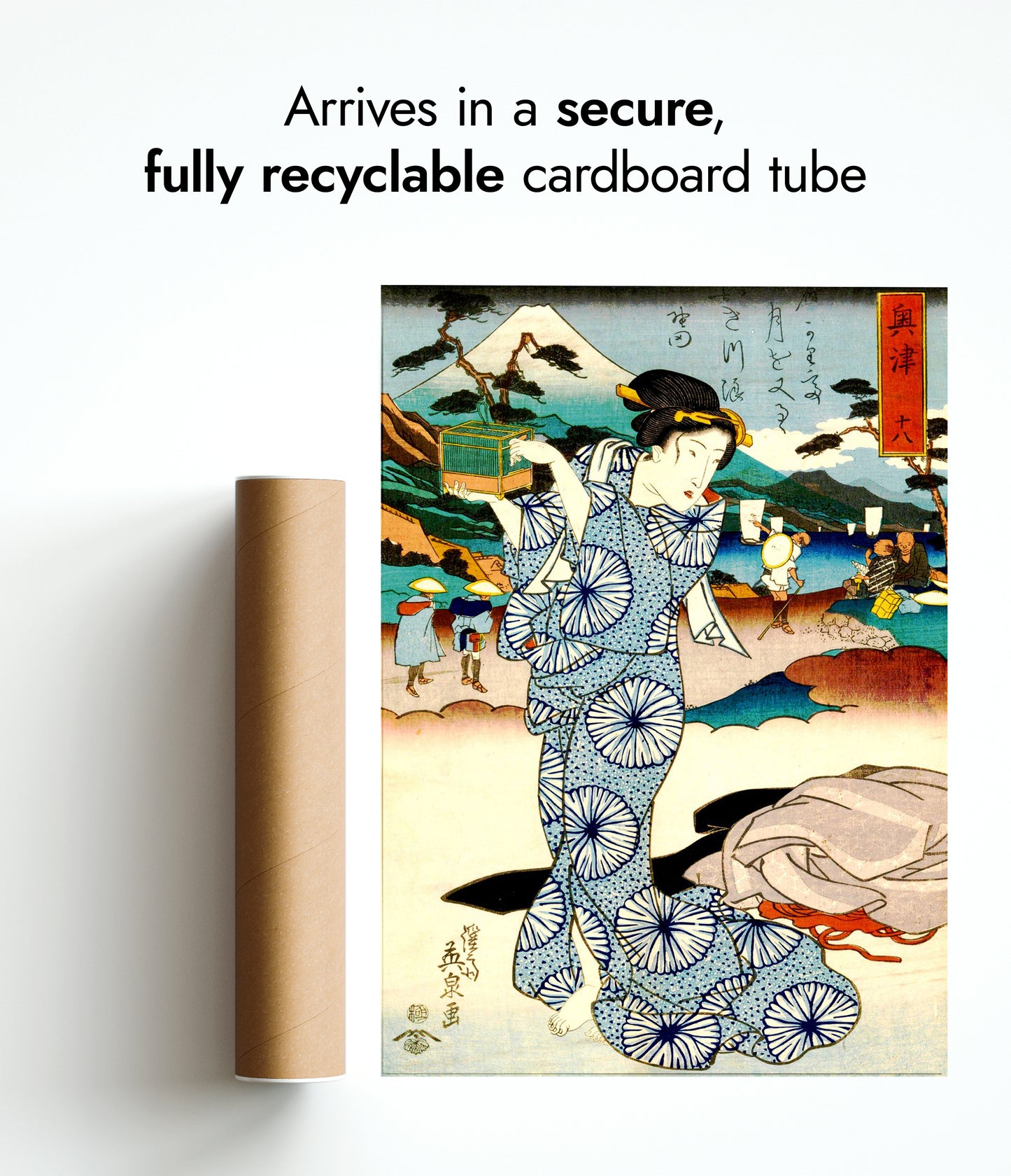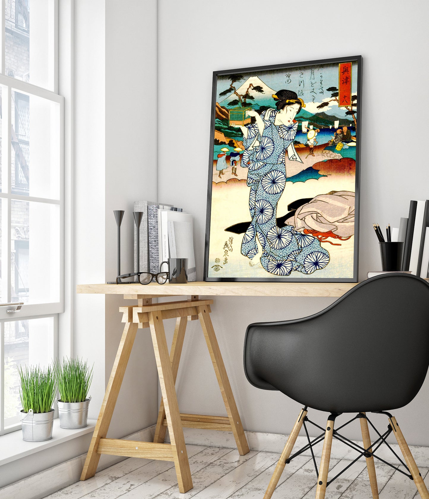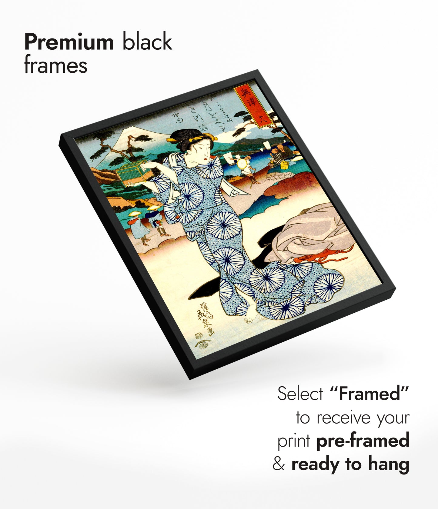This woodblock poster by Keisai Eisen, titled "Geisha by Fuji," captures the essence of traditional Japanese art. It features a serene geisha in a patterned kimono holding a birdcage, set against the iconic backdrop of Mount Fuji. Delicate script and vibrant colors imbue the scene with cultural depth, embodying the harmony and elegance typical of Japanese portraits.