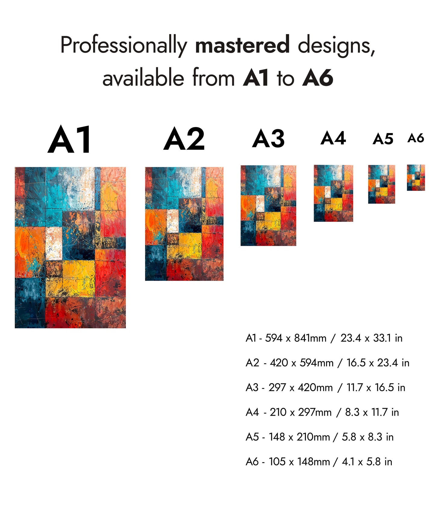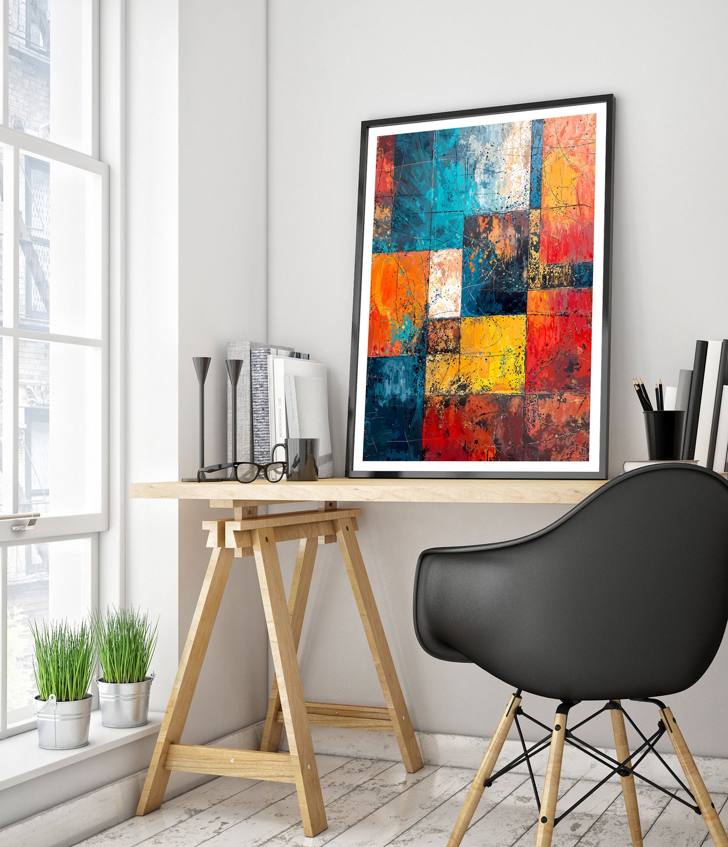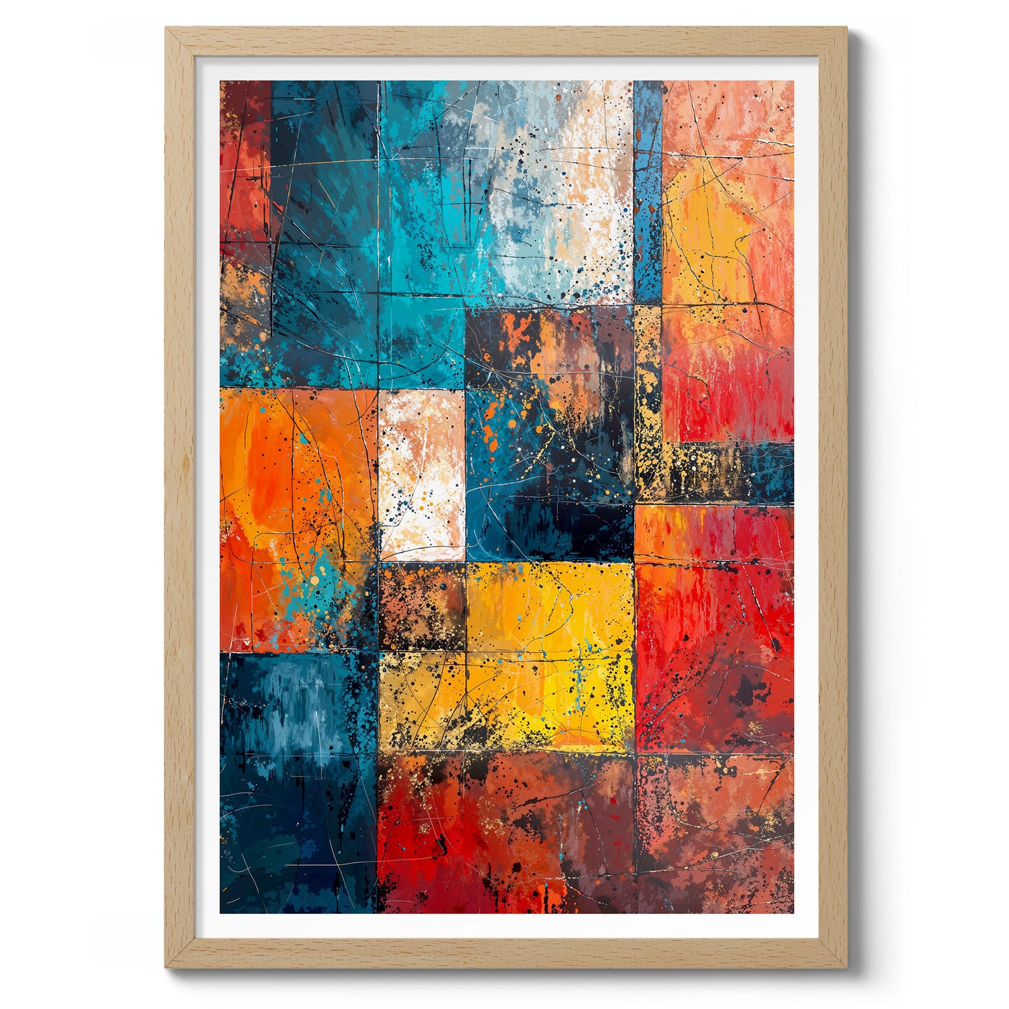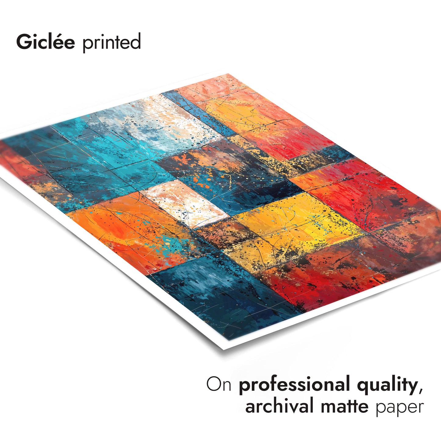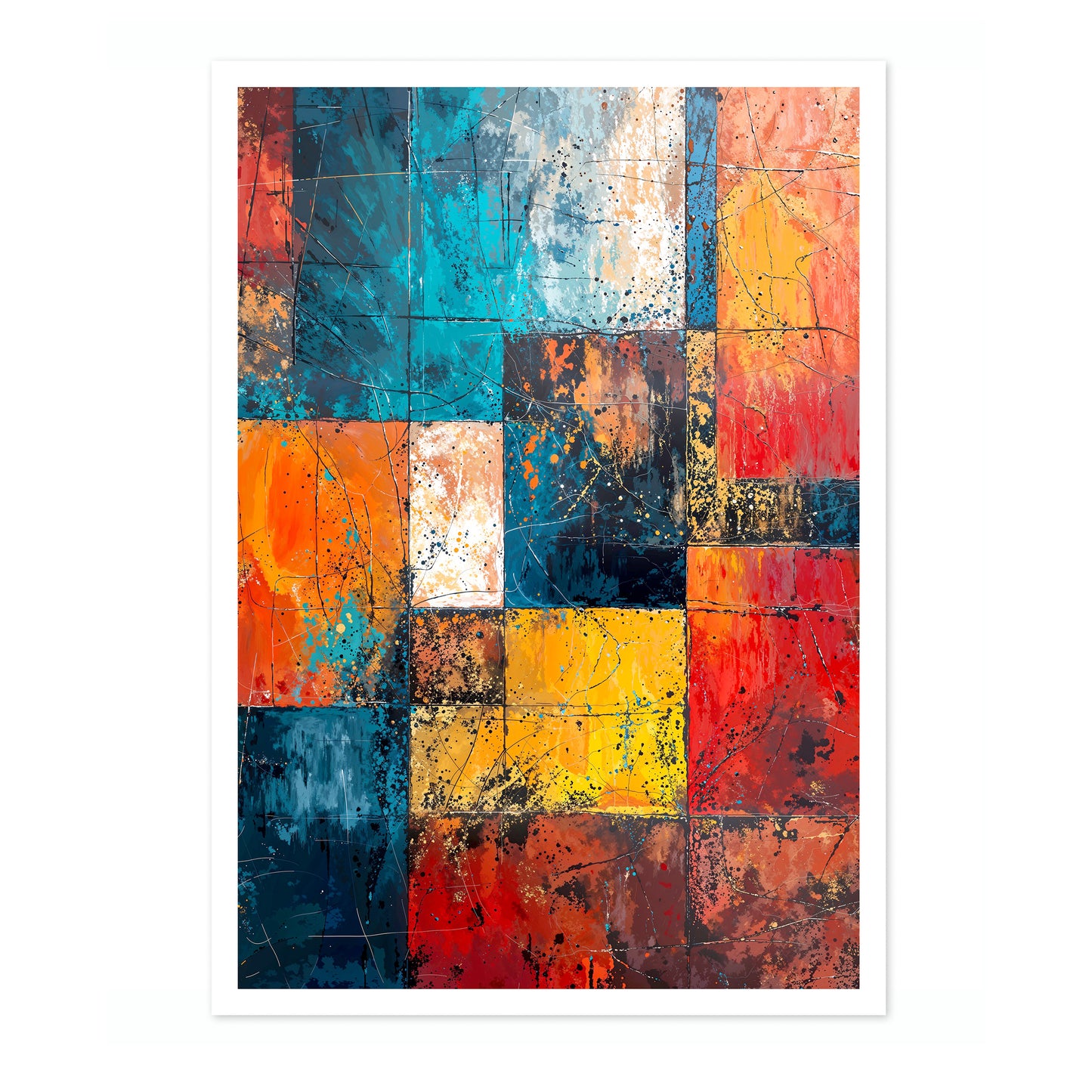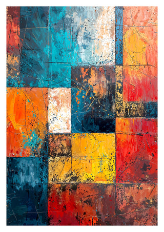 The "Geometric Portrait, I" abstract poster features a captivating blend of vibrant geometric shapes in blues, reds, yellows, and oranges. This painting utilizes a dynamic arrangement of squares and rectangles, creating a visually stimulating, layered effect. Perfect for lovers of modern abstract art, this piece adds an artistic flair to any room with its bold, colourful composition.