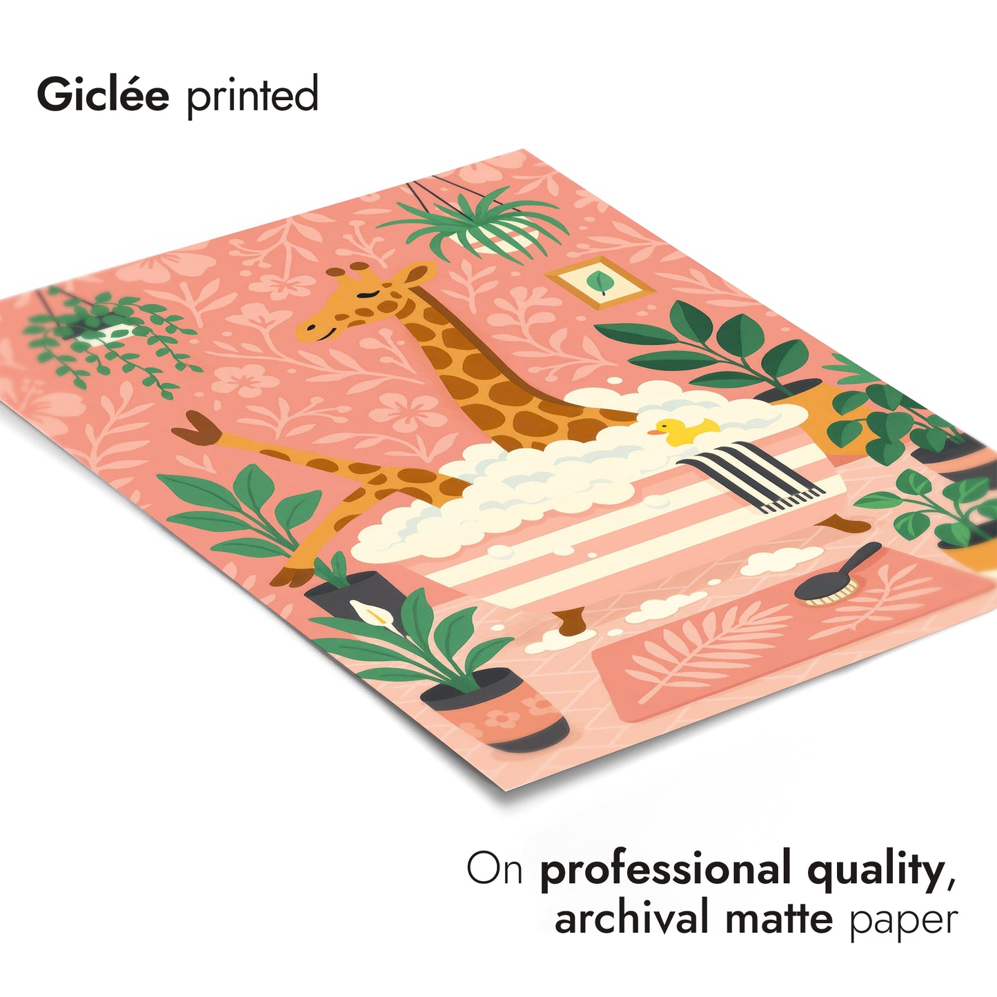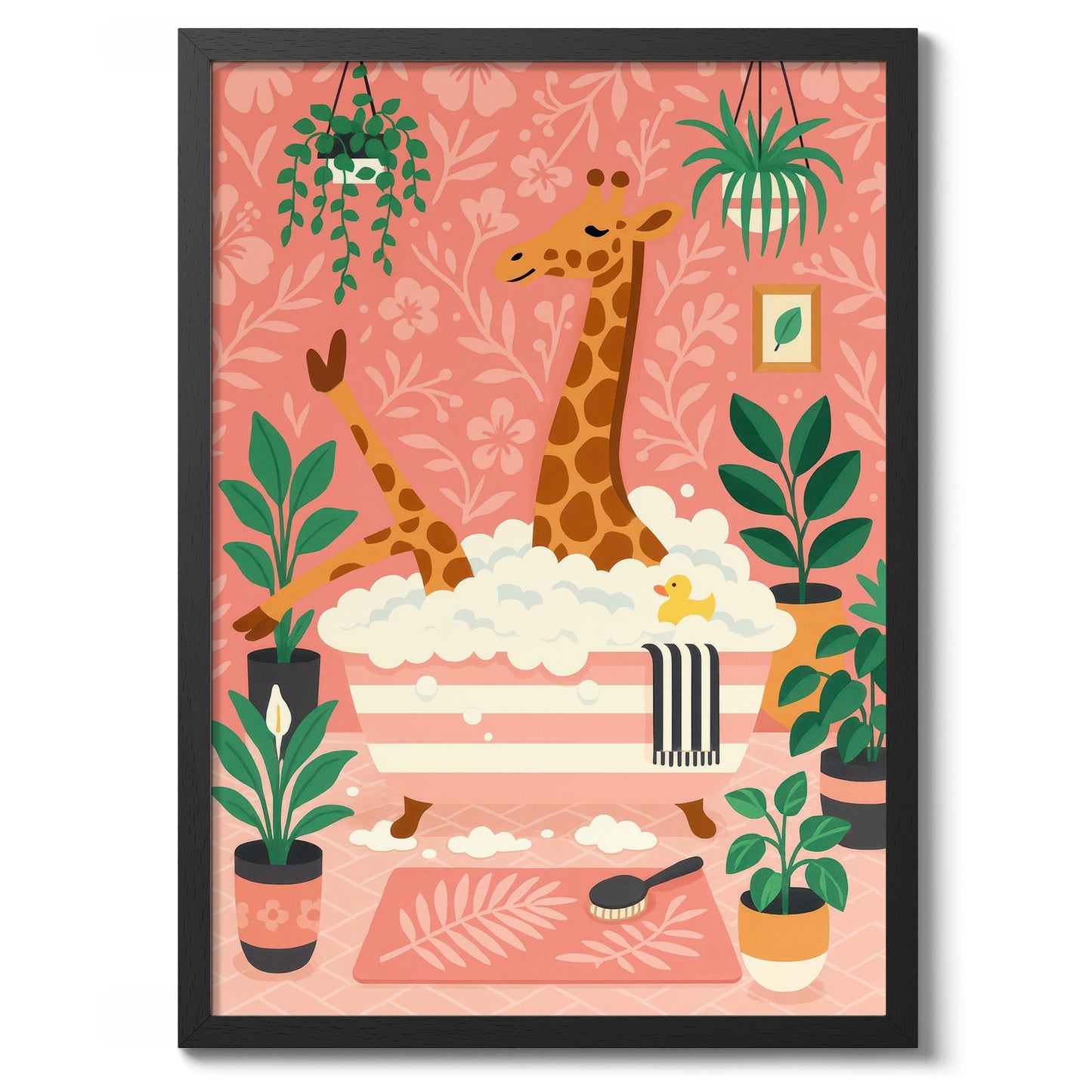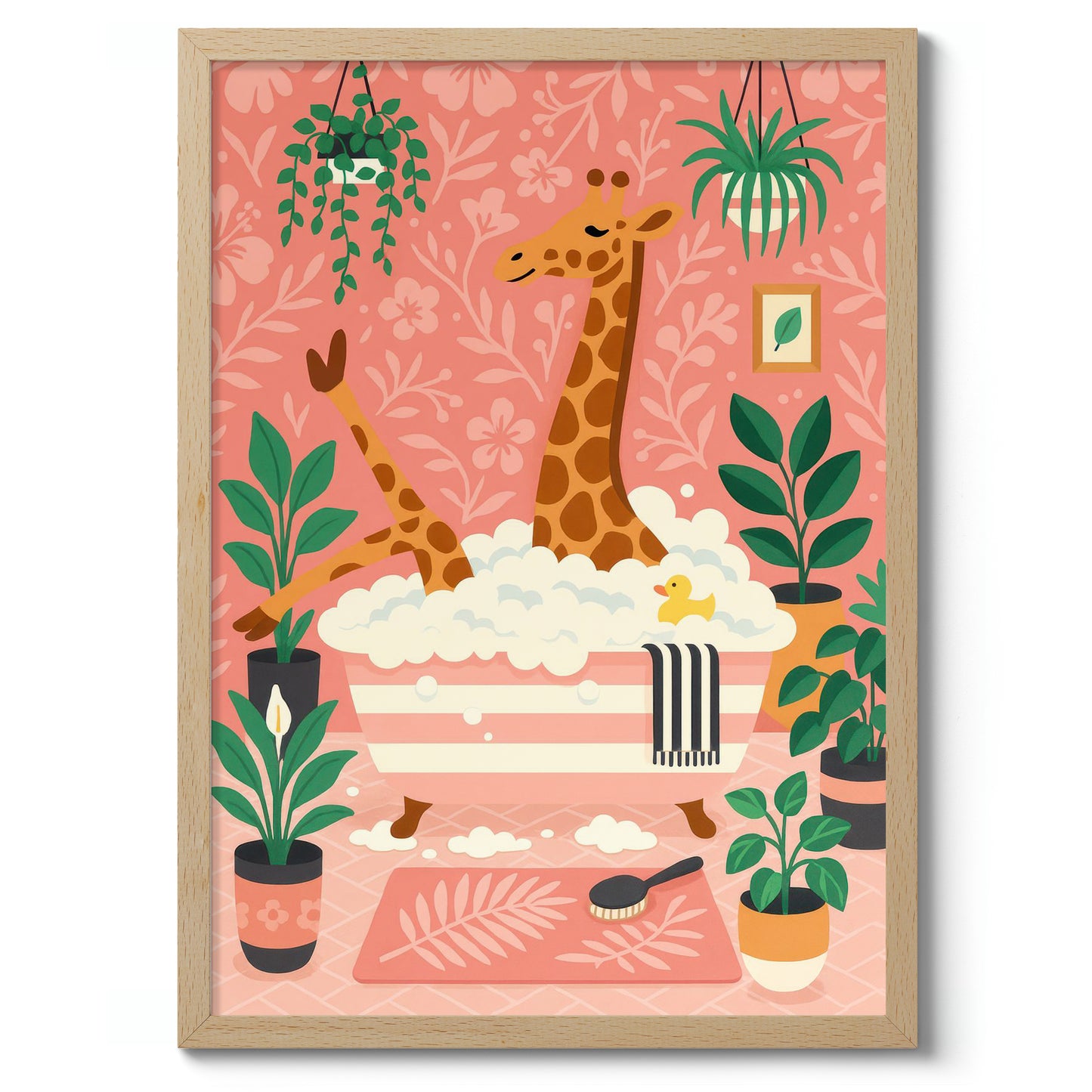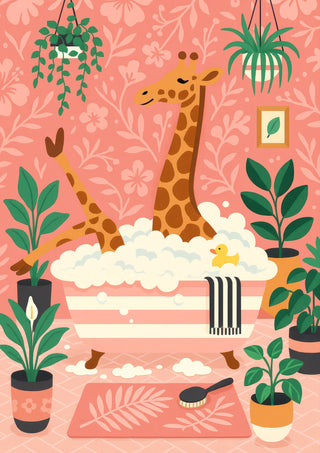 This playful poster titled "Giraffe Bath" features a whimsical scene of a giraffe enjoying a bubble bath amidst lush greenery. Set against a pastel pink background adorned with floral patterns, the illustration captures a cozy atmosphere with charming details like a rubber duck and houseplants. Perfect for adding a touch of fun to a bathroom or children's room decor.