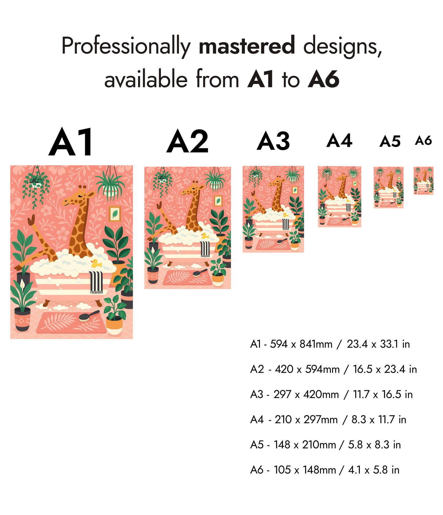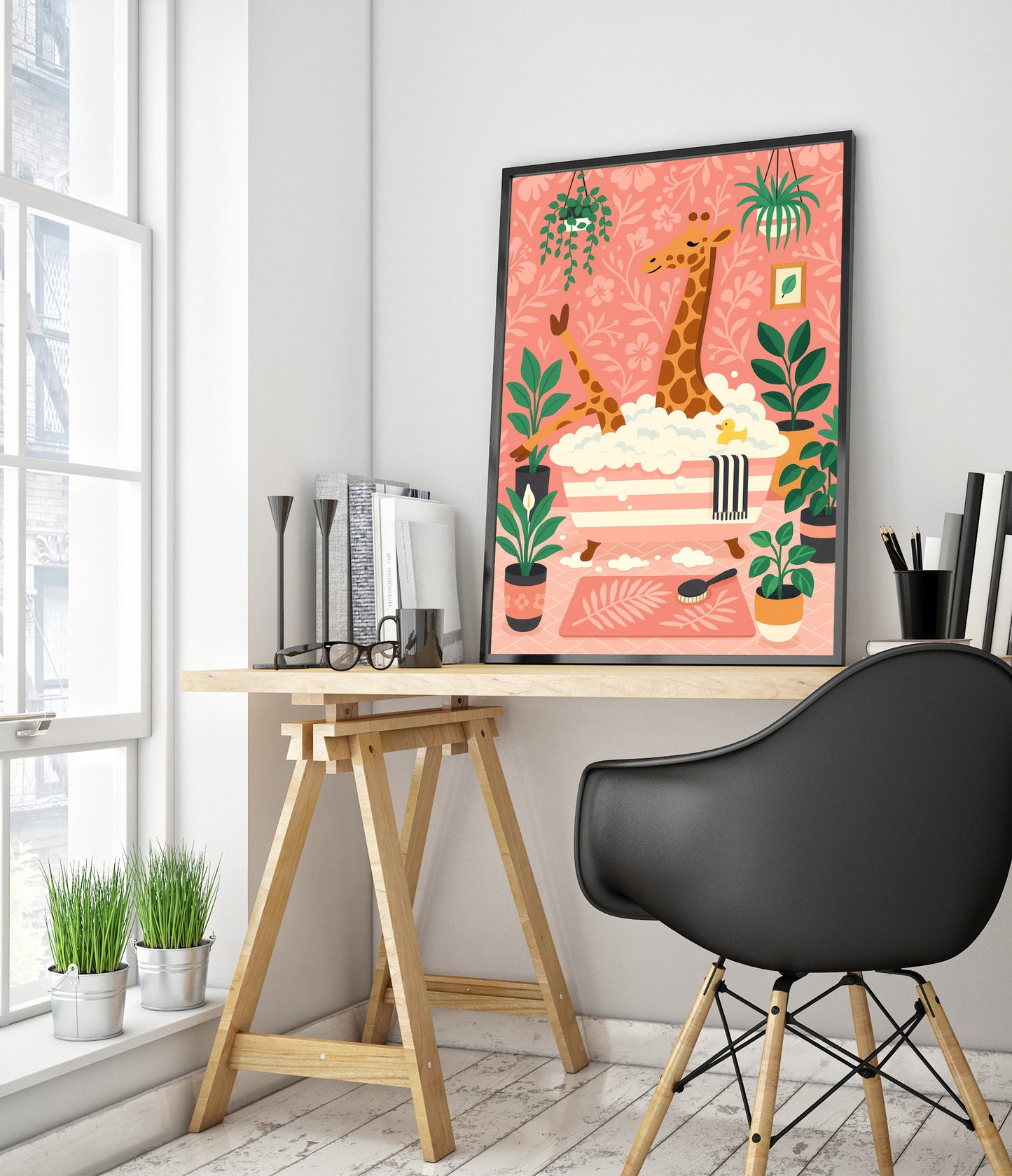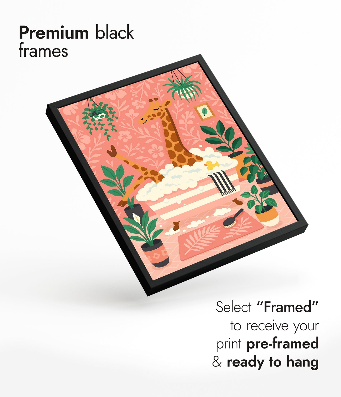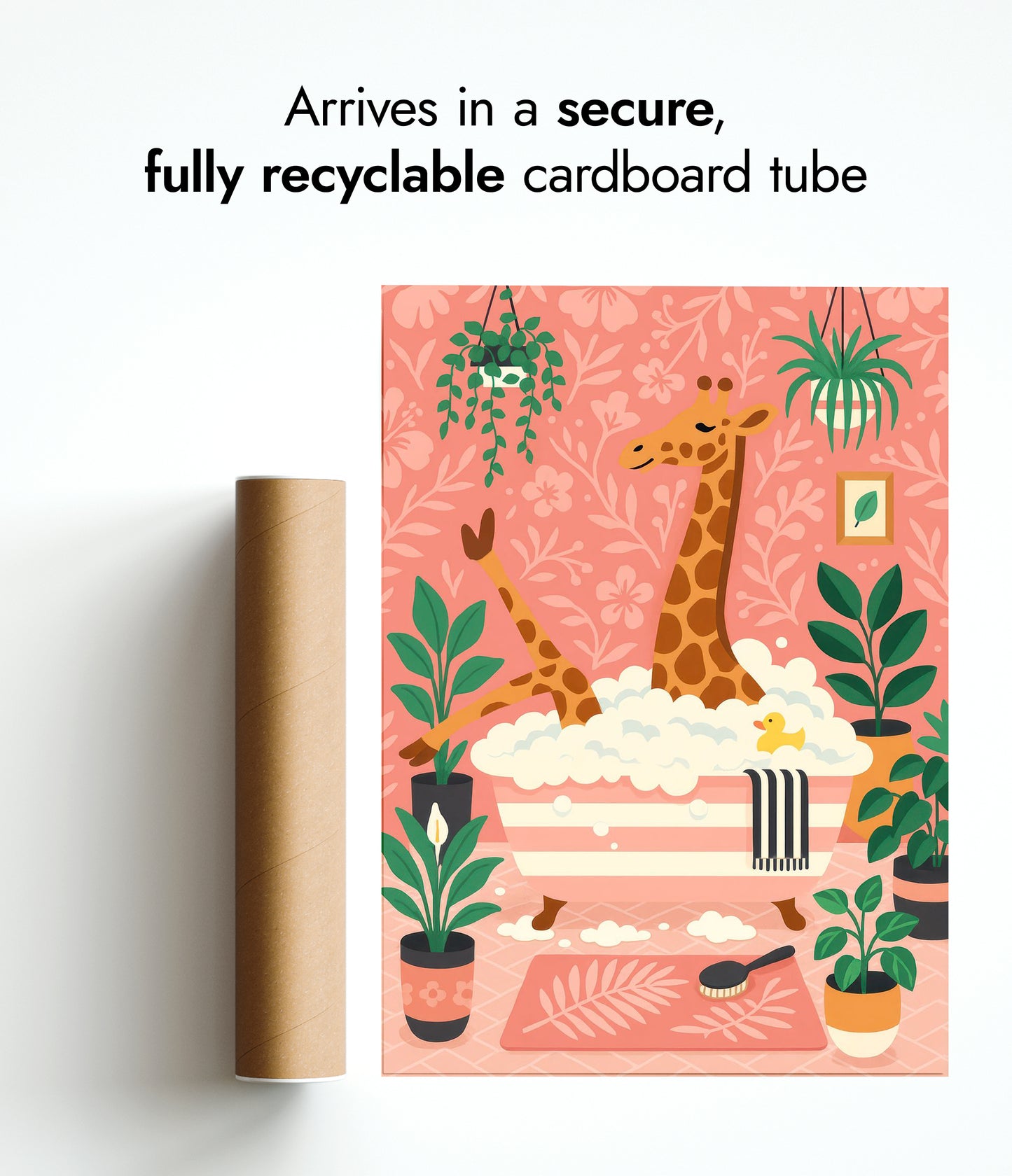 This playful poster titled "Giraffe Bath" features a whimsical scene of a giraffe enjoying a bubble bath amidst lush greenery. Set against a pastel pink background adorned with floral patterns, the illustration captures a cozy atmosphere with charming details like a rubber duck and houseplants. Perfect for adding a touch of fun to a bathroom or children's room decor.