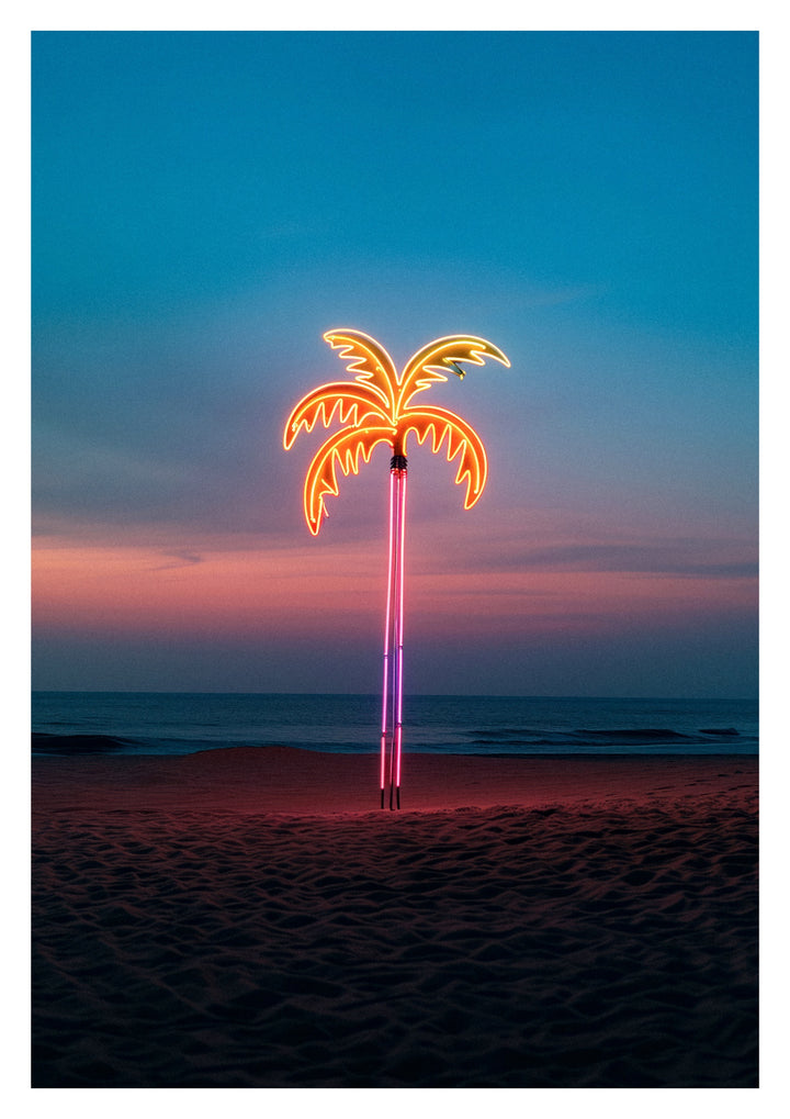 "Glowing Palm" is a striking portrait poster capturing a neon palm tree sign against a serene beach backdrop at twilight. The vibrant, illuminated tree contrasts sharply with the dimming sky, creating a visually captivating and modern artwork. Ideal for adding a touch of contemporary flair to any space, this piece exemplifies neon photography and coastal themes.