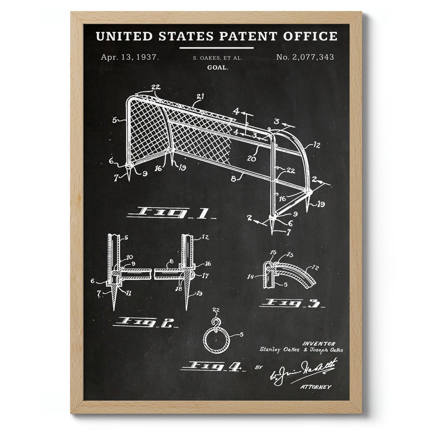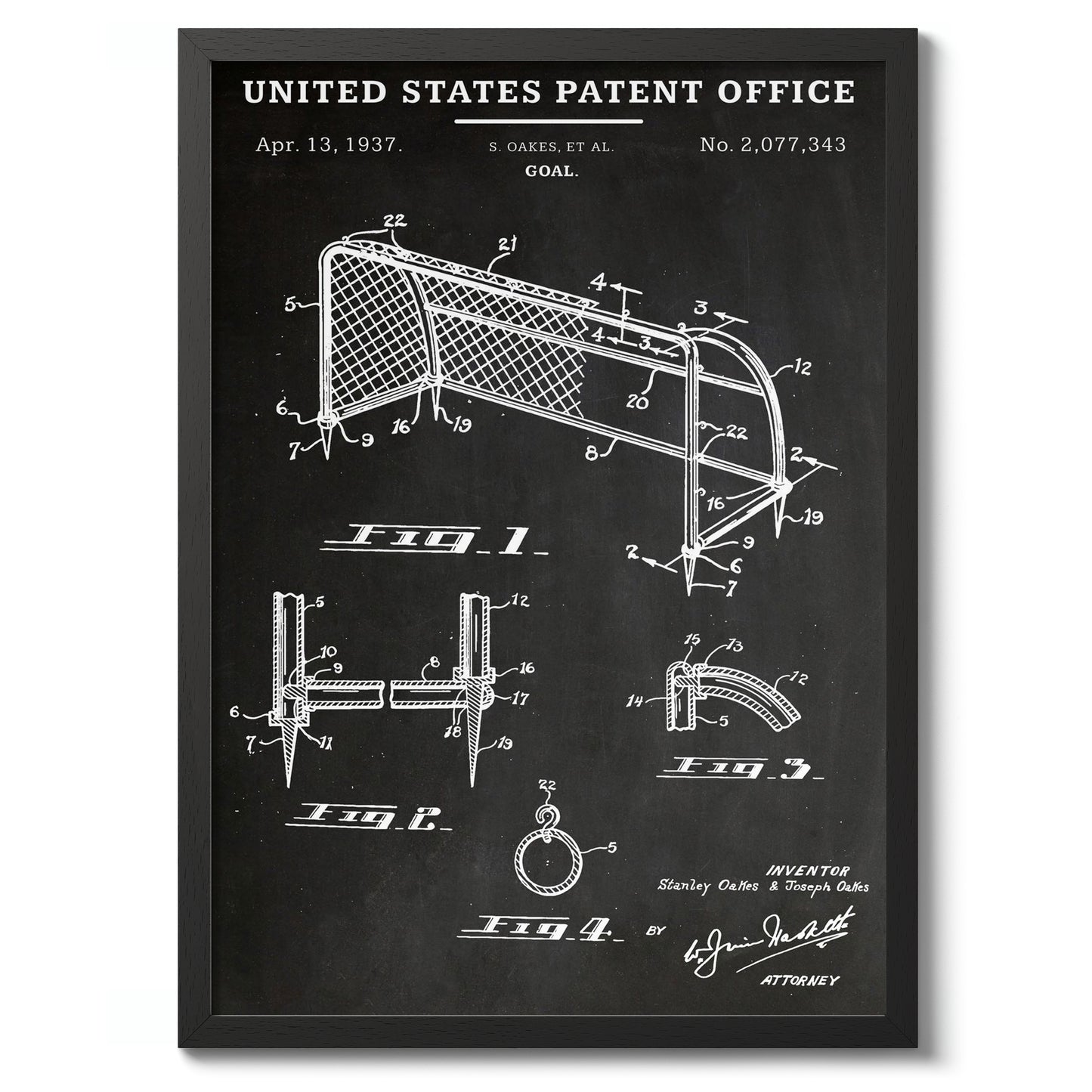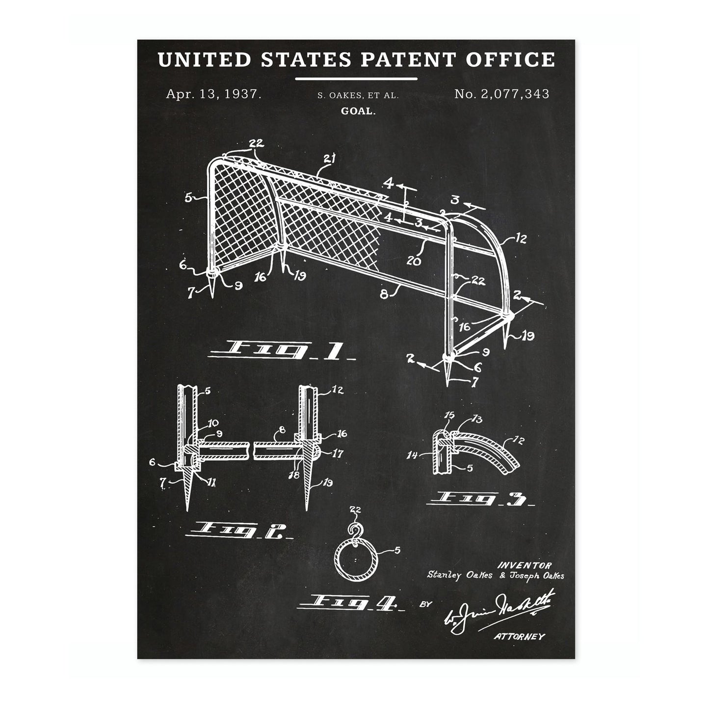 This vintage patent poster from 1937 showcases a detailed schematic of a football goal, presented in classic black and white line art. The illustration features technical drawings and annotations, capturing the intricate design specifications. Ideal for sports enthusiasts and fans of historical designs, this art print adds a touch of nostalgia and sophistication to any decor.