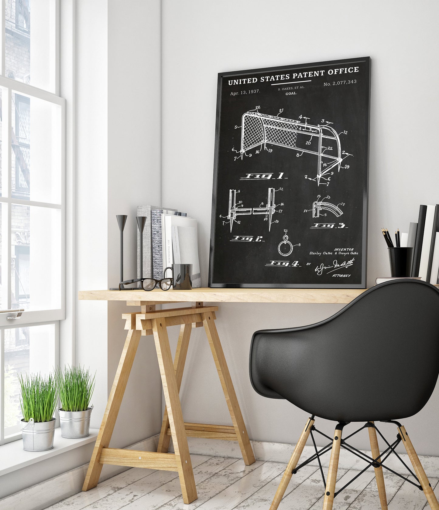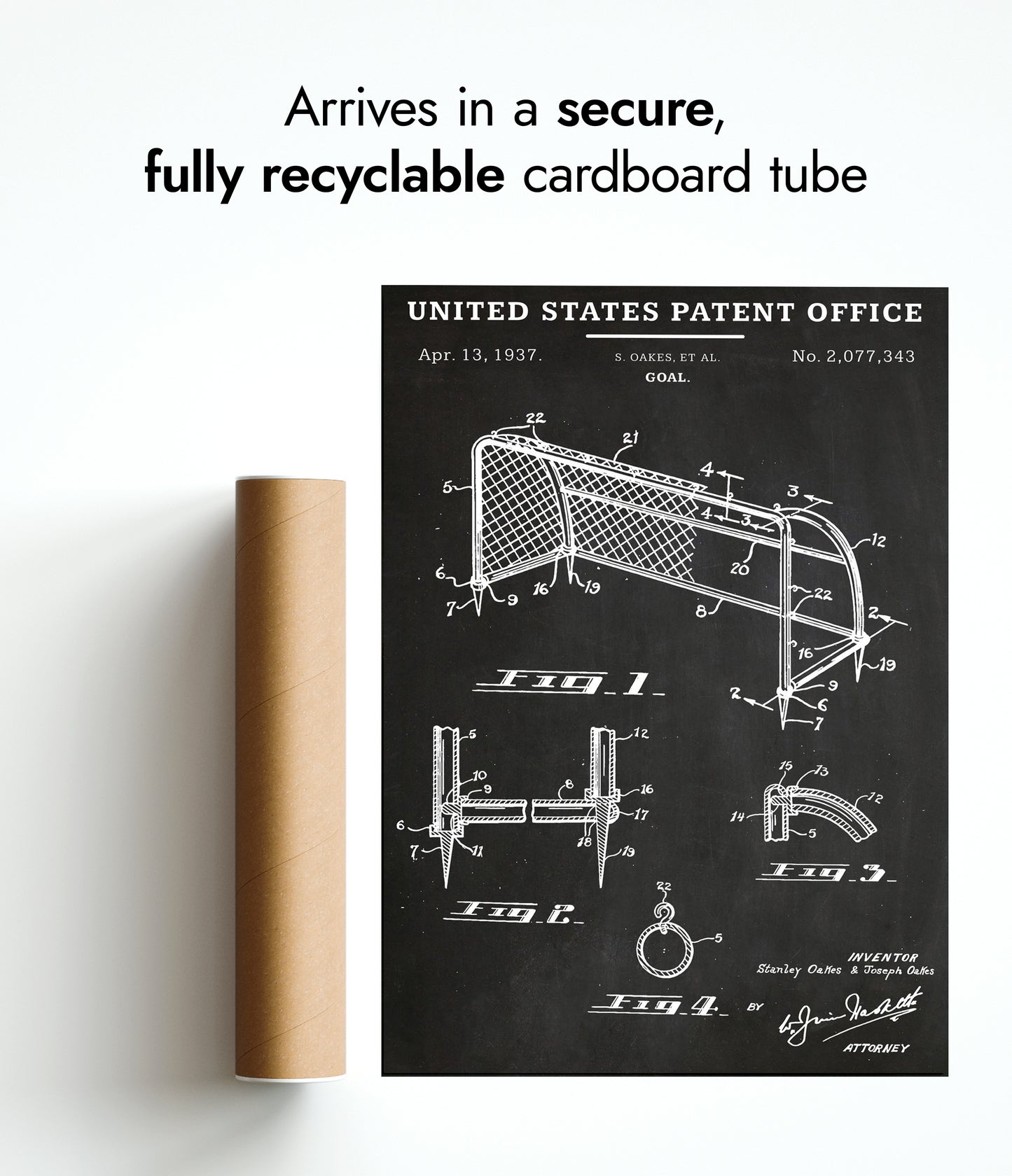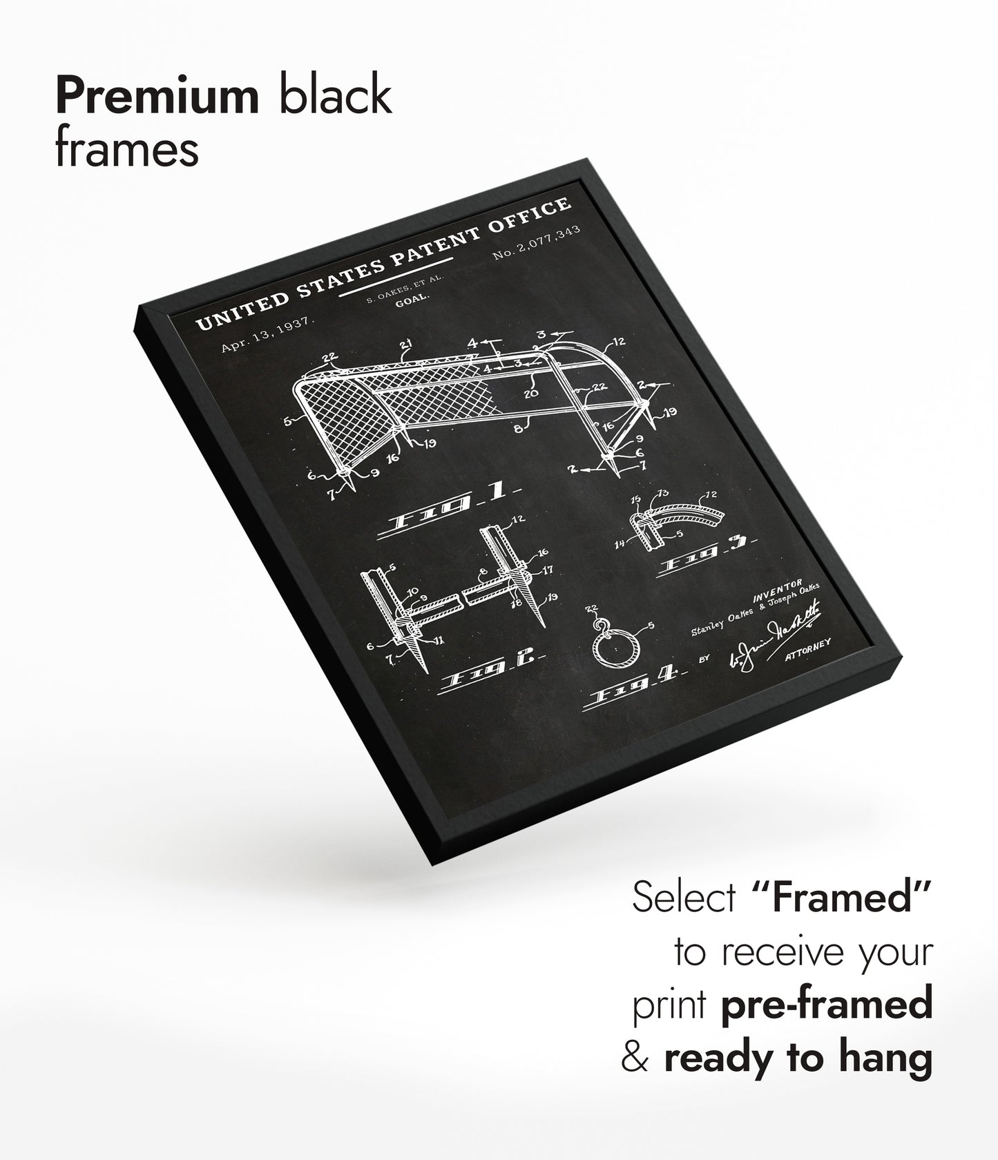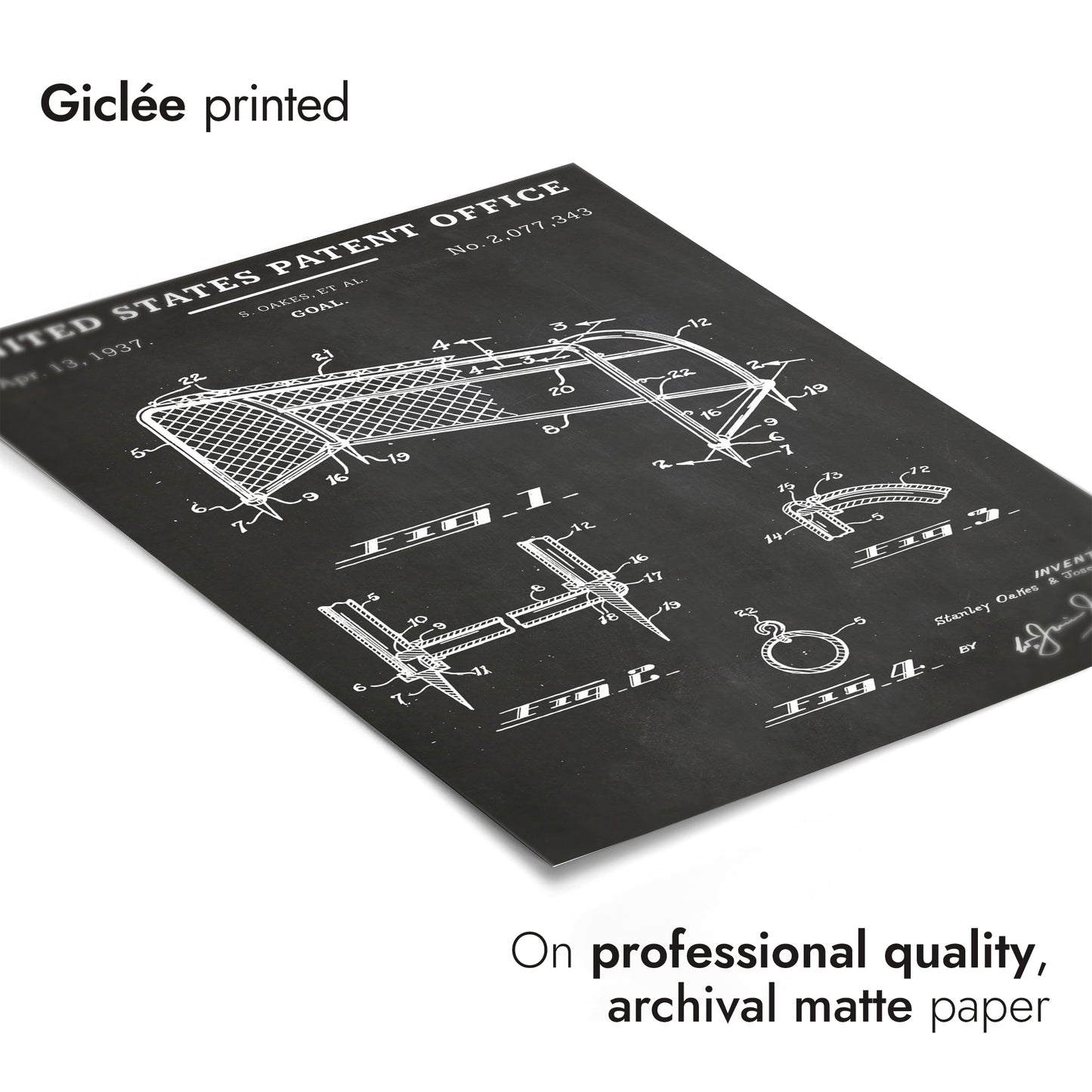 This vintage patent poster from 1937 showcases a detailed schematic of a football goal, presented in classic black and white line art. The illustration features technical drawings and annotations, capturing the intricate design specifications. Ideal for sports enthusiasts and fans of historical designs, this art print adds a touch of nostalgia and sophistication to any decor.