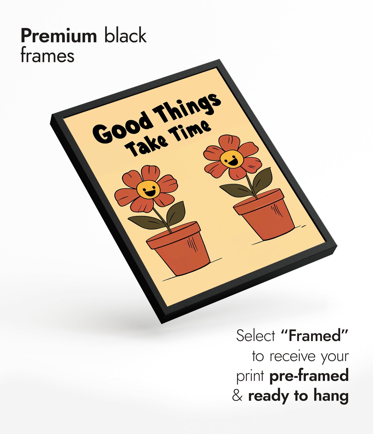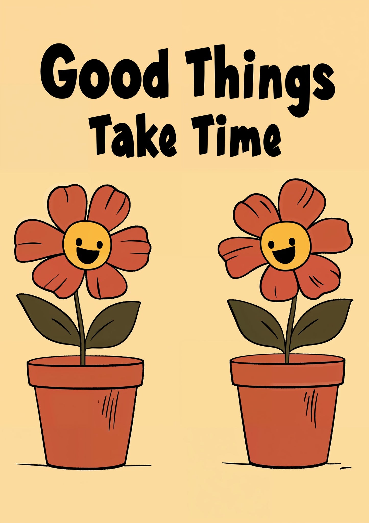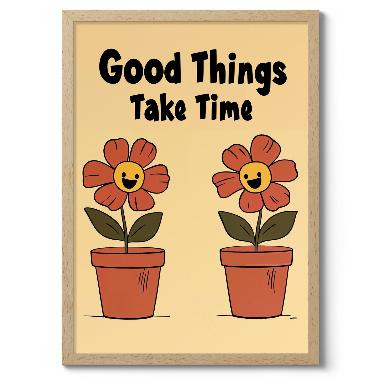 This charming poster features two cheerful orange flowers in pots, personified with smiling faces, under the bold words "Good Things Take Time." Illustrated in a retro, cartoon style, it combines typography with playful floral mascots, creating a whimsical and uplifting atmosphere. Perfect for adding a touch of positivity to your home or office space.