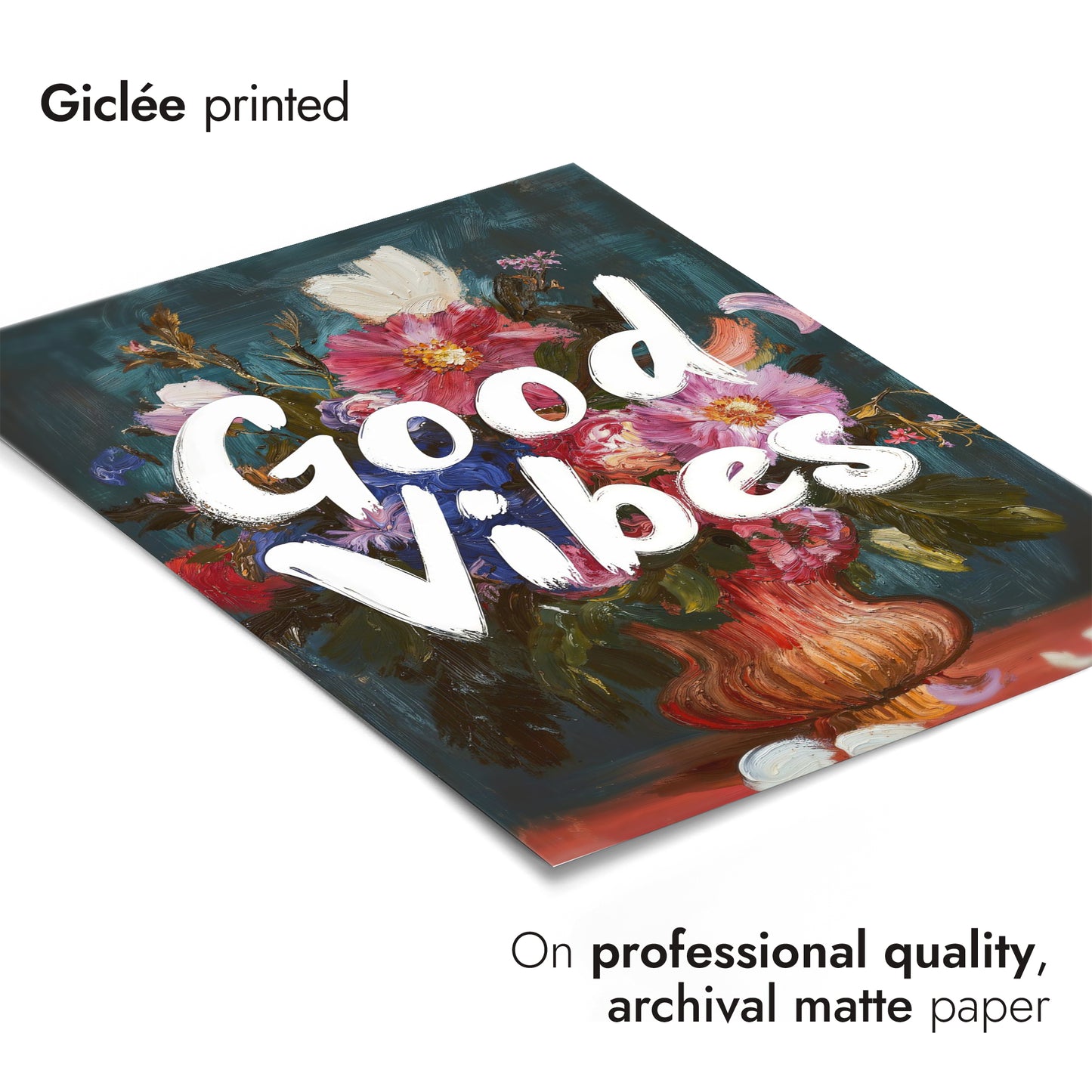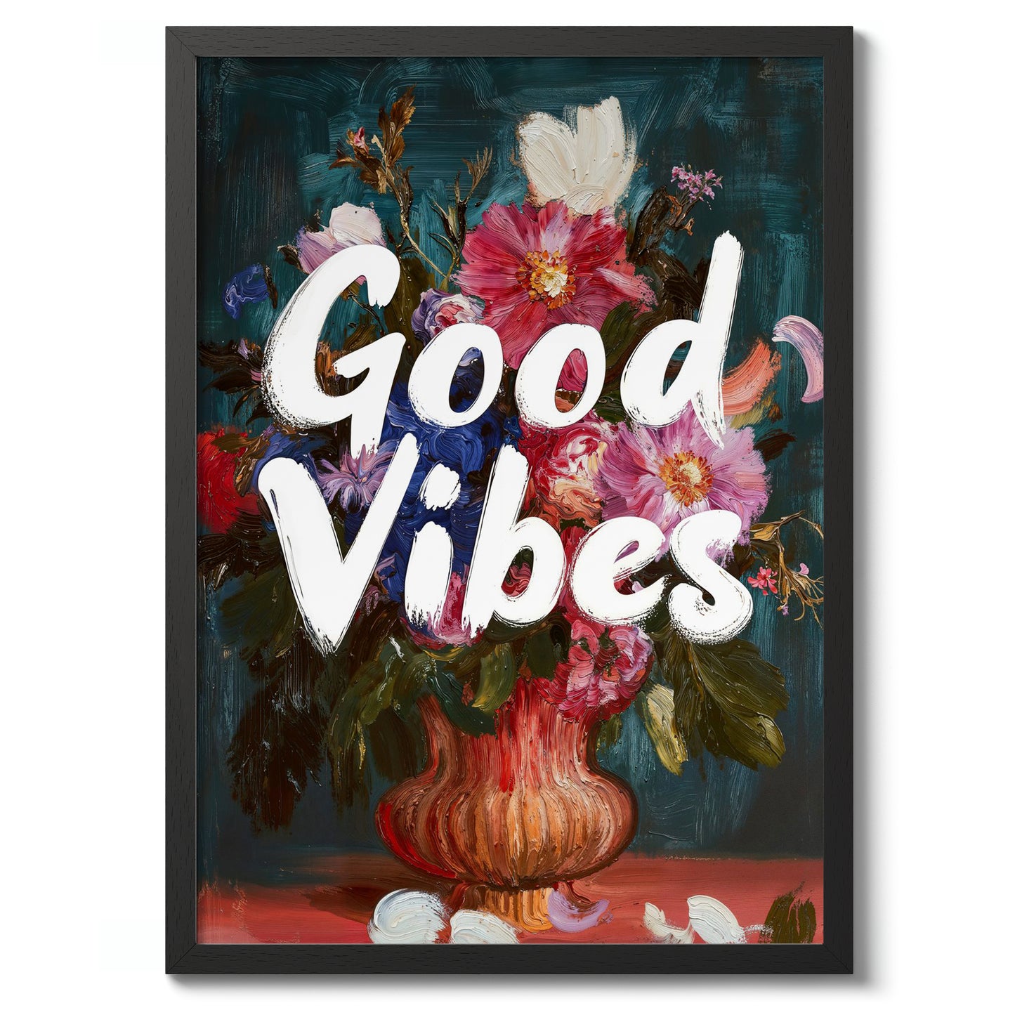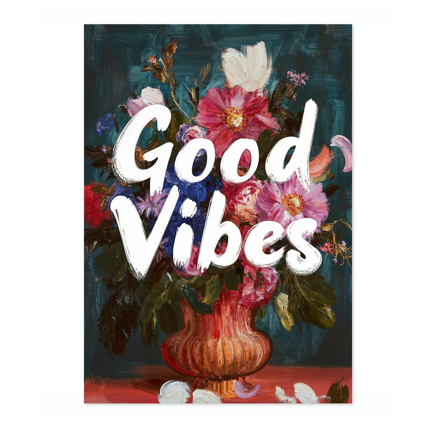 The "Good Vibes" poster features a vibrant bouquet of flowers in a classic vase, overlaid with bold, textured typography that reads "Good Vibes." This art print combines the elegance of vintage floral paintings with modern graphic elements, creating an inspirational centerpiece perfect for uplifting any space. Ideal for those seeking a typographic touch with a burst of color.