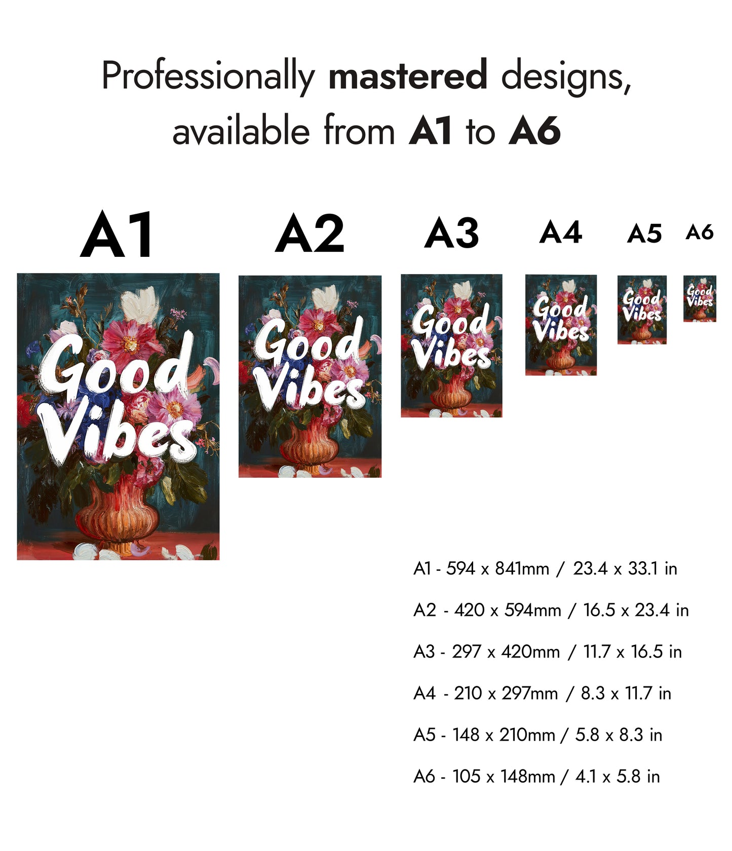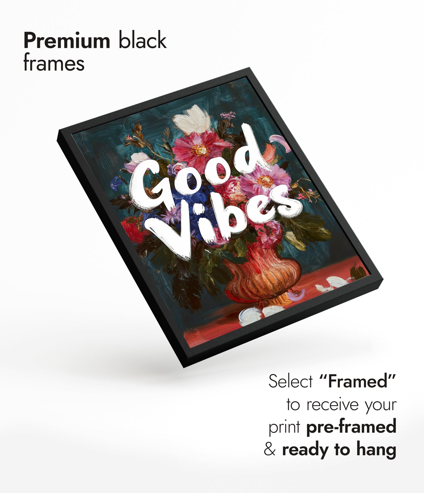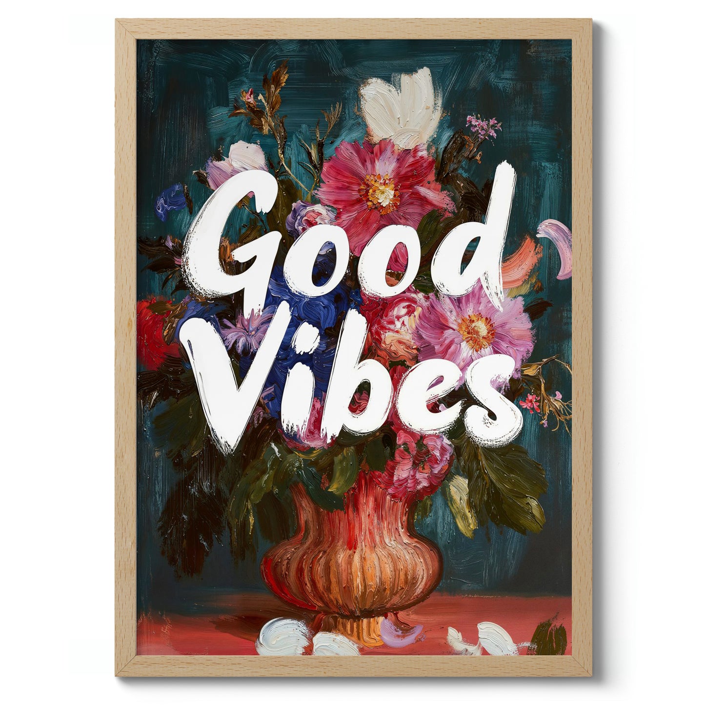The "Good Vibes" poster features a vibrant bouquet of flowers in a classic vase, overlaid with bold, textured typography that reads "Good Vibes." This art print combines the elegance of vintage floral paintings with modern graphic elements, creating an inspirational centerpiece perfect for uplifting any space. Ideal for those seeking a typographic touch with a burst of color.