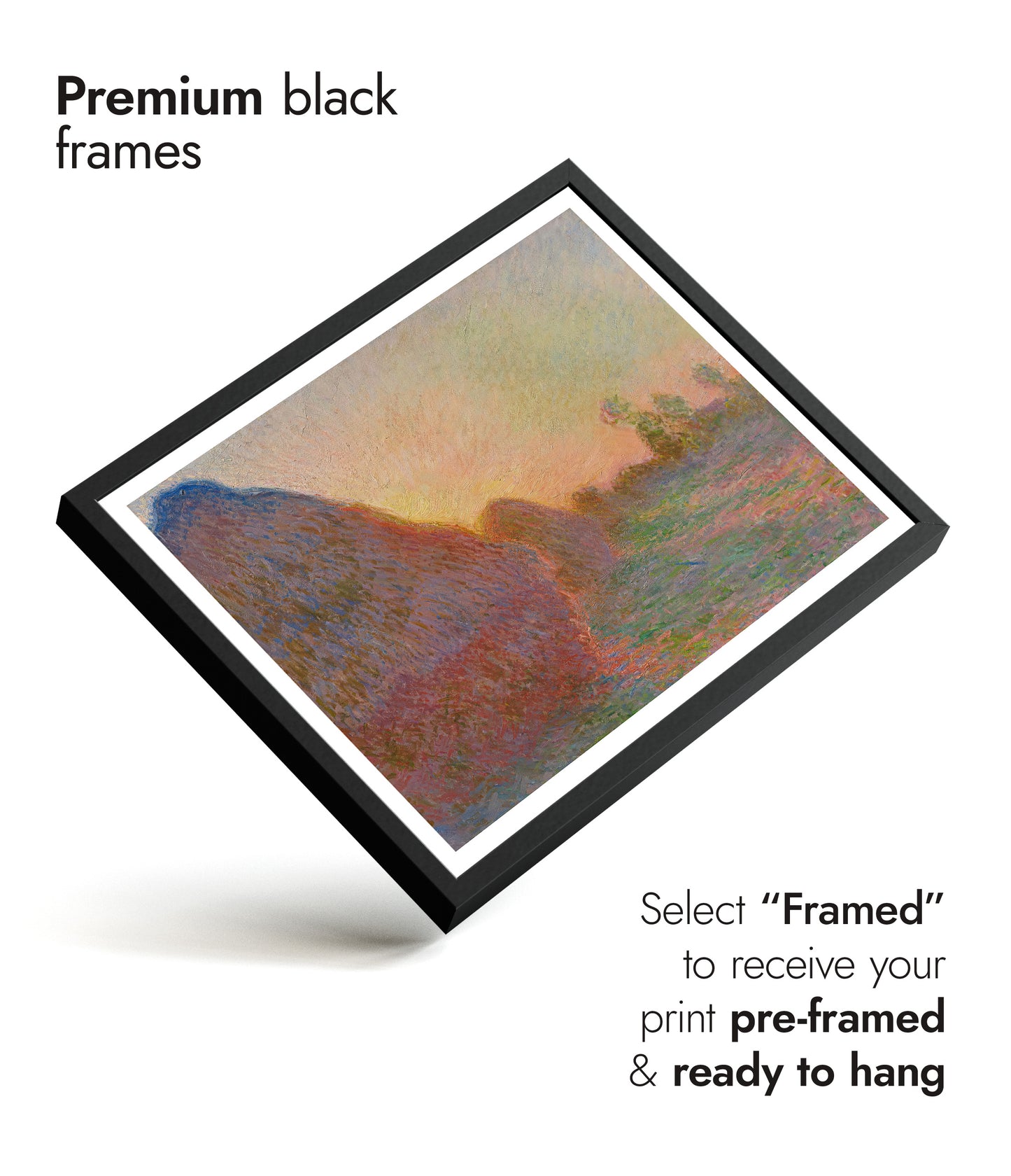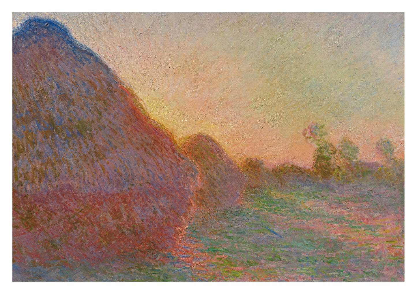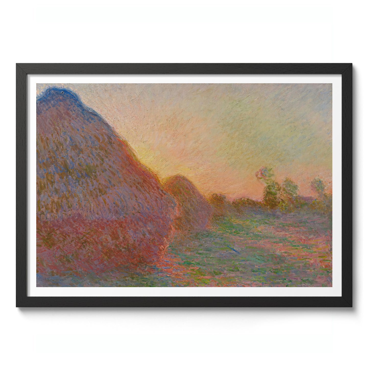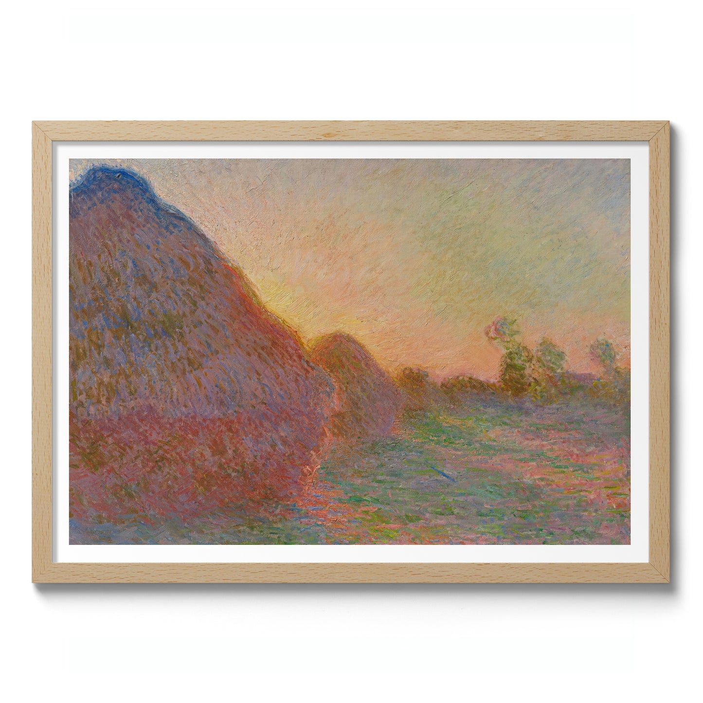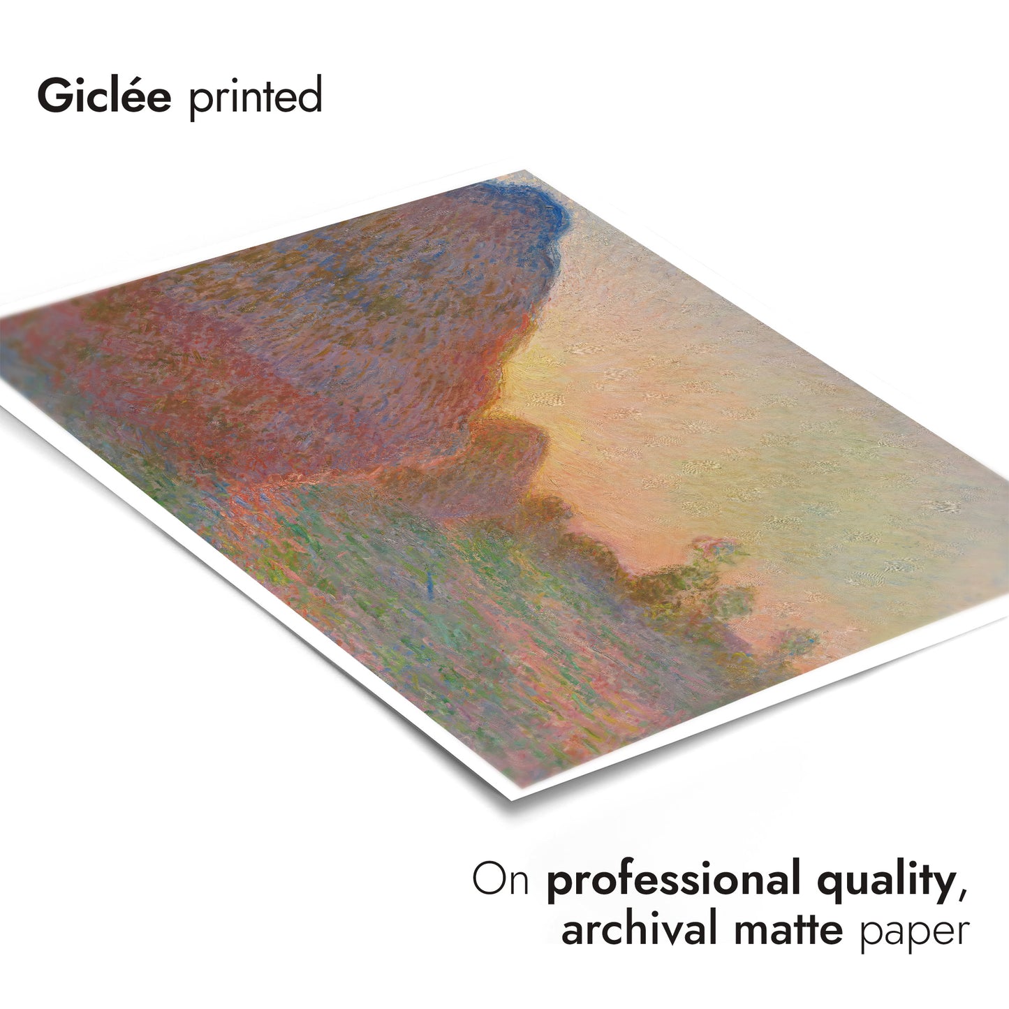 Claude Monet's "Grainstacks" poster captures the serene beauty of grain stacks bathed in the soft, warm glow of a sunset. This Impressionist landscape painting showcases Monet's characteristic brushstrokes and mastery of light. Perfect for those who appreciate rural and countryside themes, this art print will add a touch of timeless elegance to any space.