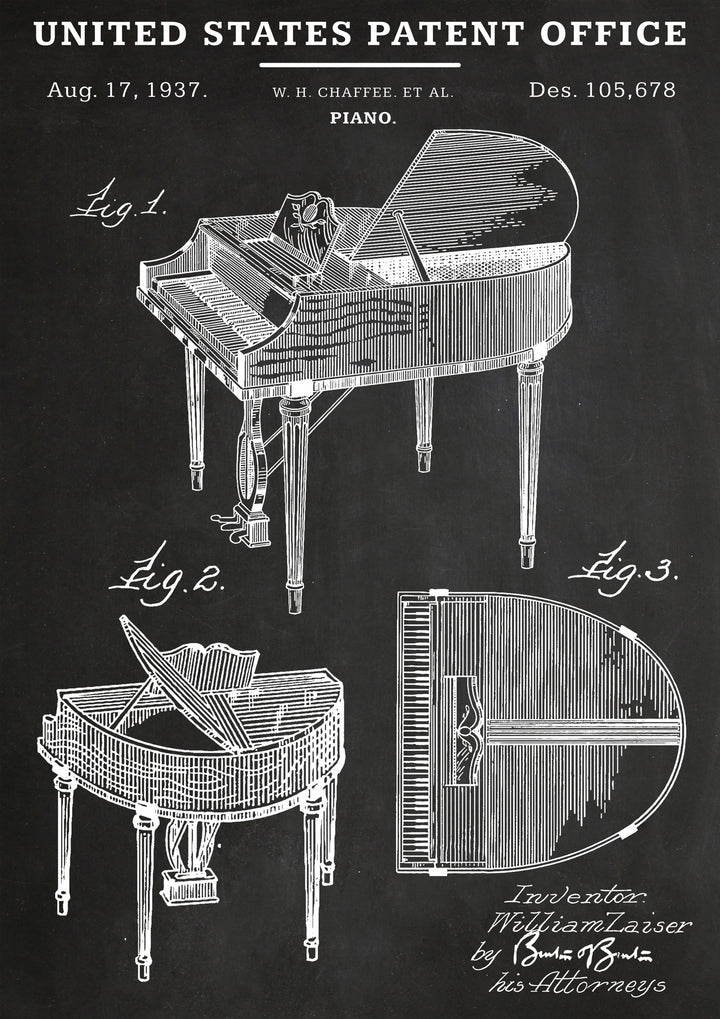 This vintage grand piano patent poster features detailed schematic drawings from the original 1937 United States Patent Office documents. Showcasing three technical illustrations of a classic grand piano, this artwork merges music and innovation. Ideal for music enthusiasts and vintage decor aficionados, the black-and-white line art style adds a timeless, educational touch to any space.