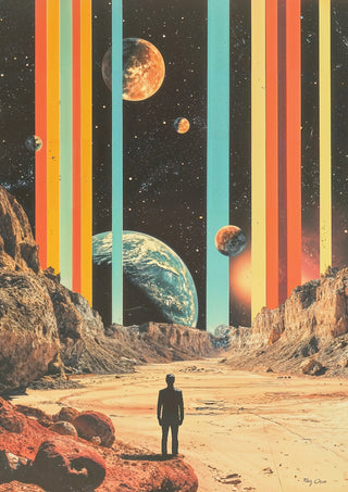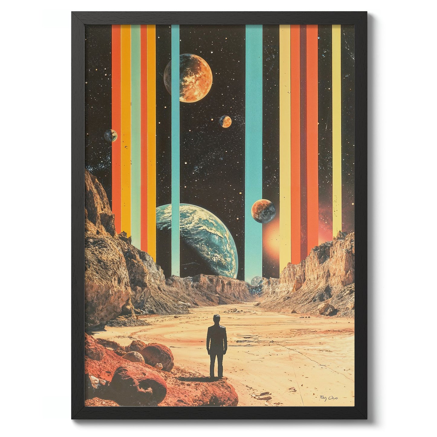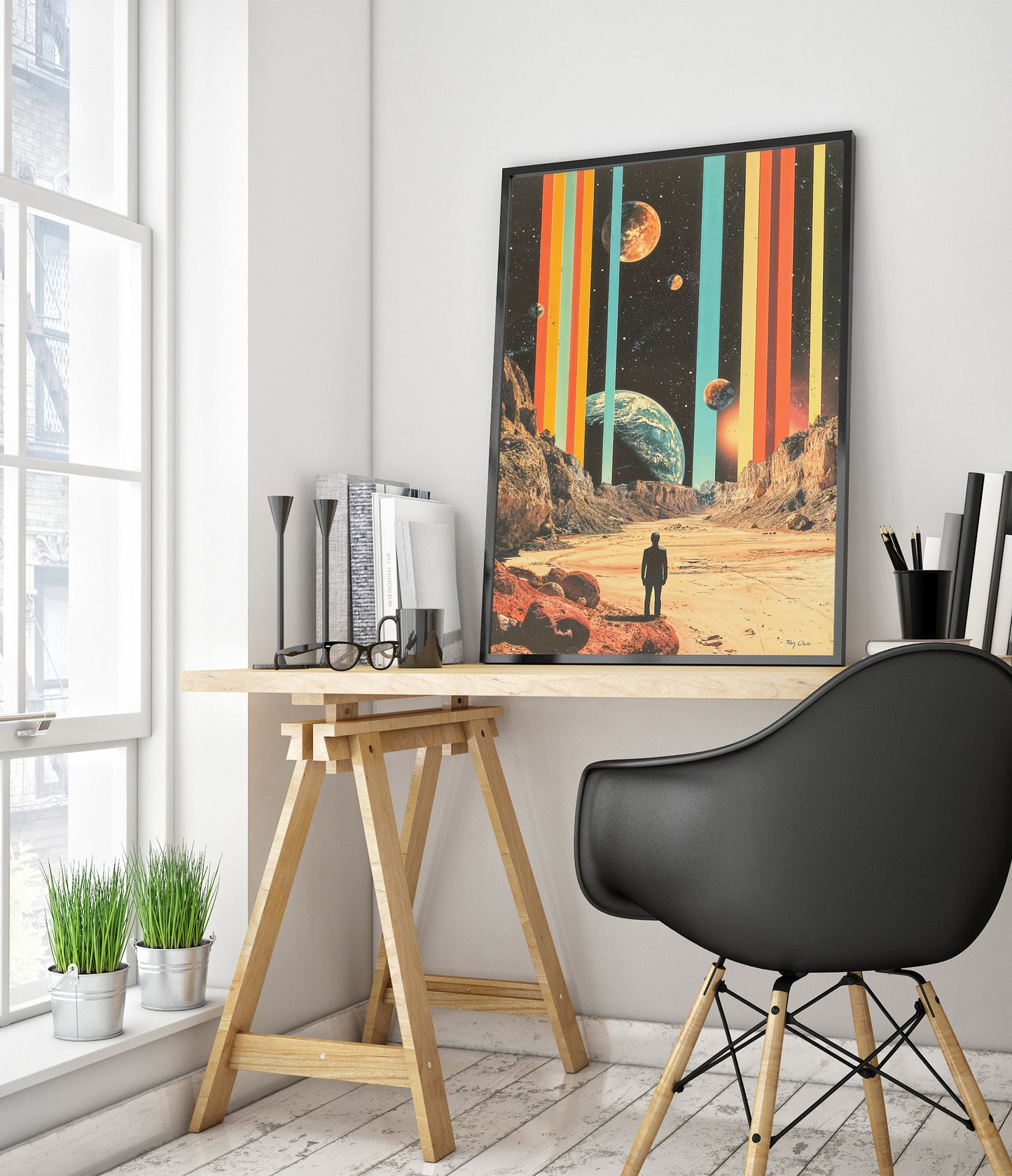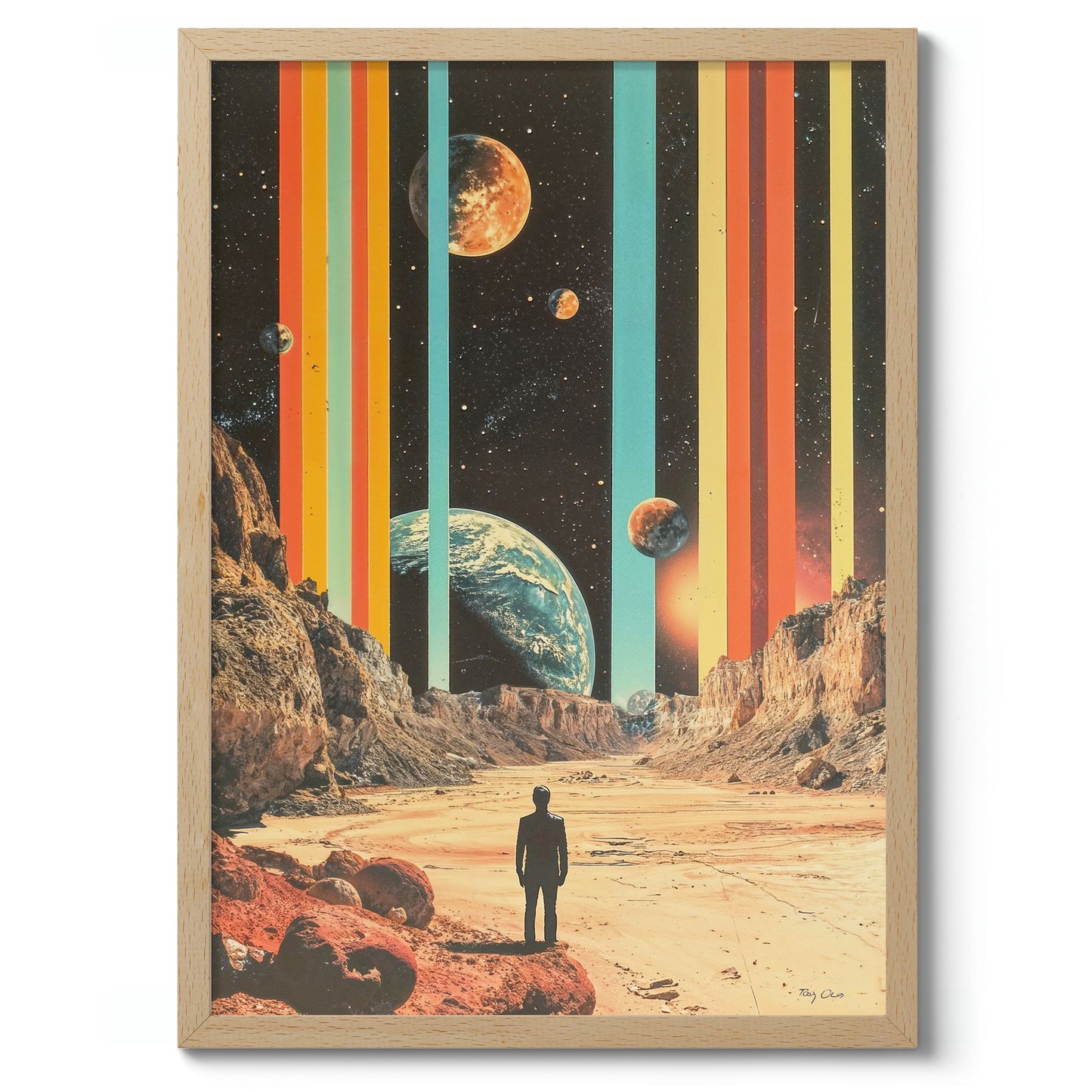 "Graphic Space Beams" poster features a surreal space scene with vibrant multicolored beams punctuating a cosmic landscape. A lone figure stands on a barren terrain, gazing at planets and moons suspended in a retro-futuristic sky. The artwork's sci-fi theme and modern graphic style create a visually striking and imaginative depiction of outer space.