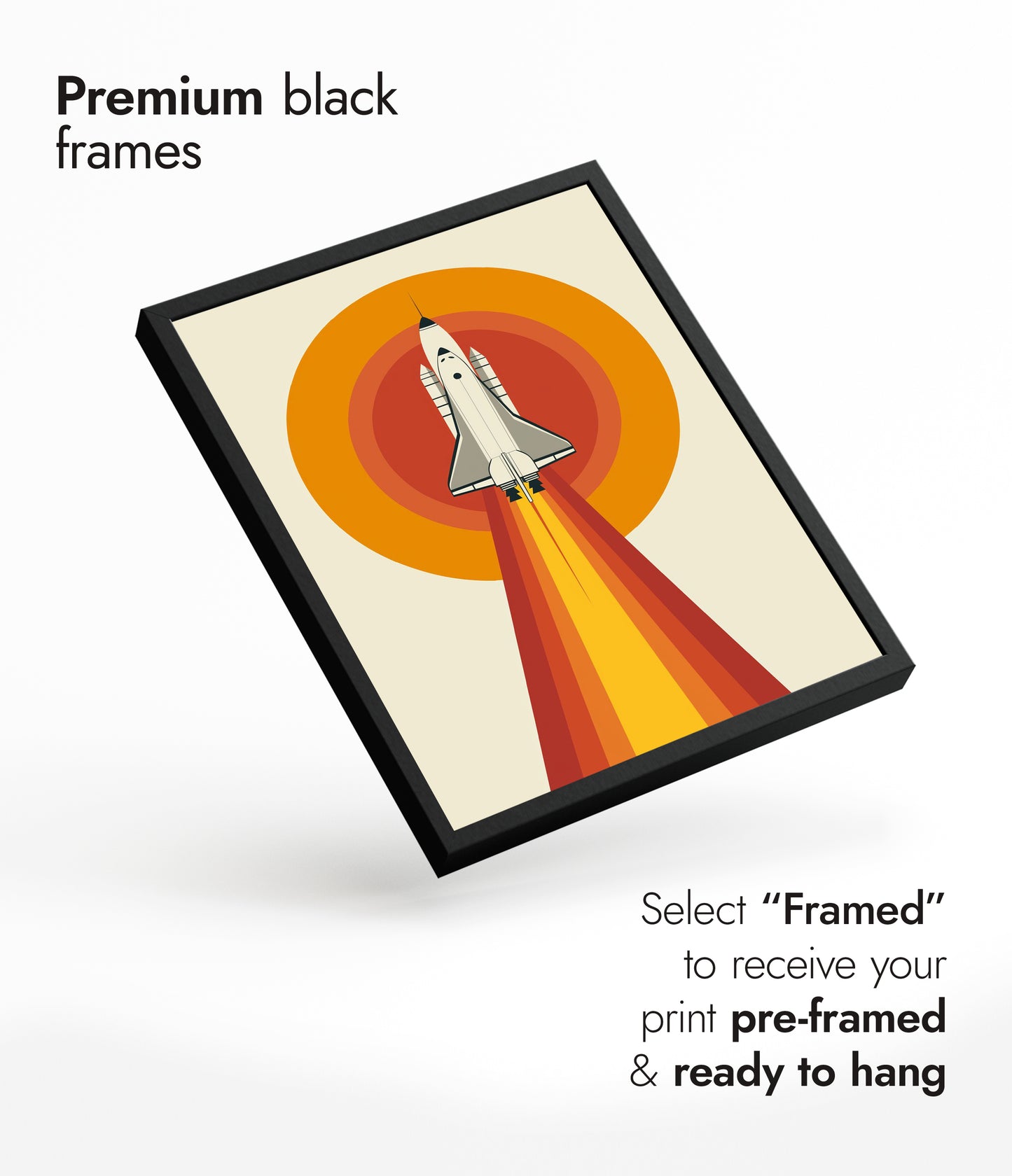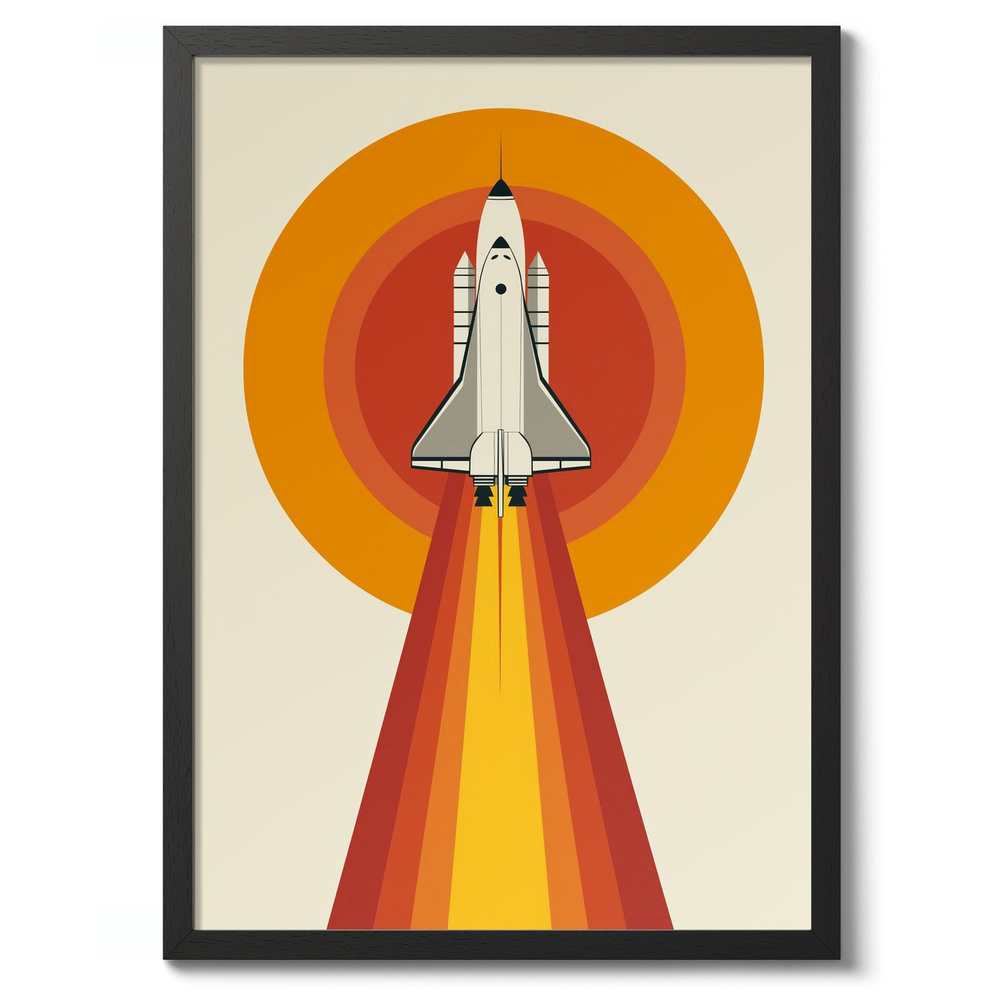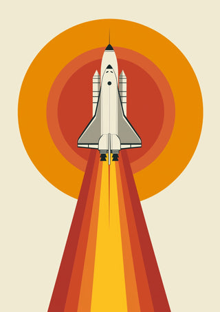 This modern graphic poster features a space shuttle launching into the sky, set against an orange, concentric sunburst backdrop. Bold geometric shapes in shades of orange, yellow, and red emphasize movement and energy, reflecting a dynamic and futuristic theme. The minimalist style makes it an eye-catching addition to any space or modern art collection.