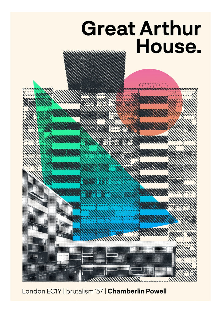 The "Great Arthur House" poster showcases the iconic Brutalist architecture of London's Chamberlin Powell. This modern portrait combines graphic elements with bold geometric shapes in vibrant colours, highlighting the architectural detail of the 1957 building. It's perfect for lovers of mid-century modern and retro design, emphasizing the striking features of this renowned London landmark.