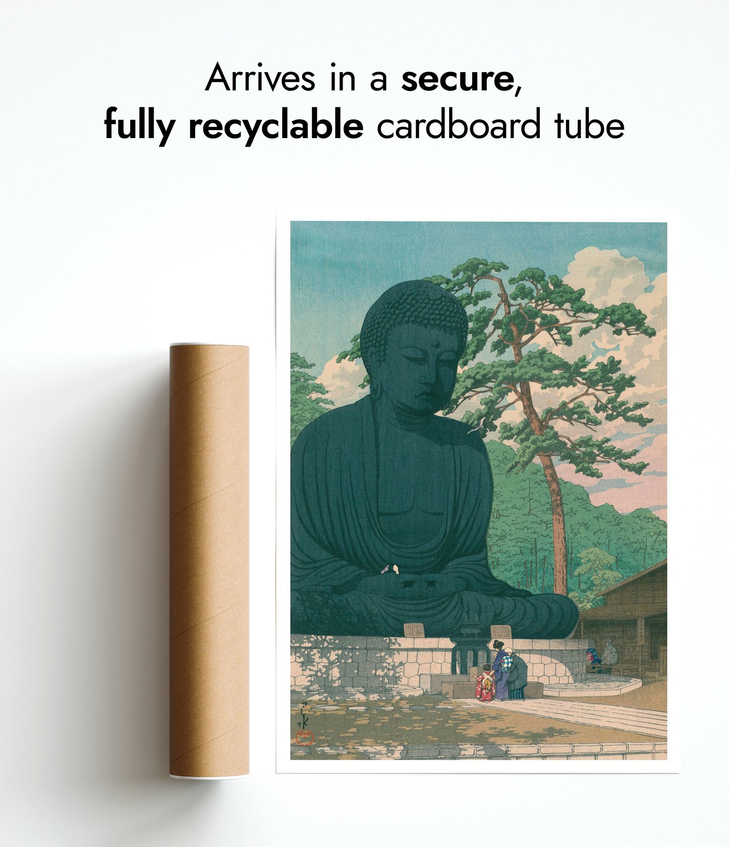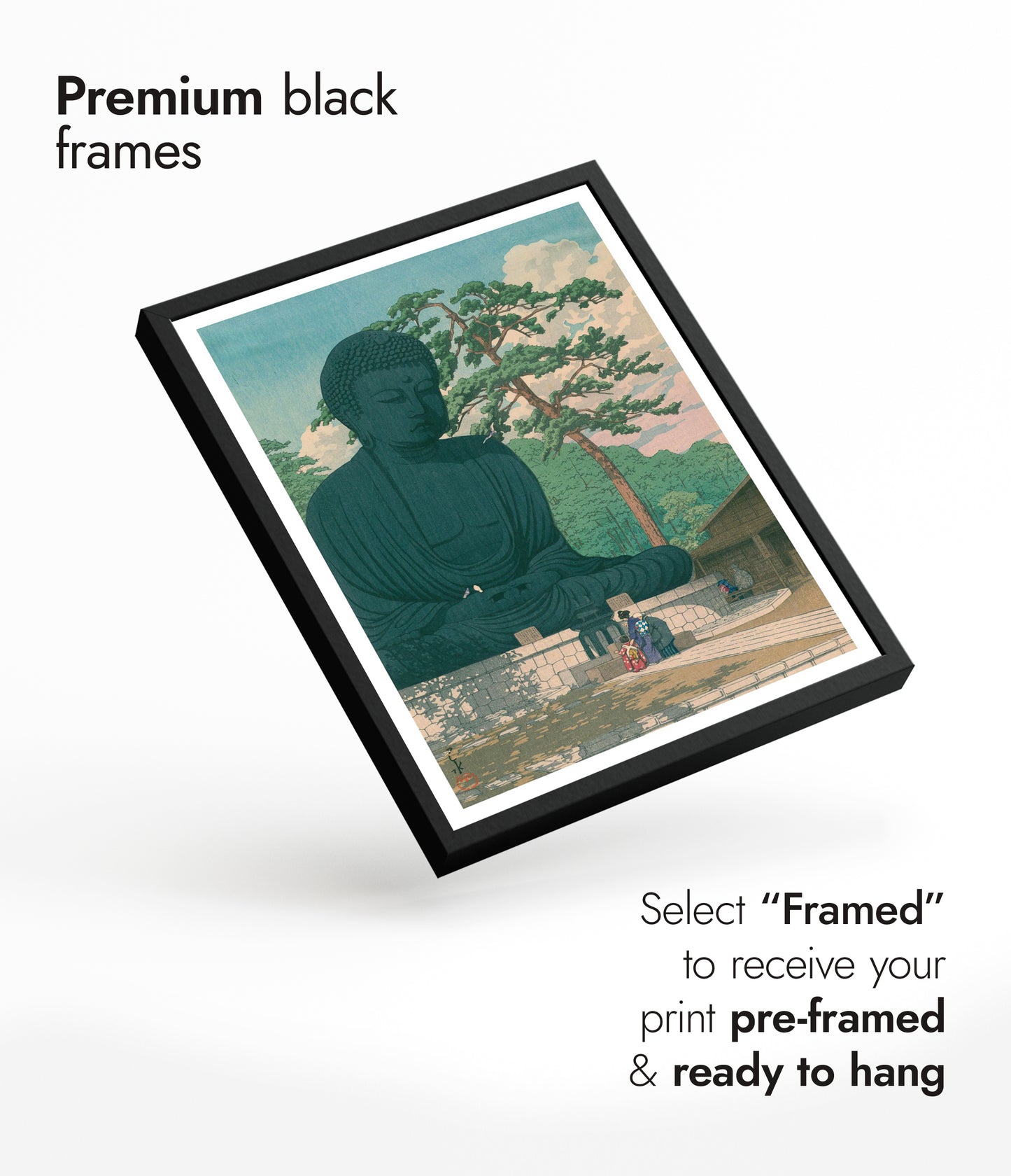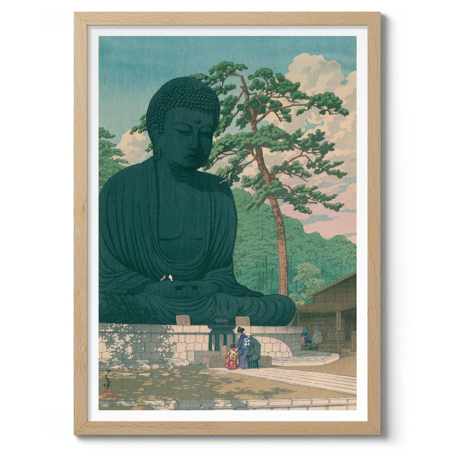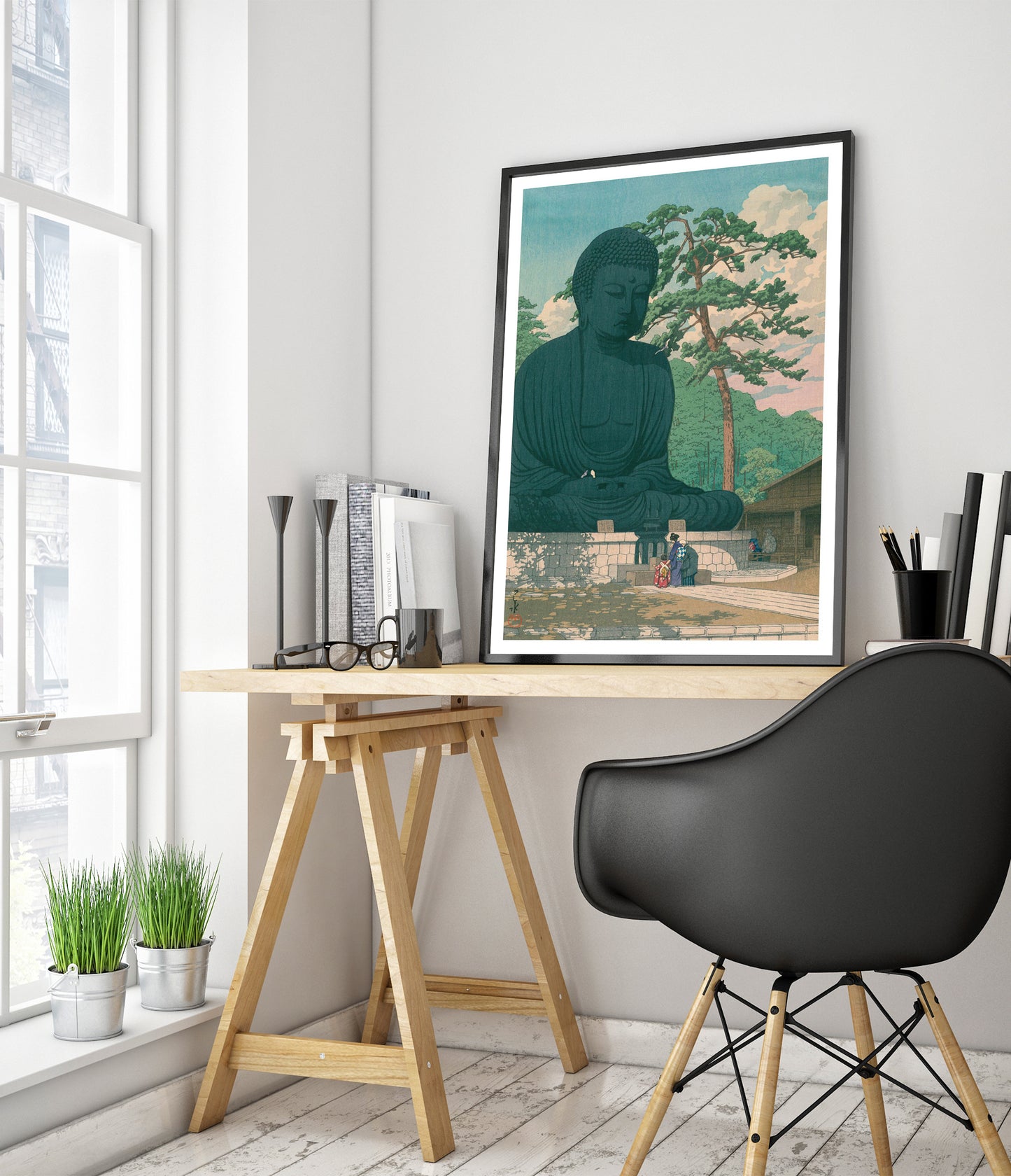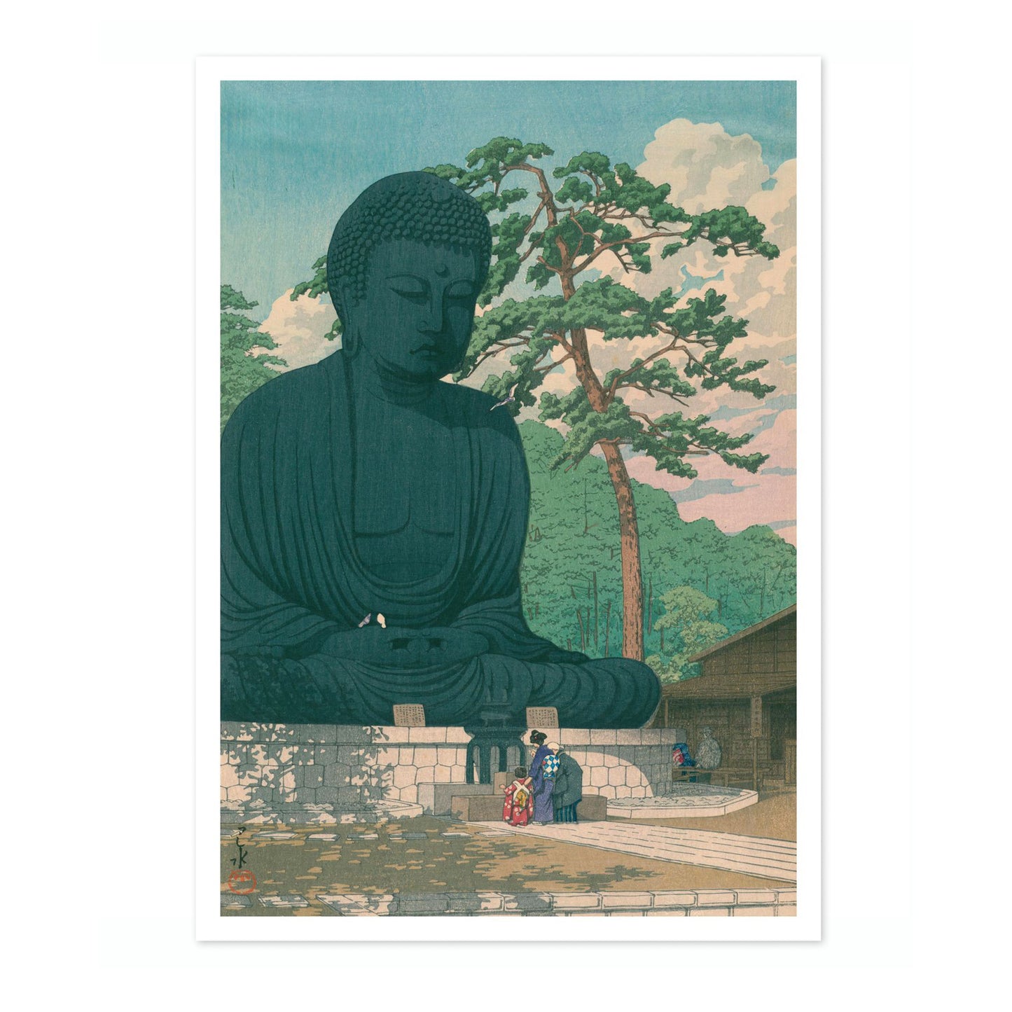 This traditional woodblock poster by Kawase Hasui depicts the Great Buddha at Kamakura, enveloped by lush trees and tranquil surroundings. The serene Buddha statue stands prominently against a backdrop of towering pines and soft clouds, harmonizing nature and spirituality. The artwork's subtle green hues create a soothing atmosphere, making it a captivating homage to Japanese heritage and craftsmanship.