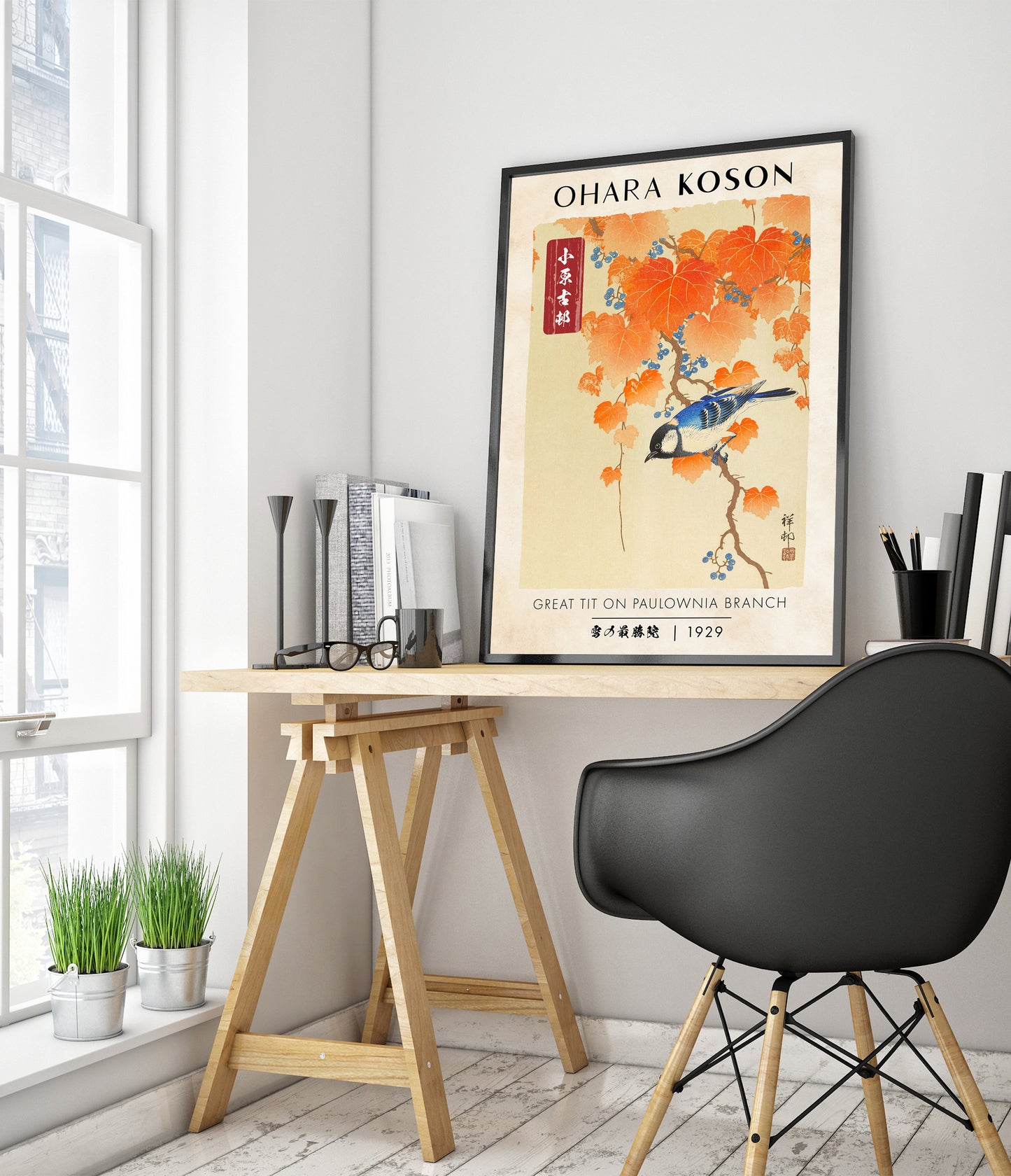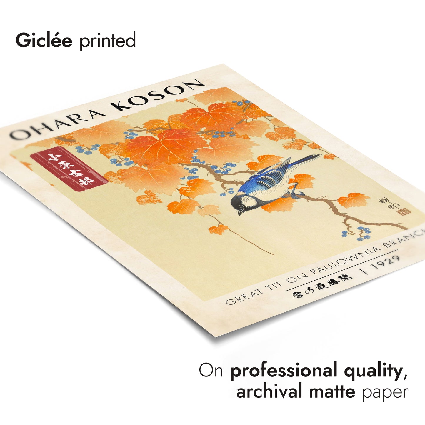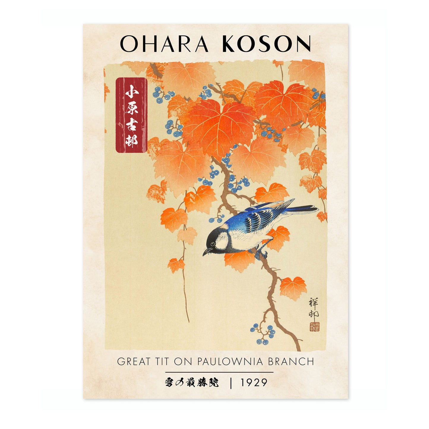 This exquisite art print poster by Ohara Koson depicts a Great Tit perched on a paulownia branch. The vibrant oranges of the leaves contrast with the detailed blue plumage of the bird, capturing the essence of traditional Japanese woodblock print art. The piece showcases the harmony between nature's intricate beauty and classic illustration techniques, perfect for those who appreciate ukiyo-e art.