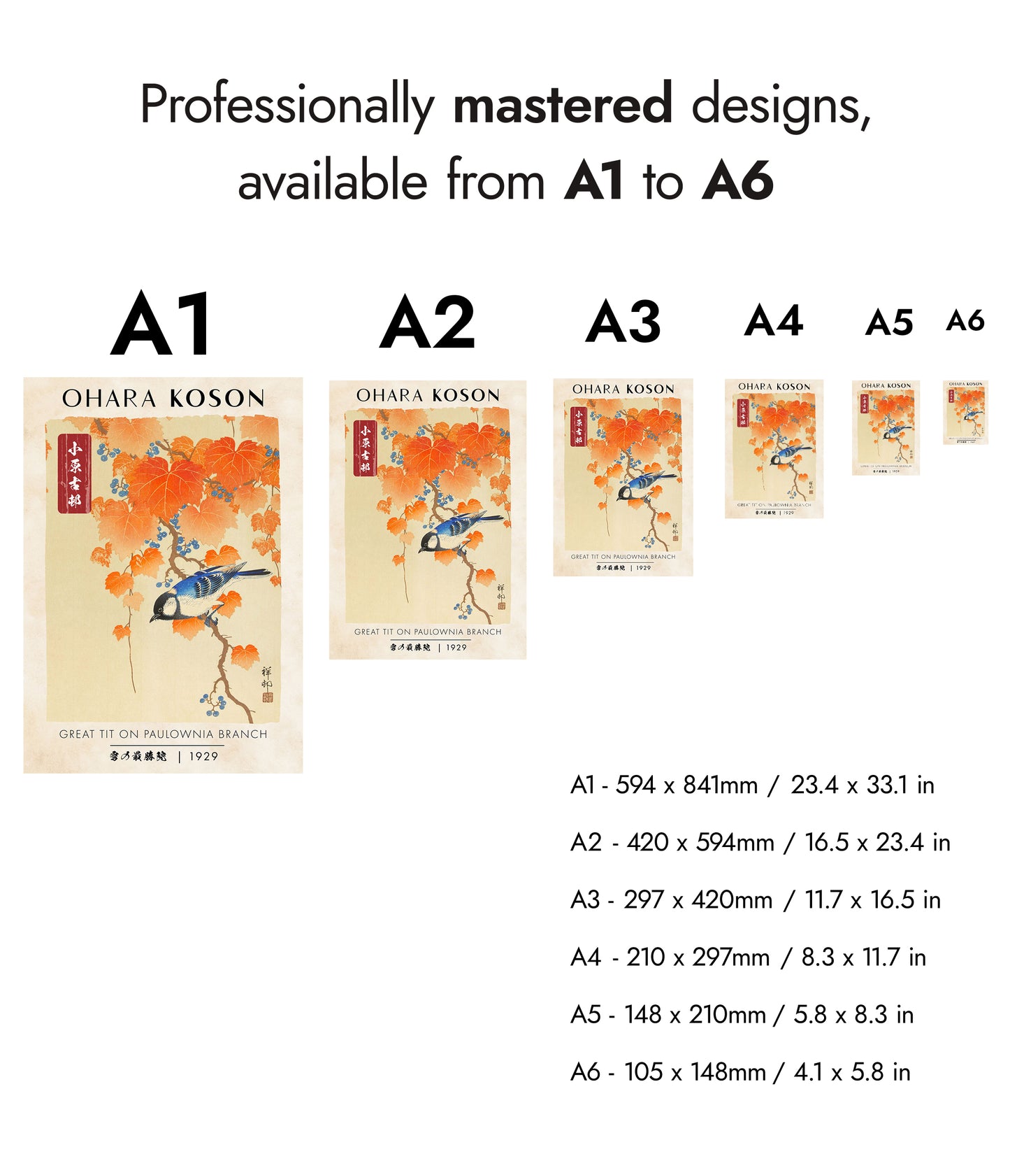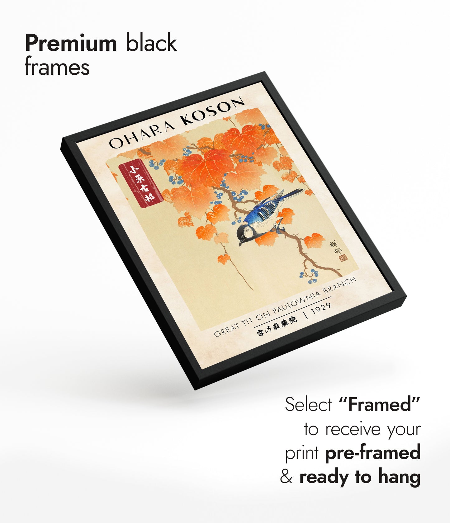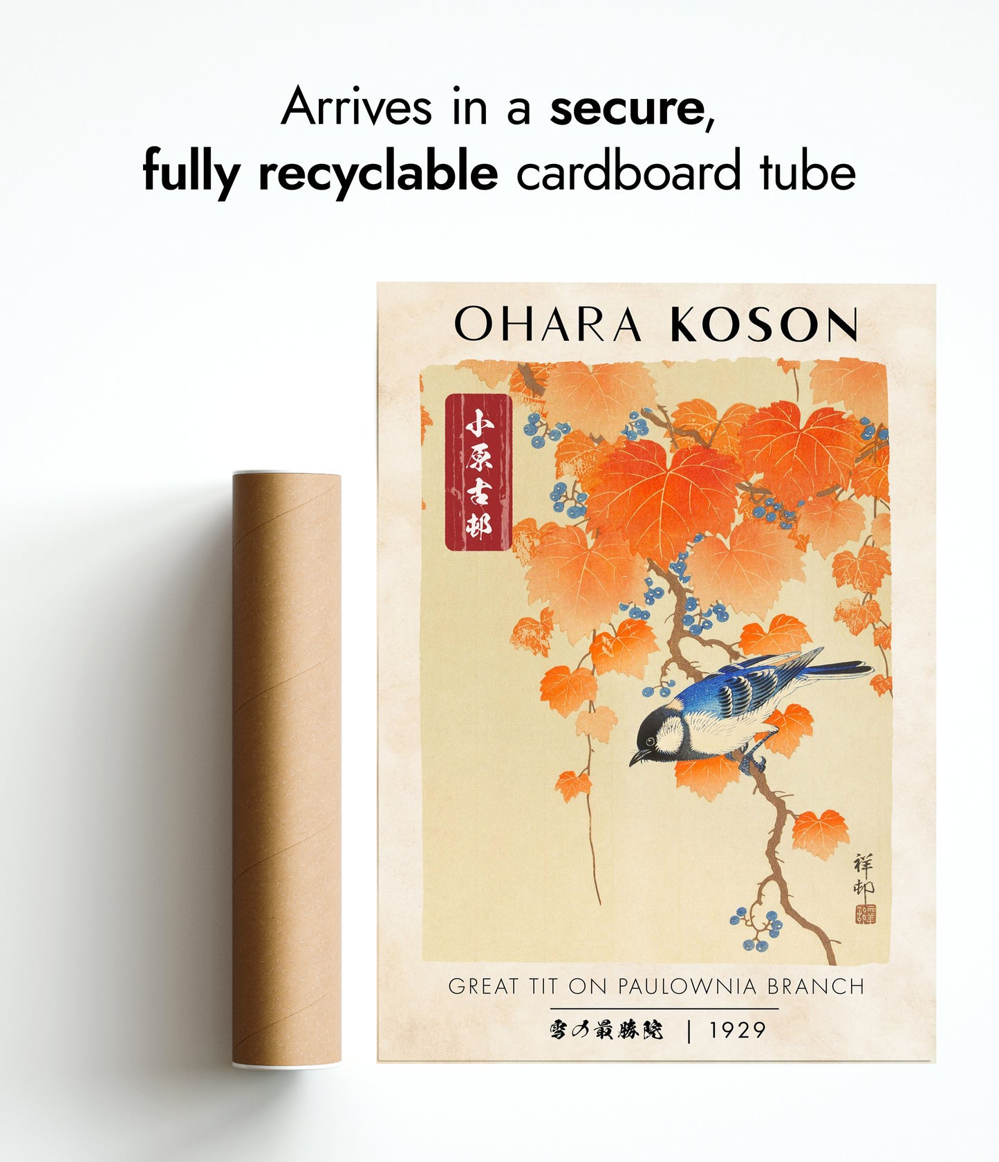 This exquisite art print poster by Ohara Koson depicts a Great Tit perched on a paulownia branch. The vibrant oranges of the leaves contrast with the detailed blue plumage of the bird, capturing the essence of traditional Japanese woodblock print art. The piece showcases the harmony between nature's intricate beauty and classic illustration techniques, perfect for those who appreciate ukiyo-e art.