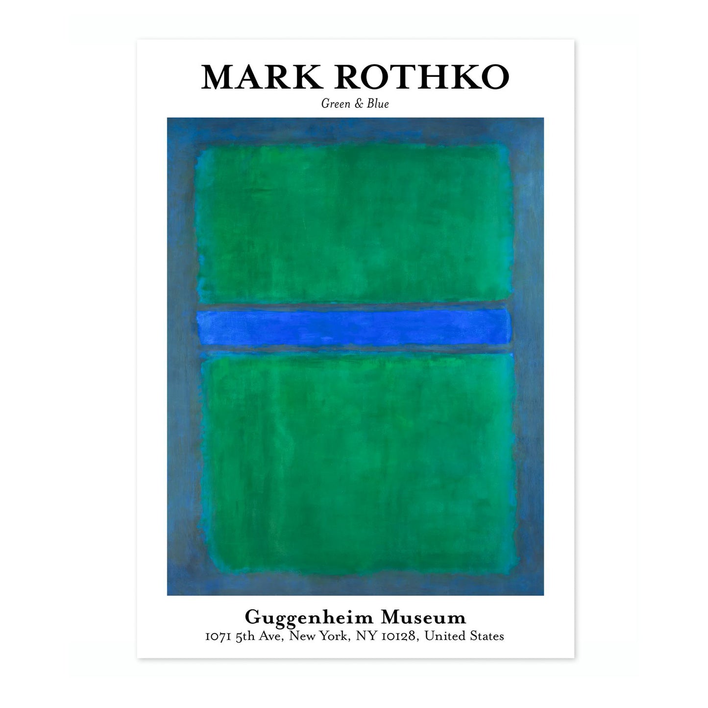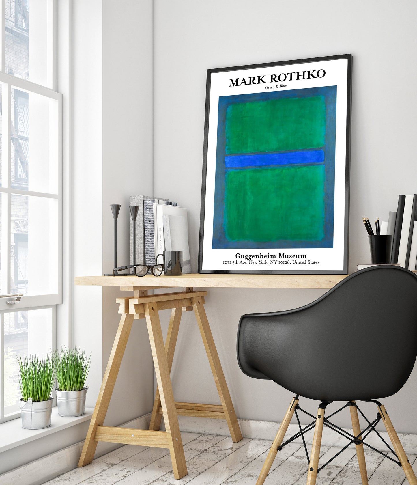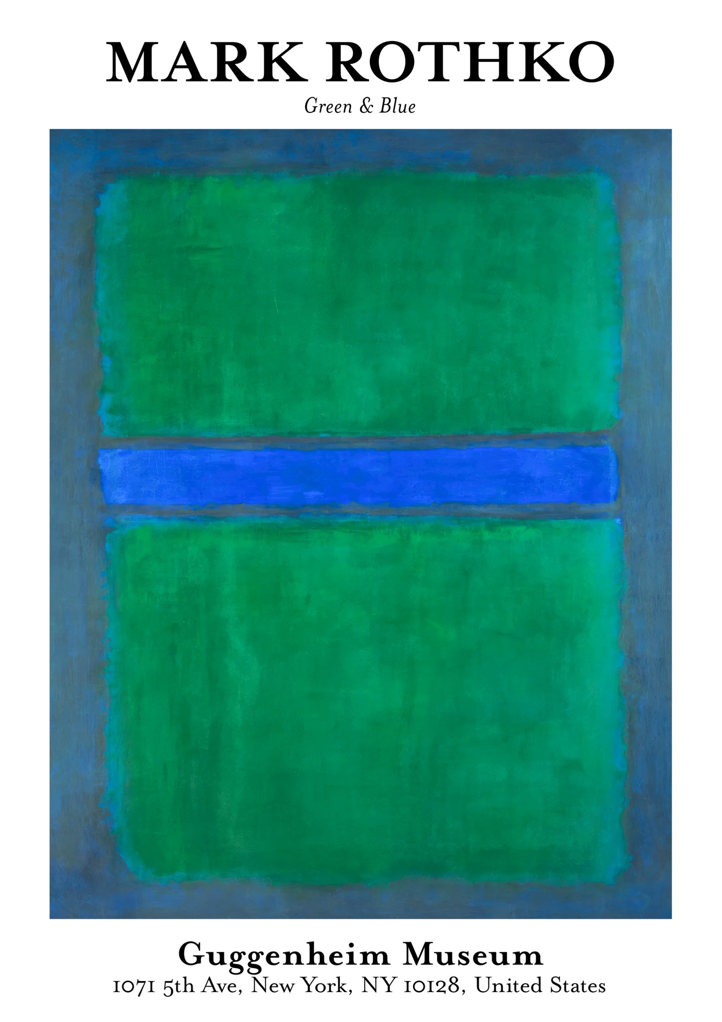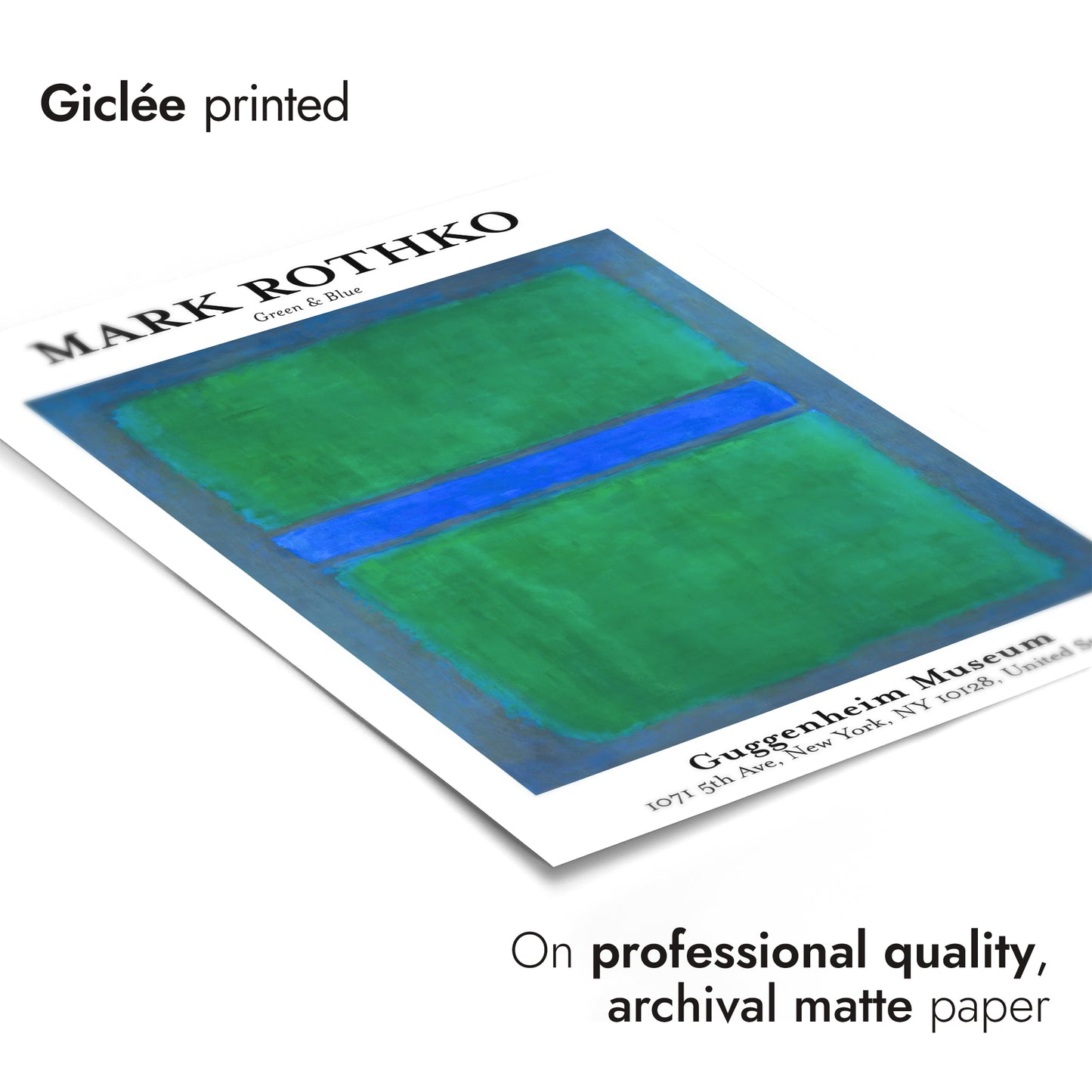 This Mark Rothko poster, titled "Green & Blue," features a striking minimalist composition of large green fields and a bold blue stripe. Emphasizing abstract expressionism, the artwork's contrasting colors create a profound visual impact. Ideal for those seeking a mid-century aesthetic, this print encapsulates Rothko's exploration of color and form. Perfect for enhancing contemporary spaces with timeless abstract art.