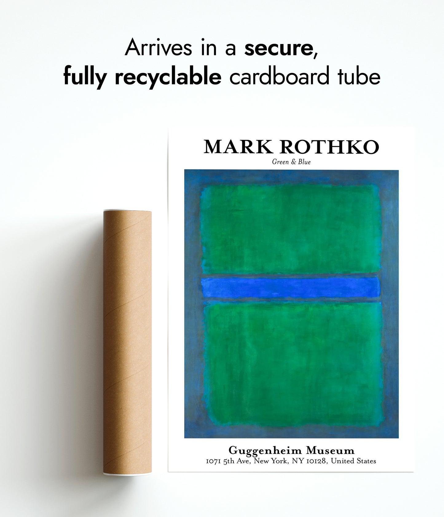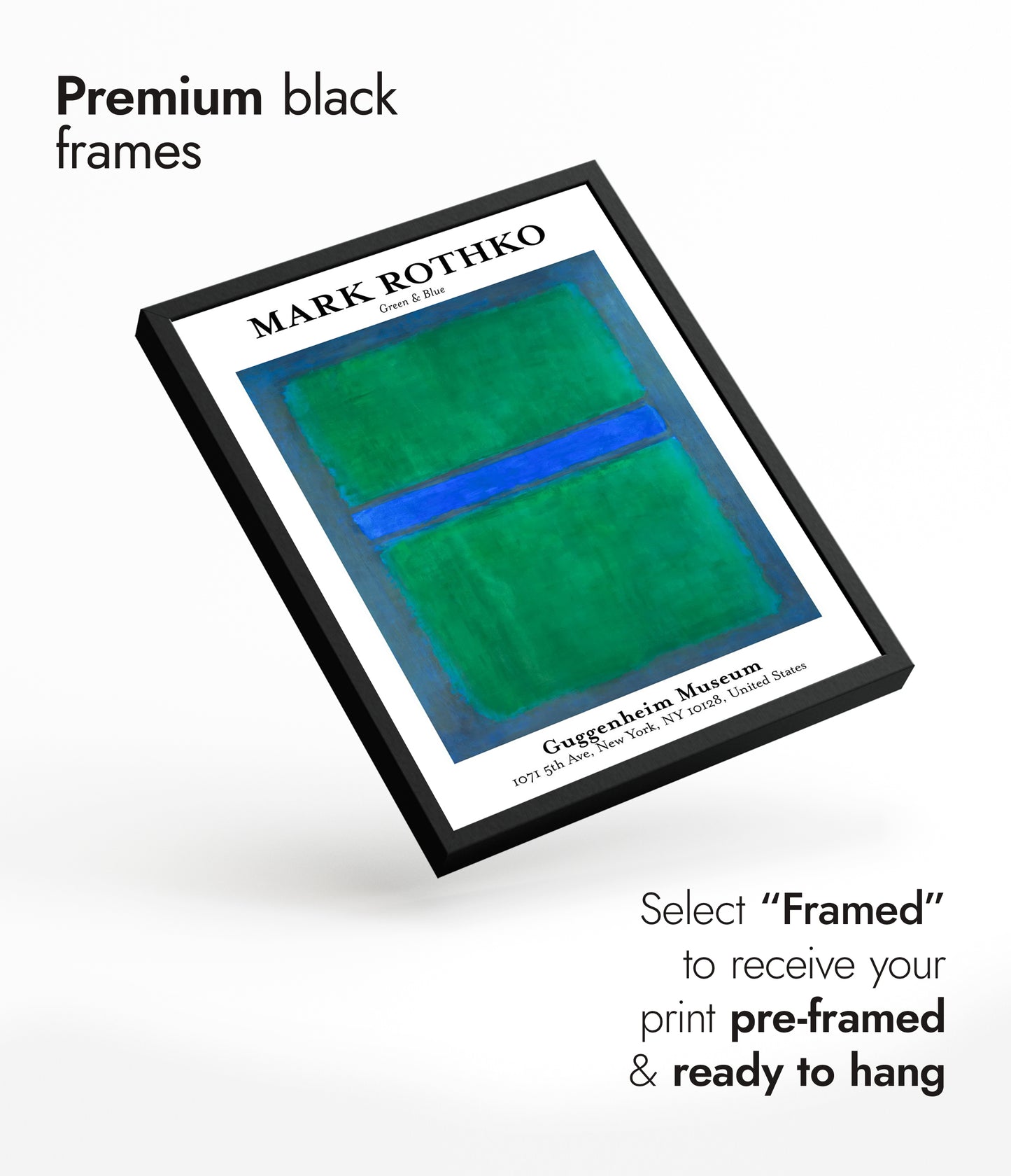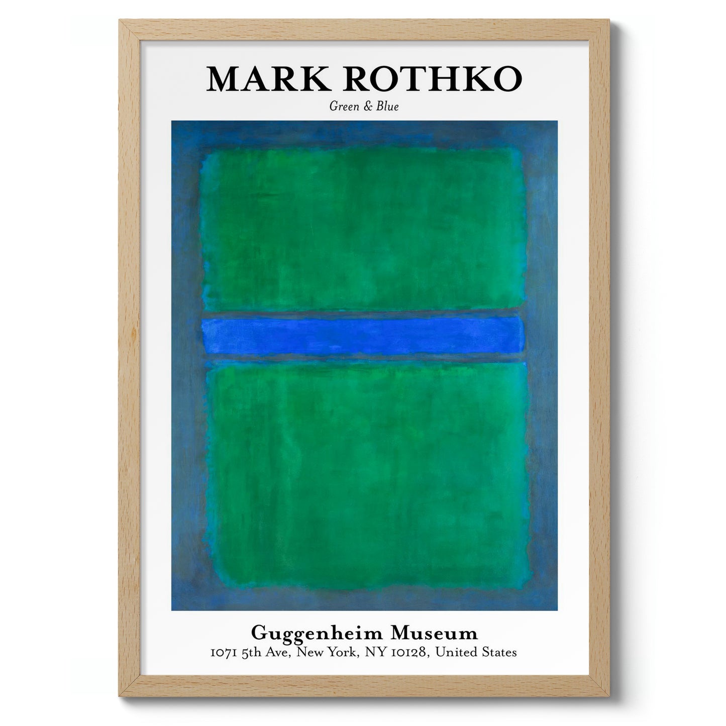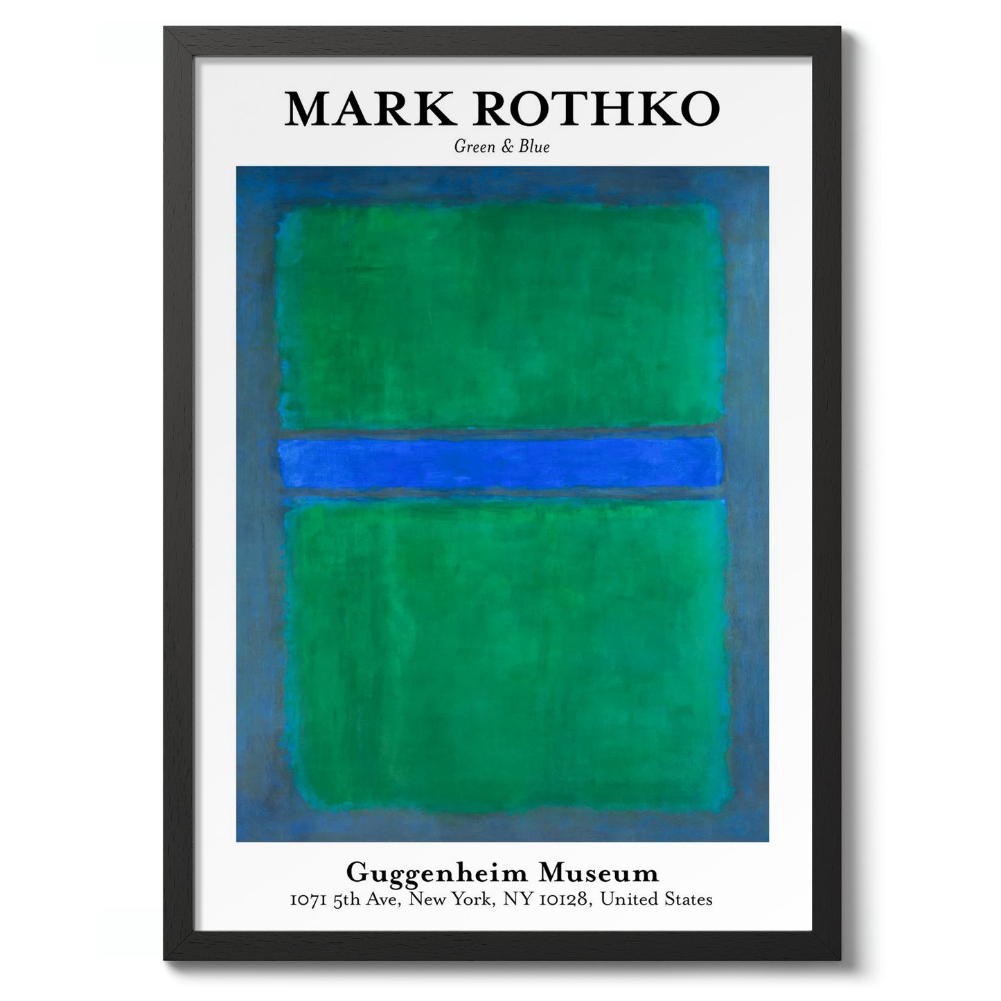This Mark Rothko poster, titled "Green & Blue," features a striking minimalist composition of large green fields and a bold blue stripe. Emphasizing abstract expressionism, the artwork's contrasting colors create a profound visual impact. Ideal for those seeking a mid-century aesthetic, this print encapsulates Rothko's exploration of color and form. Perfect for enhancing contemporary spaces with timeless abstract art.